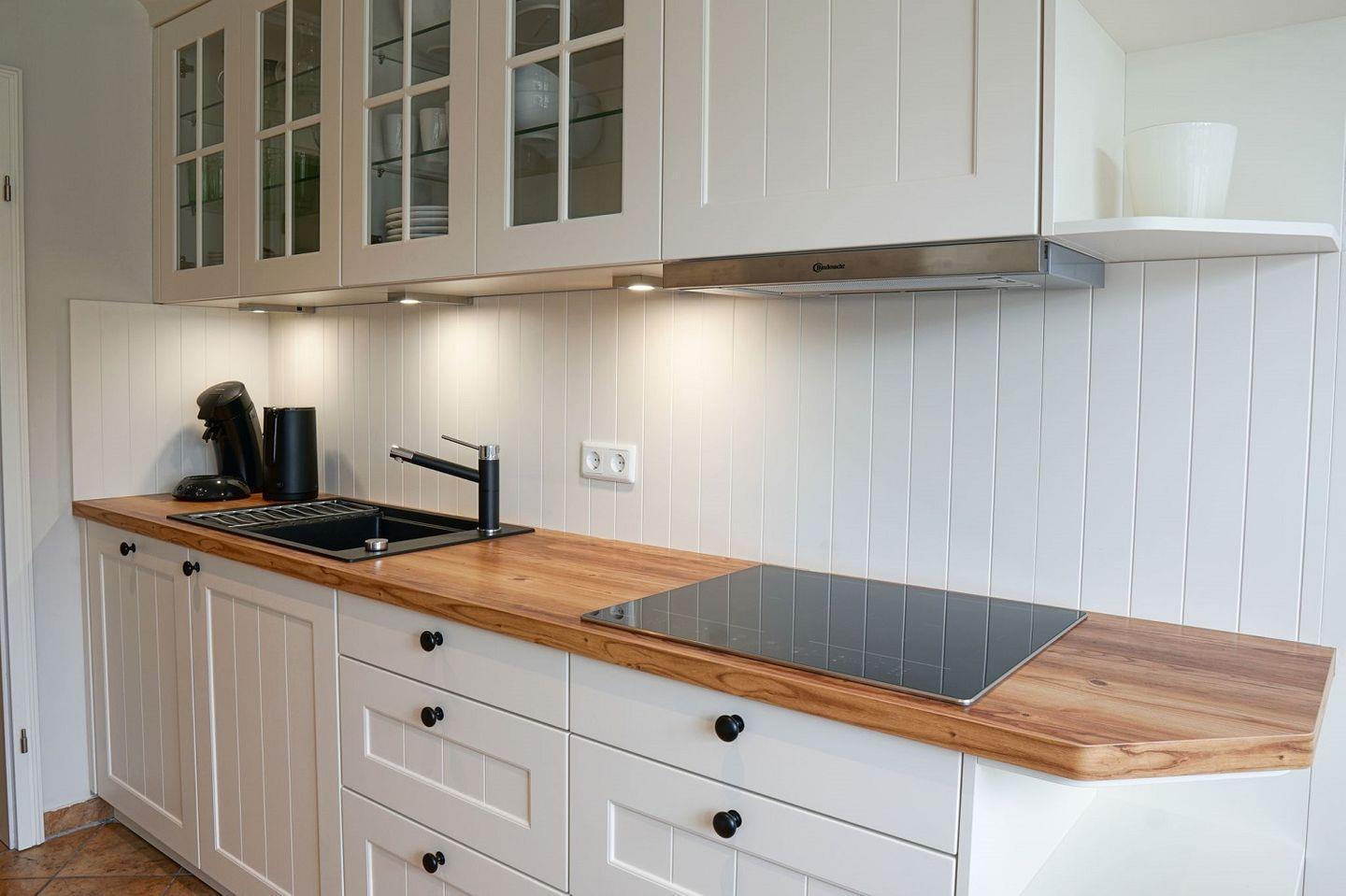 Küche mit Essbereich für 4 Personen, Geschirrspülmaschine, Backofen, Kühl-Gefrierkombination, Induktionskochfeld, Filterkaffee- und Pad- Maschine, Hochstuhl vorhanden.