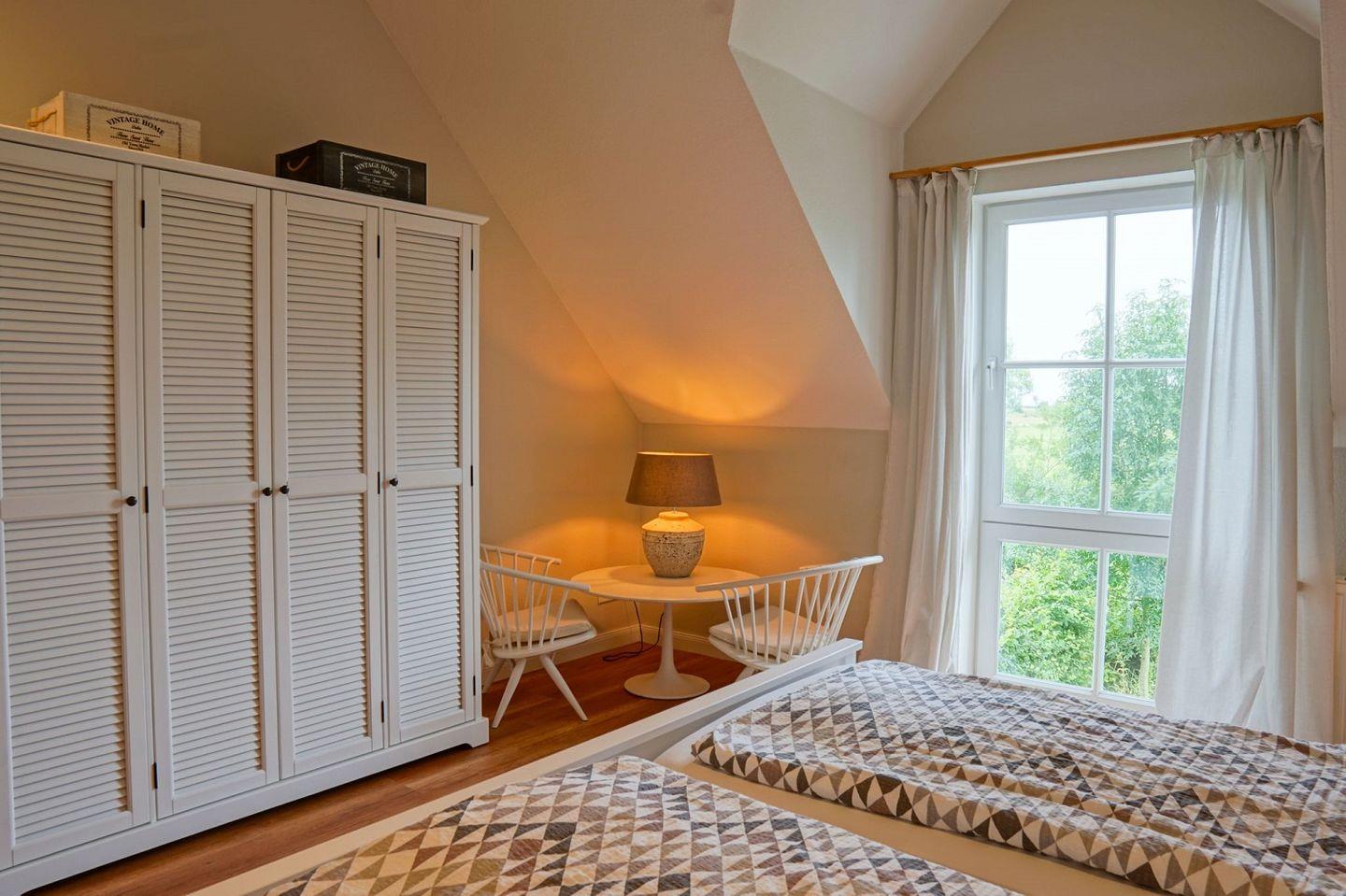 Die Fenster in den Schlafzimmern sind mit Fliegengittern und Vorhängen ausgestattet.