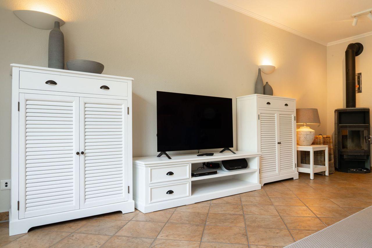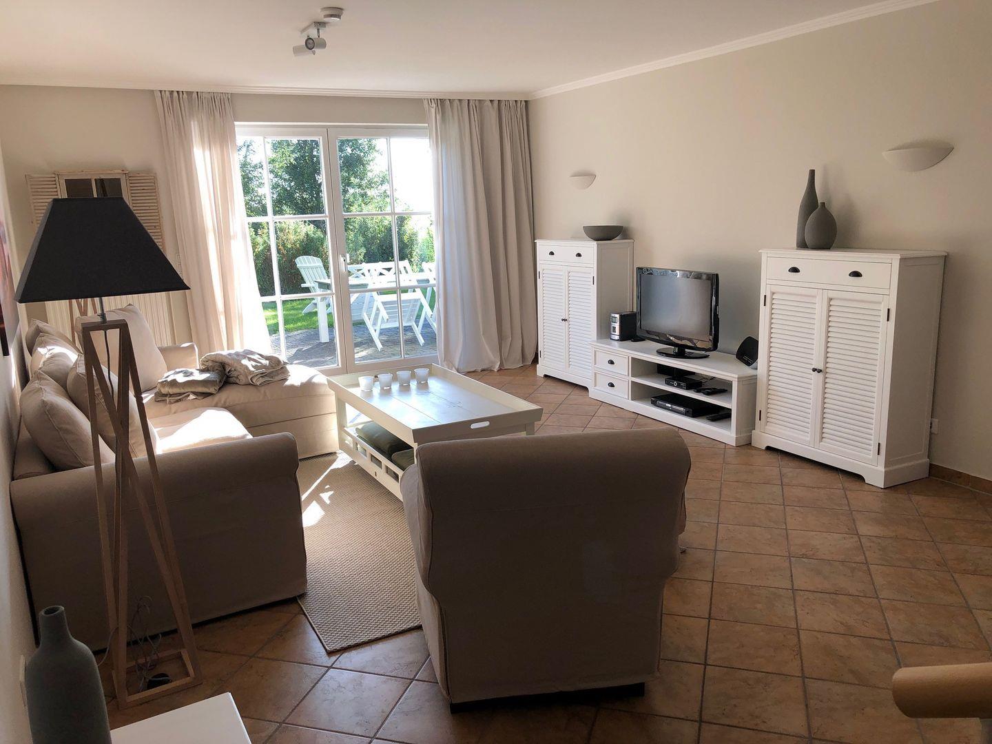 Erdgeschoss: Großer Wohnraum mit Flachbildschirm, Blue-Ray-/DVD-Player und Kamin, Ausgang Terrasse.