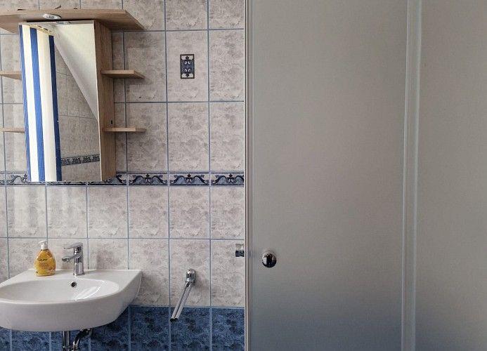 Das Badezimmer des Ferienhauses ist sowohl funktional als auch komfortabel gestaltet. Es verfügt über eine Dusche, eine Badewanne und ein WC, alle ausgestattet mit Wasserspardüsen, die umweltbewusstes Verhalten fördern und gleichzeitig vollen Komfort bieten. Hier können Sie nach einem langen Tag entspannen und neue Energie tanken.