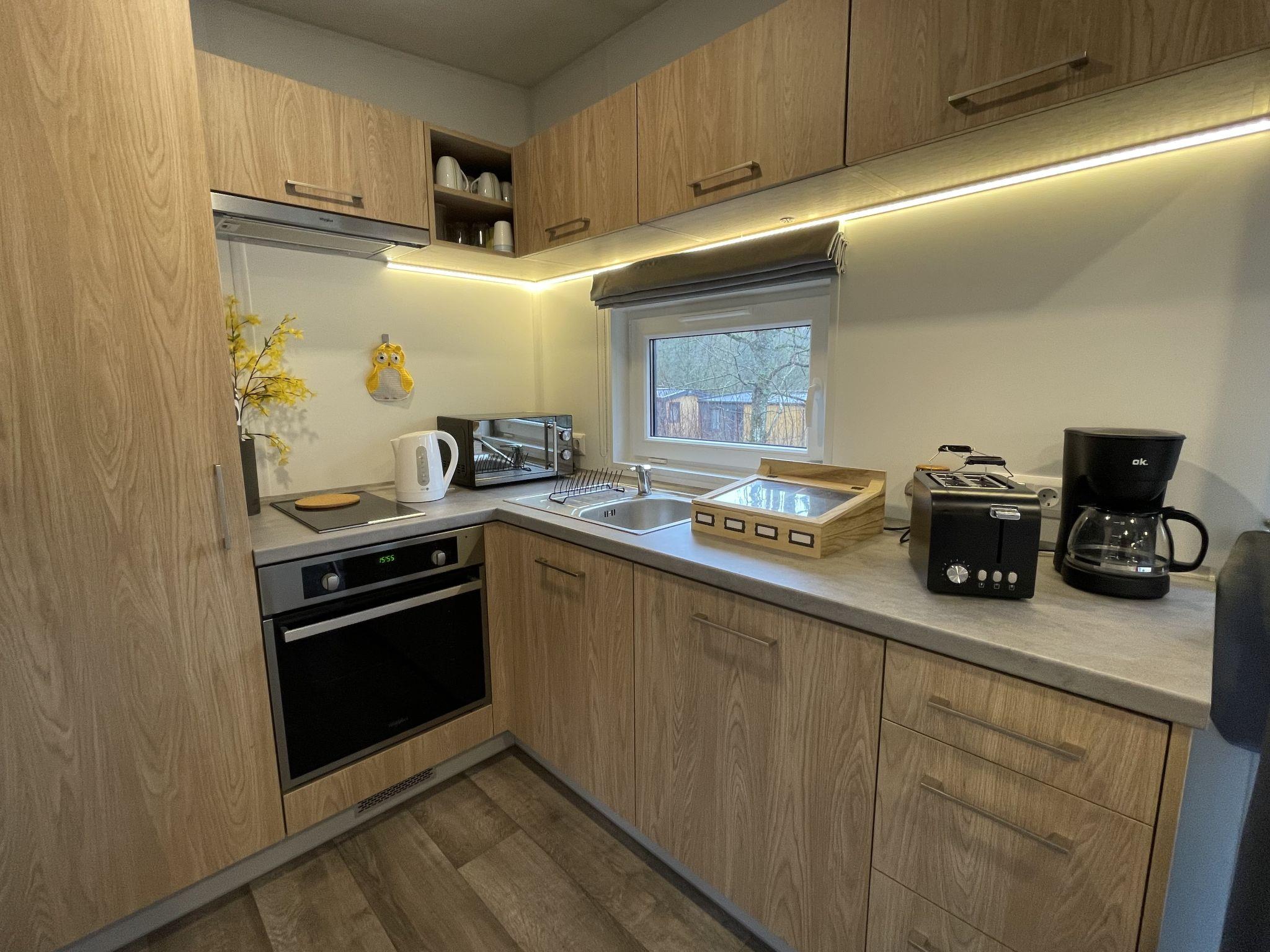 "Tiny Haus Eulenheim", 2-room mobile home 25 m2. Object suitable for 2 adults + 2 children. Cosy furnishings: living/sleeping room with 1 double sofabed and satellite TV. Exit to the terrace. 1 room with 1 french bed (140 cm, length 200 cm). Open kitchen (oven, 2 induction hot plates, toaster, kettle, microwave, electric coffee machine). Shower/WC. Electric heating, air-conditioning. Terrace. Terrace furniture. Please note: non-smoking house. Maximum 2 pets/ dogs allowed. Smoke alarm. Uwaga: Internet WLAN polaczenie moze byc ograniczone w zaleznosci od przepustowosci lacza.