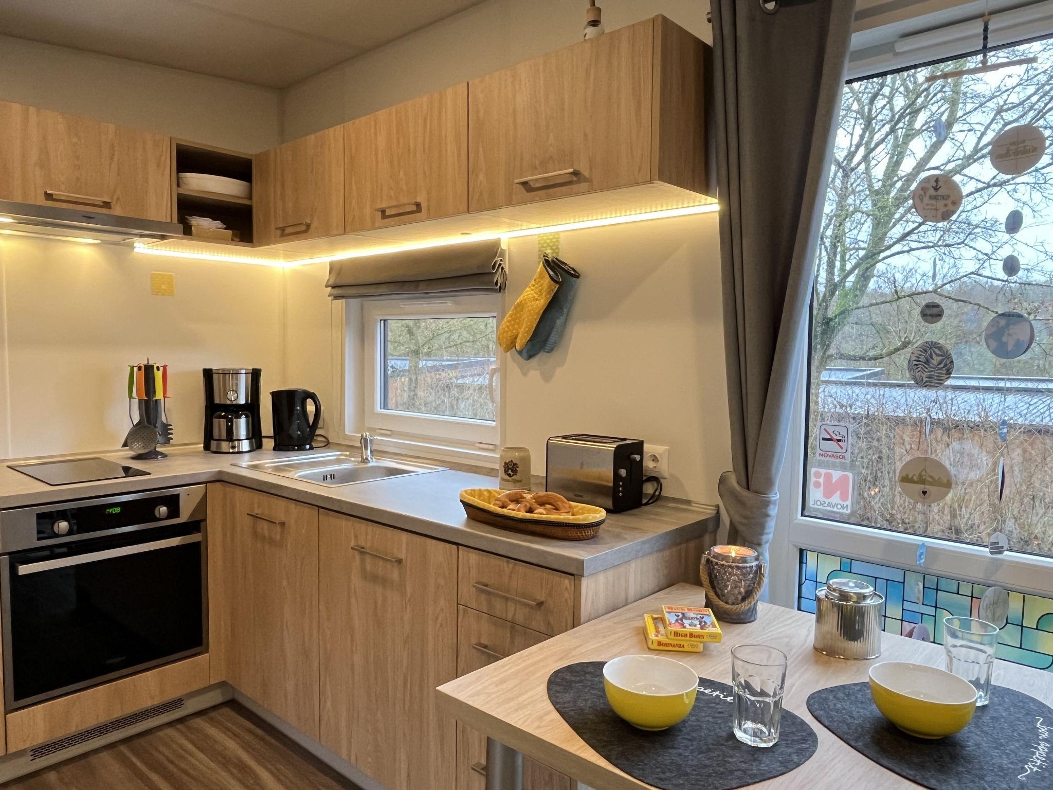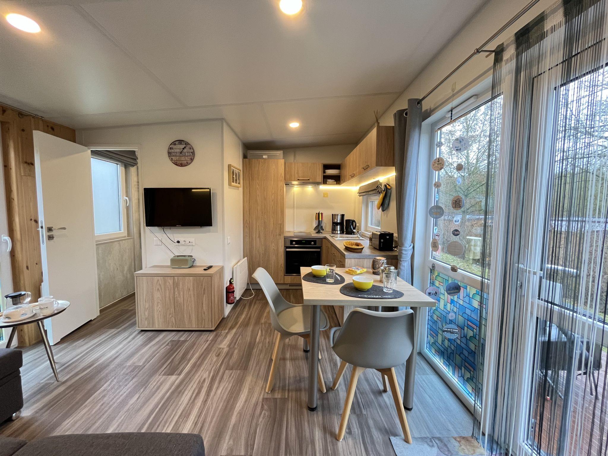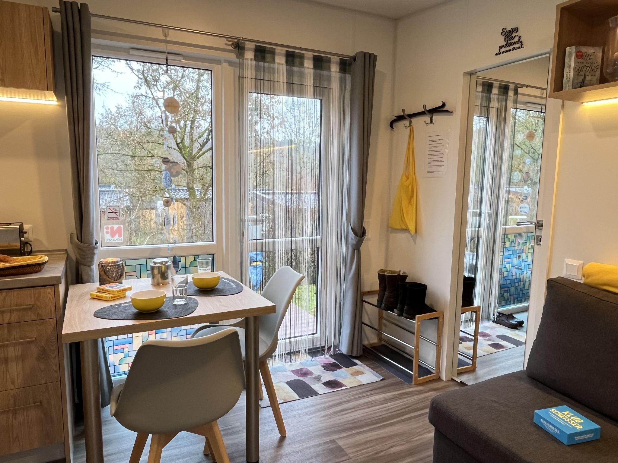 "Tiny Haus Karin", 2-room mobile home 25 m2. Object suitable for 2 adults + 2 children. Cosy furnishings: living/sleeping room with 1 double sofabed, dining table and satellite TV (flat screen). Exit to the terrace. 1 room with 1 french bed (140 cm, length 200 cm). Kitchenette (oven, 2 induction hot plates, toaster, kettle, electric coffee machine). Shower/WC. Electric heating, air-conditioning. Terrace. Terrace furniture. Facilities: Internet (WiFi, free). Parking (1 car) at 10 m. Please note: non-smokers only. ATTENTION: The Wi-Fi connection may be limited depending on capacity.