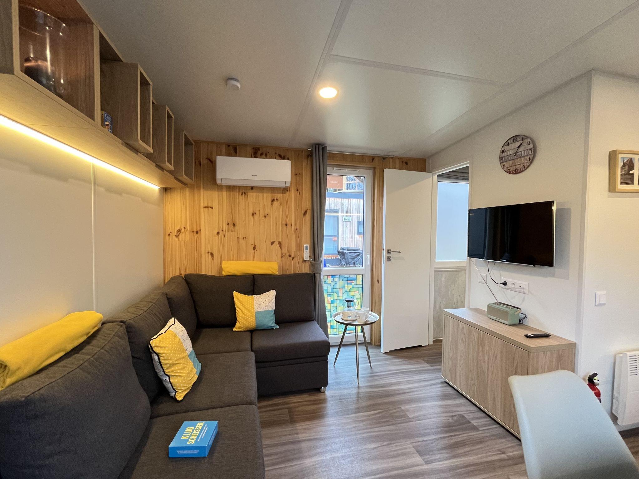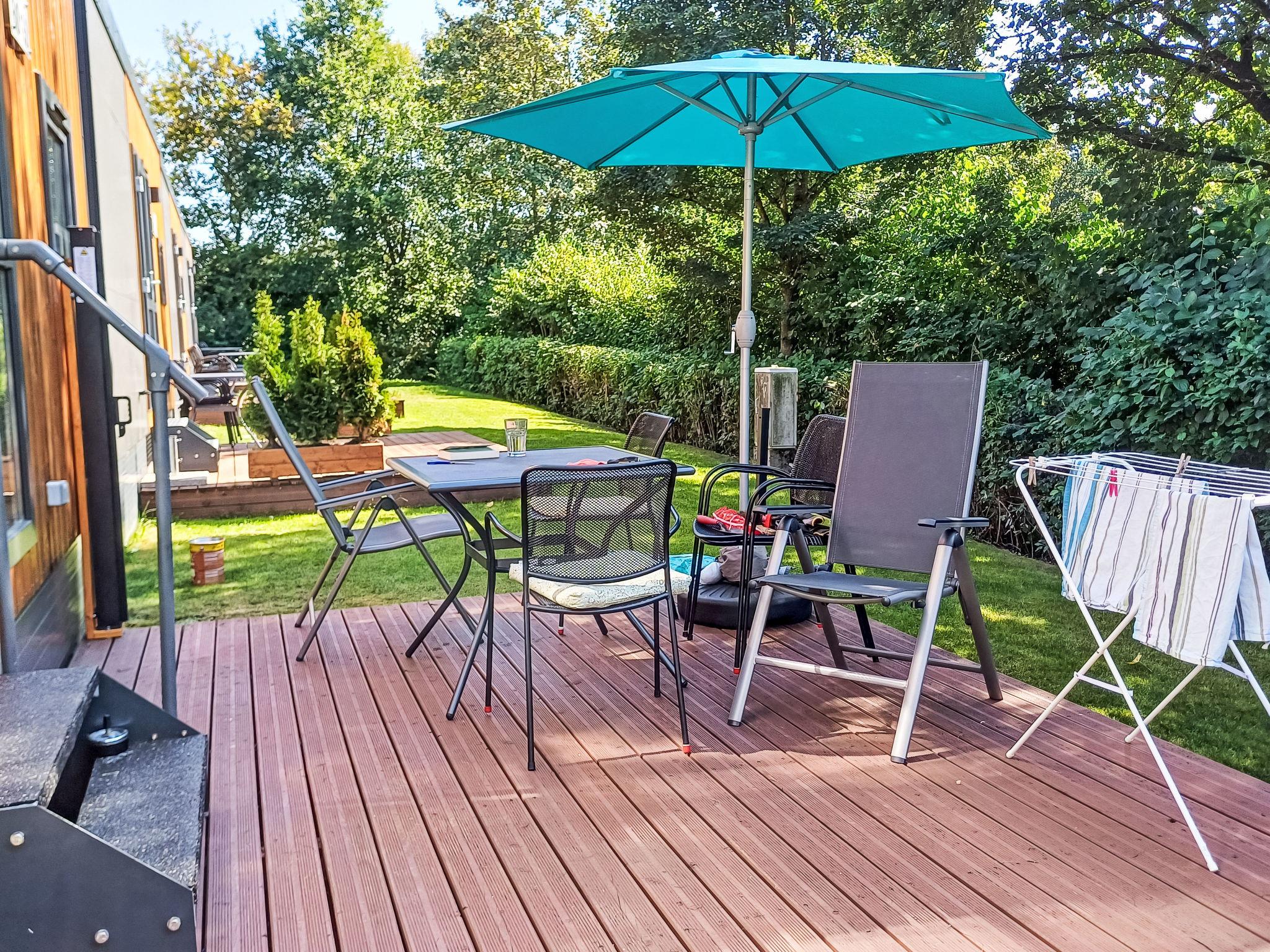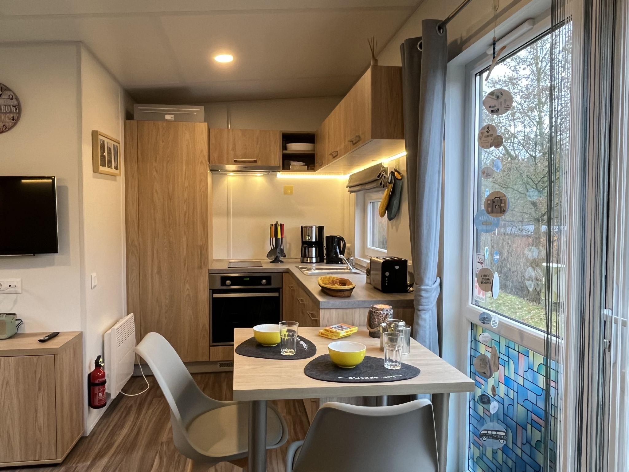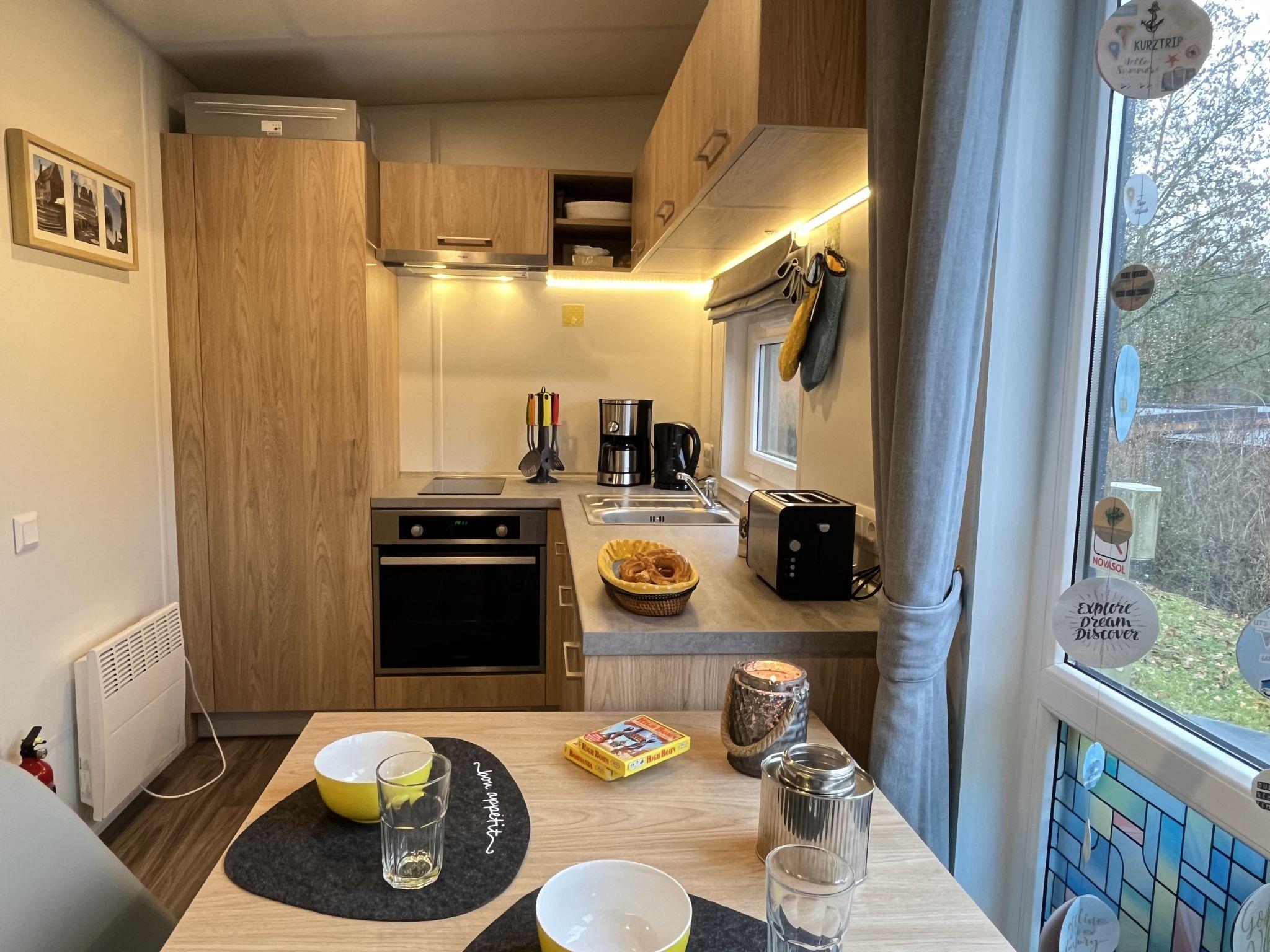"Tiny Haus Karin", 2-room mobile home 25 m2. Object suitable for 2 adults + 2 children. Cosy furnishings: living/sleeping room with 1 double sofabed, dining table and satellite TV (flat screen). Exit to the terrace. 1 room with 1 french bed (140 cm, length 200 cm). Kitchenette (oven, 2 induction hot plates, toaster, kettle, electric coffee machine). Shower/WC. Electric heating, air-conditioning. Terrace. Terrace furniture. Facilities: Internet (WiFi, free). Parking (1 car) at 10 m. Please note: non-smokers only. ATTENTION: The Wi-Fi connection may be limited depending on capacity.