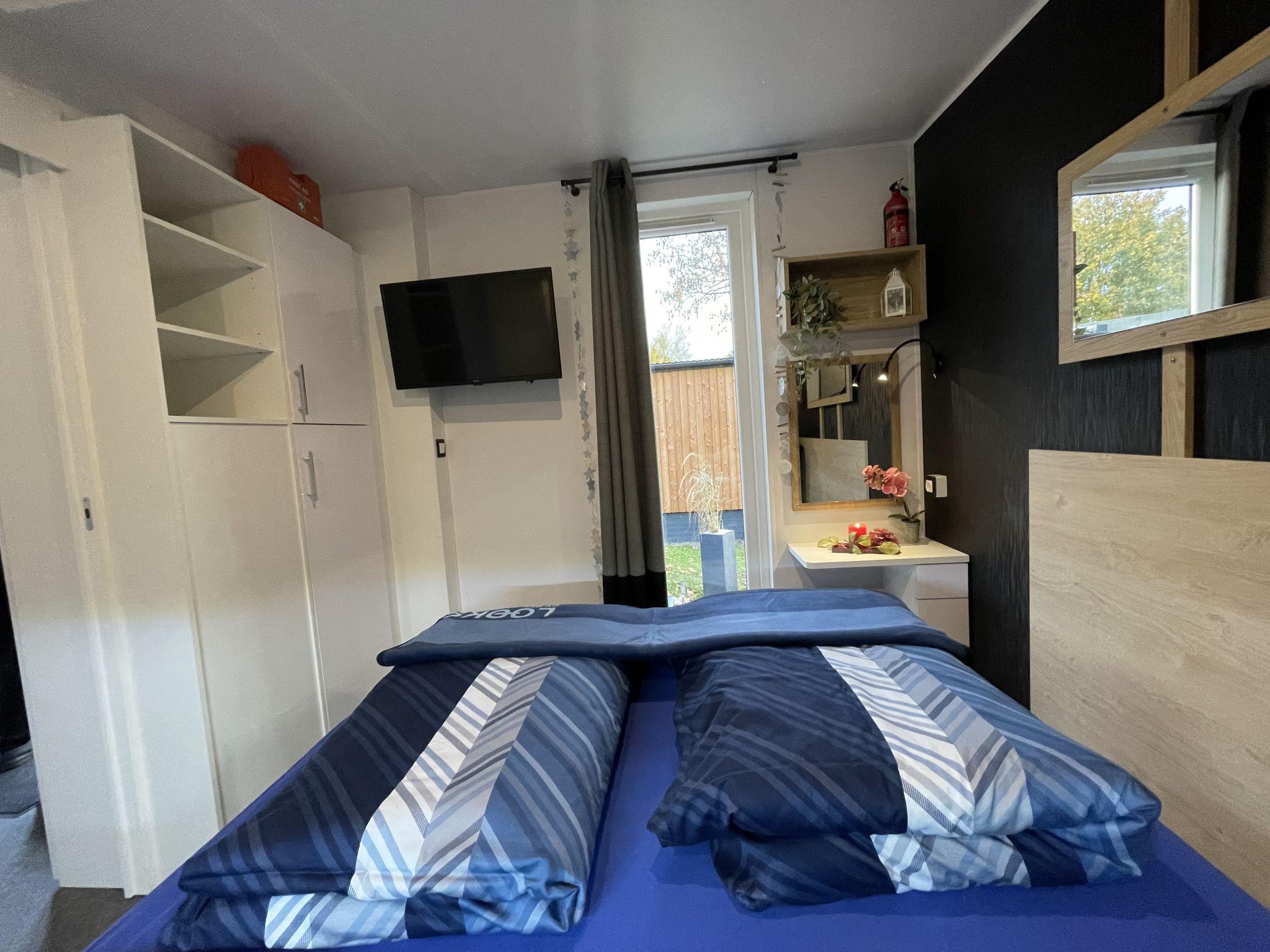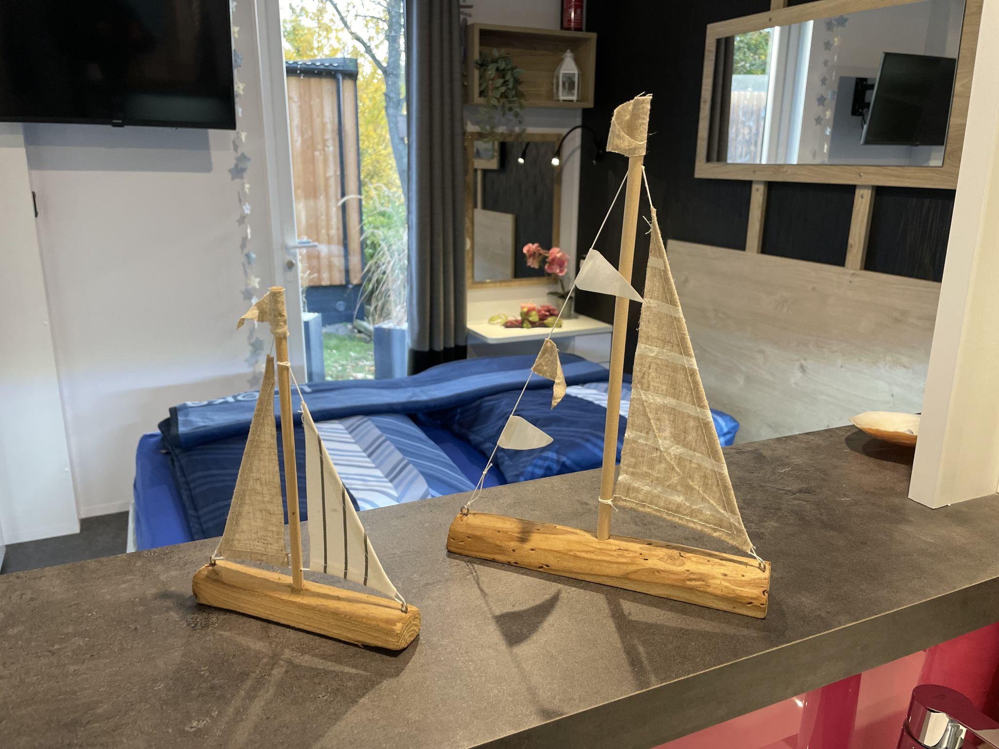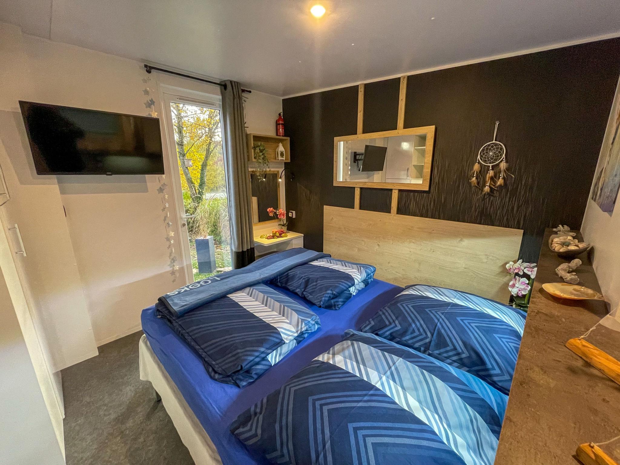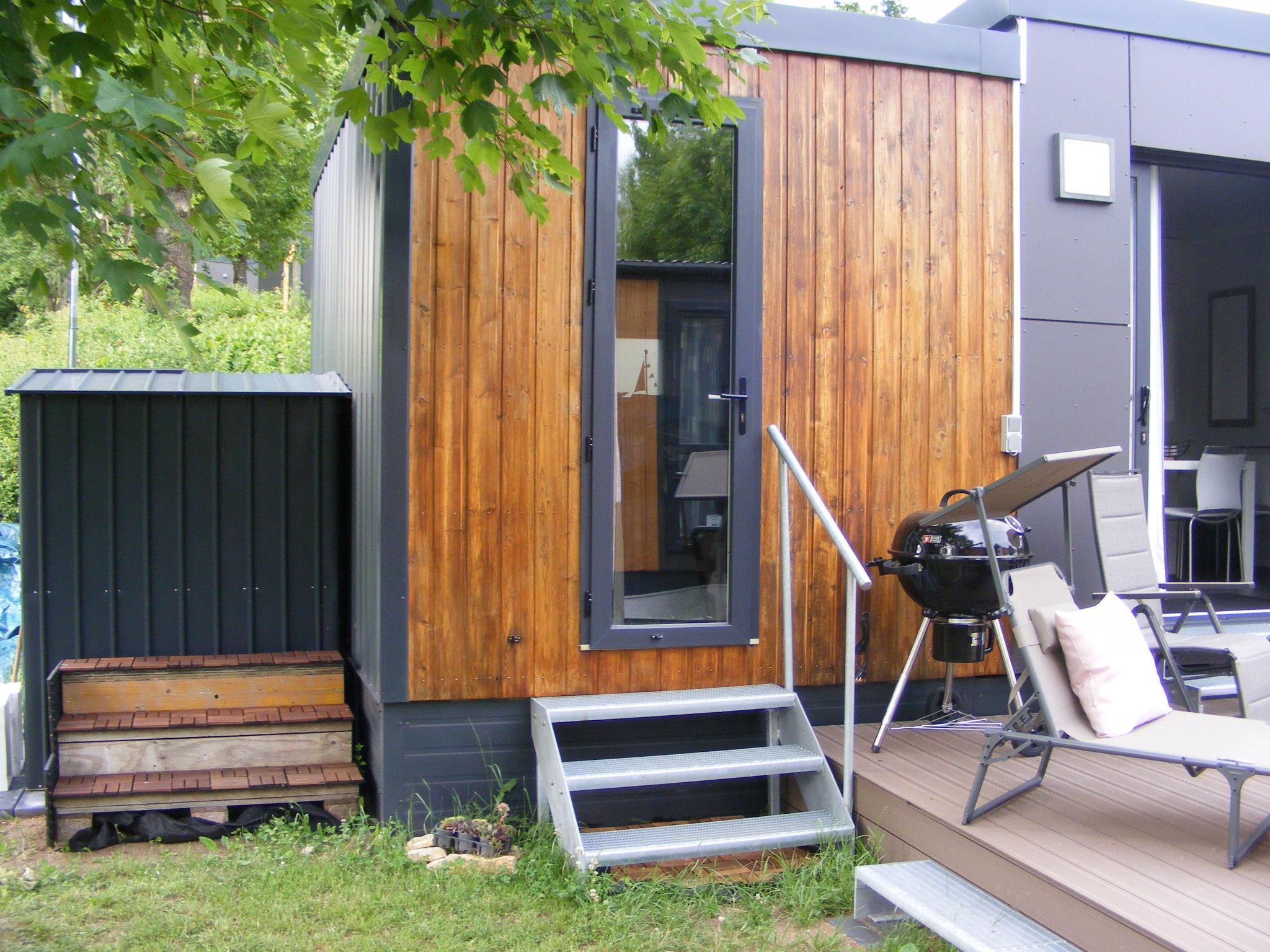"Tiny Haus Ulrike", 3-room mobile home 35 m2. Cosy furnishings: living/sleeping room with 1 double sofabed (140 cm, length 200 cm), dining table and satellite TV (flat screen). Exit to the terrace. 1 room with 1 double bed. 1 room with 2 beds. Open kitchen (dishwasher, Gas stove, 4 gas rings, toaster, kettle, microwave, electric coffee machine). 2 showers/WC. Electric heating, air-conditioning. Terrace. Terrace furniture, barbecue (portable). Facilities: children's high chair, baby cot. Please note: non-smokers only. Safe. The house is right next to DE8834.200.3. Note: The WiFi connection may be limited depending on capacity.