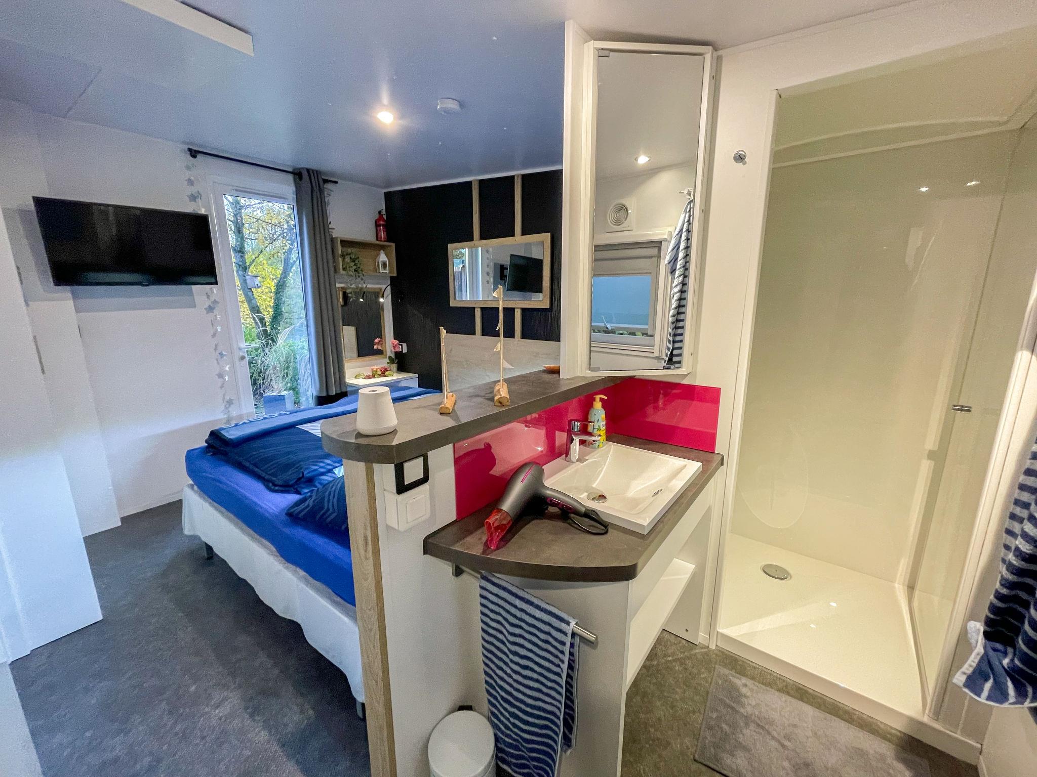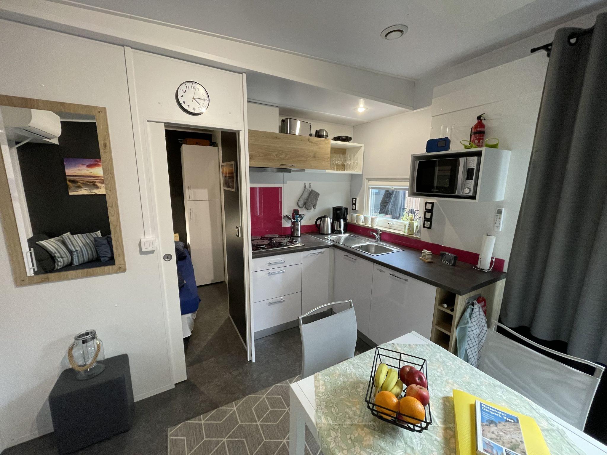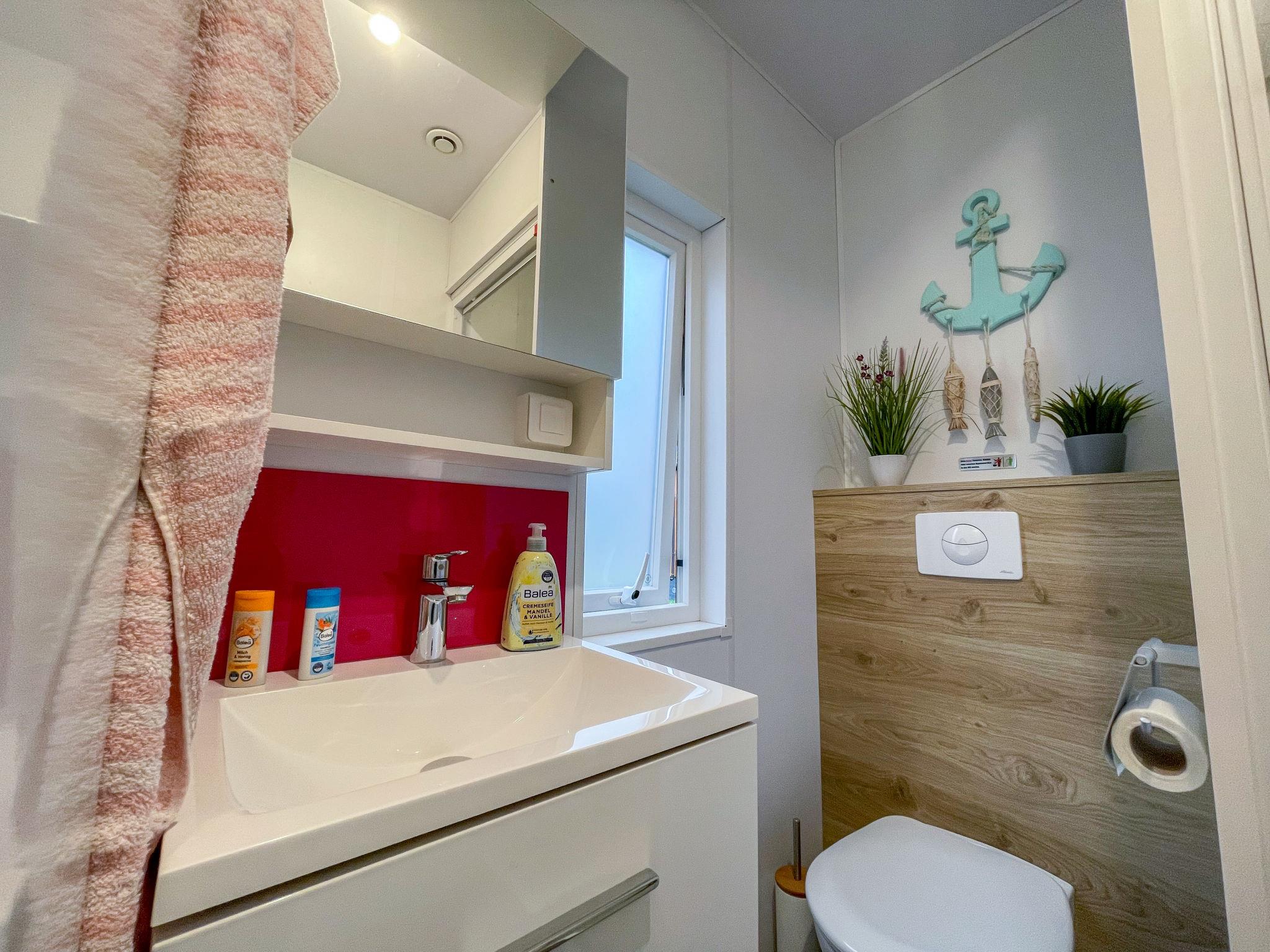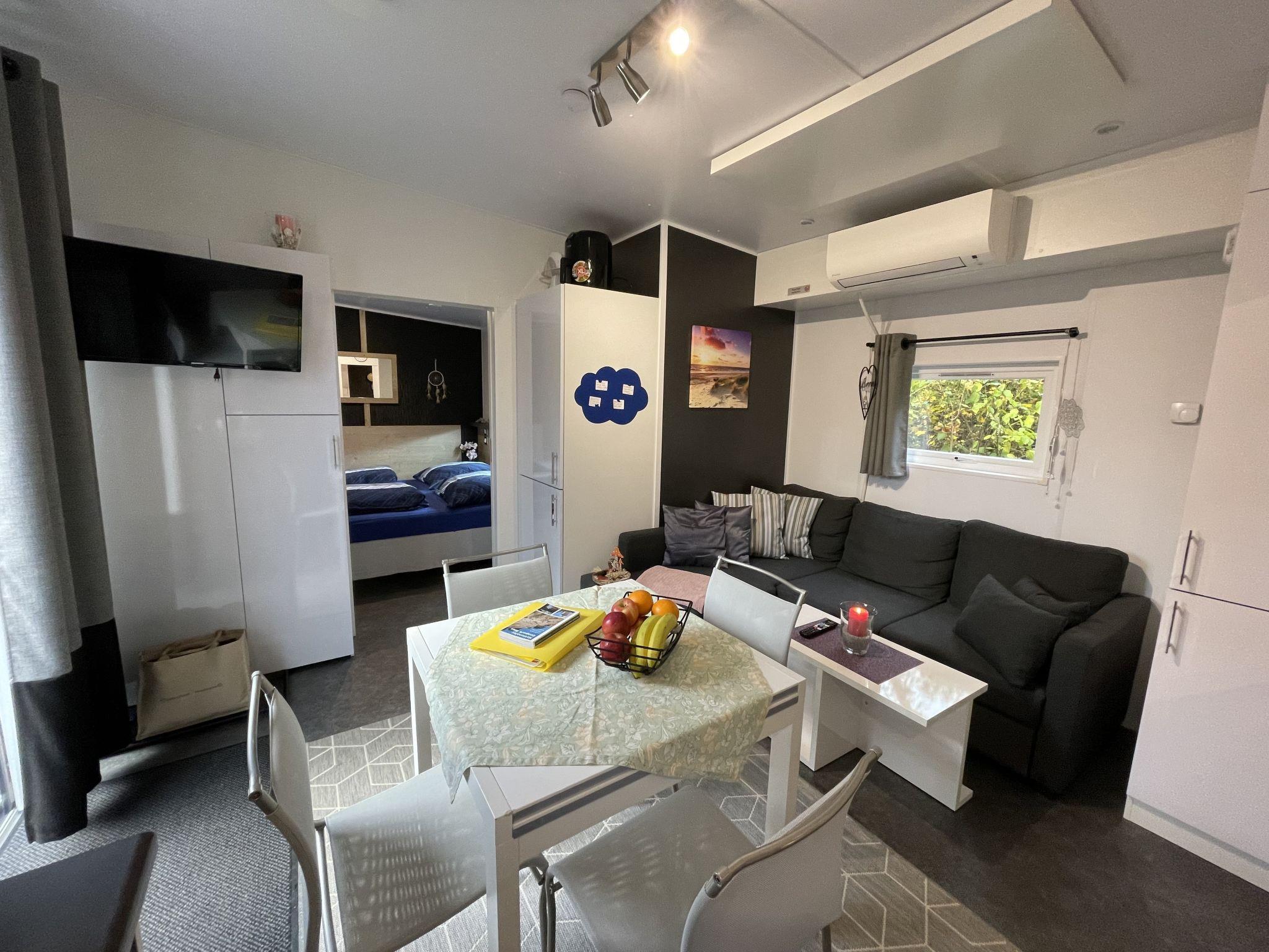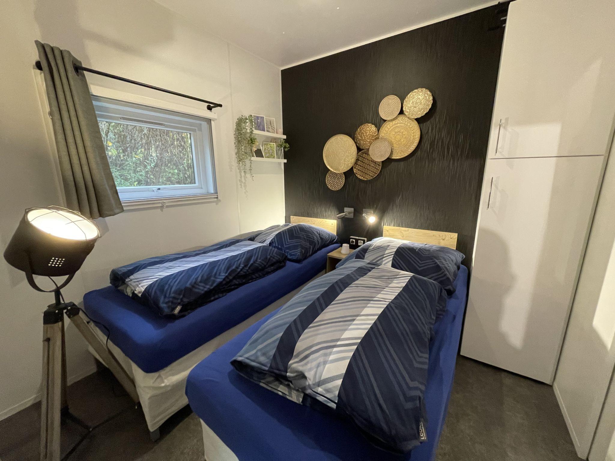 "Tiny Haus Ulrike", 3-room mobile home 35 m2. Cosy furnishings: living/sleeping room with 1 double sofabed (140 cm, length 200 cm), dining table and satellite TV (flat screen). Exit to the terrace. 1 room with 1 double bed. 1 room with 2 beds. Open kitchen (dishwasher, Gas stove, 4 gas rings, toaster, kettle, microwave, electric coffee machine). 2 showers/WC. Electric heating, air-conditioning. Terrace. Terrace furniture, barbecue (portable). Facilities: children's high chair, baby cot. Please note: non-smokers only. Safe. The house is right next to DE8834.200.3. Note: The WiFi connection may be limited depending on capacity.