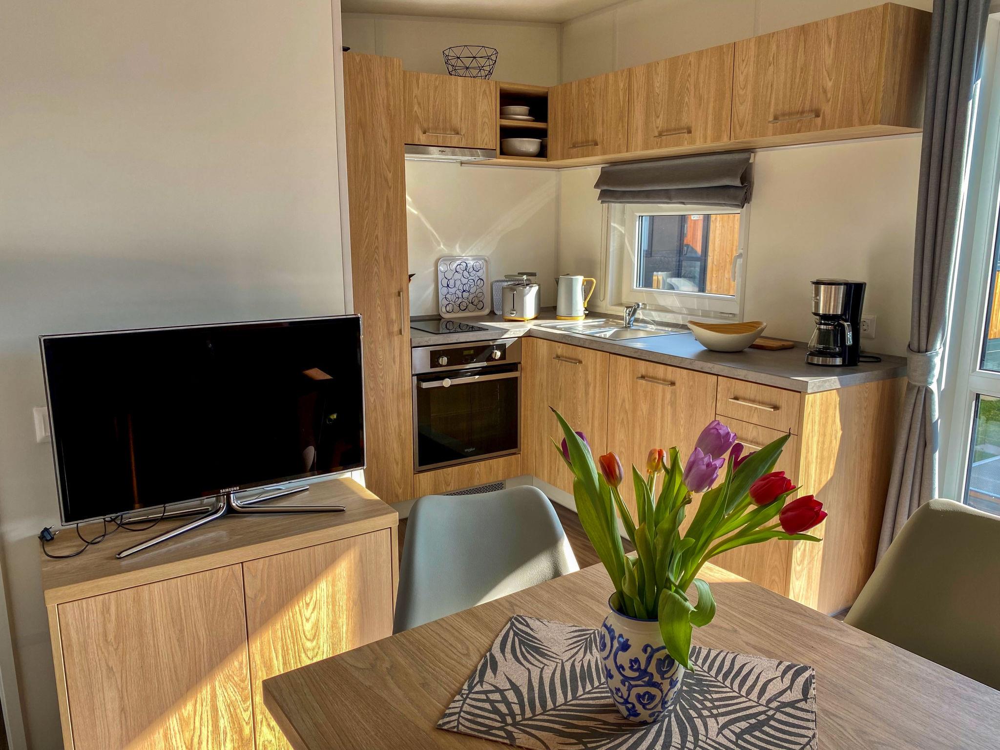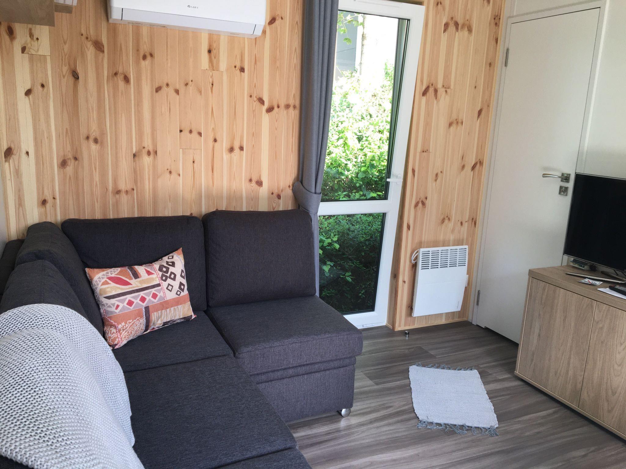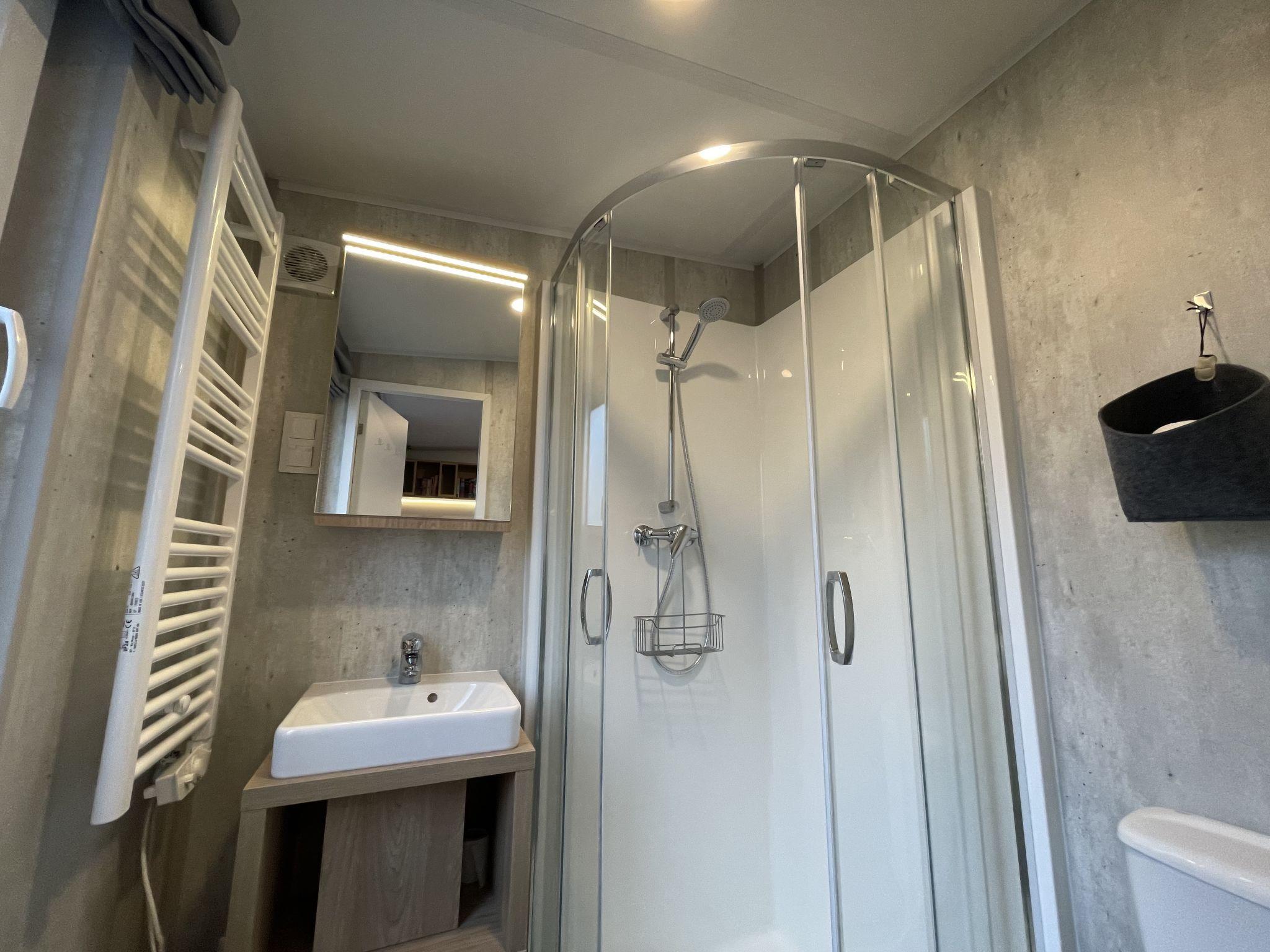 "Tiny Haus Waldsee Lodge", 2-room mobile home 24 m2. Object suitable for 2 adults + 2 children. Cosy furnishings: living/sleeping room with 1 double sofabed and satellite TV. Exit to the terrace. 1 room with 1 french bed (140 cm, length 200 cm). Open kitchen (2 induction hot plates, toaster, kettle, electric coffee machine). Shower/WC. Electric heating, air-conditioning. Terrace furniture, barbecue. ATTENTION: The Wi-Fi connection may be limited depending on capacity.