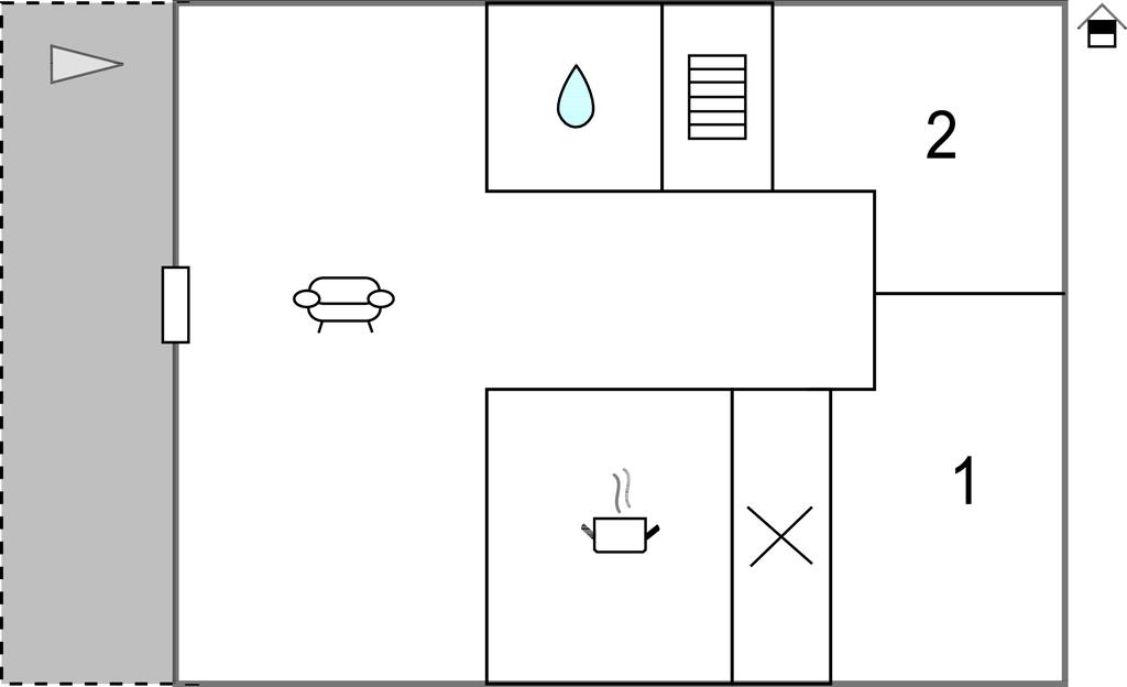 Lejligheden ligger på husets førstesal. Den store hyggelige sofa er stuens centrum, desuden kan I sidde om spisebordet alle sammen og nyde dagens måltider. På sofaen kan der sove to. Fra stuen er der udgang til den overdækkede altan med havemøbler. Soveværelserne er udstyret med enten enkelt- eller dobbeltseng.