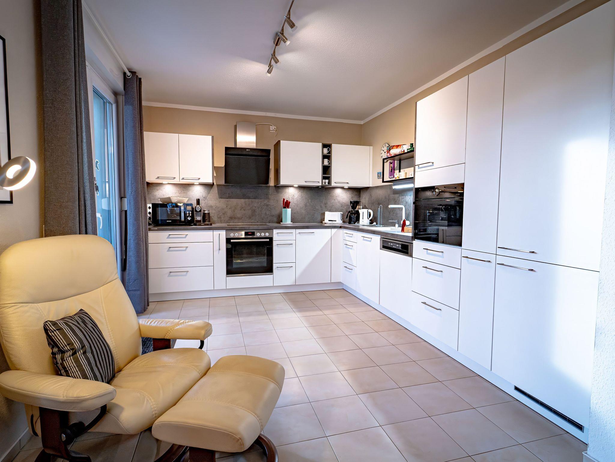 • Moderne, offene Wohnküche mit Herd, Backofen, Mikrowelle, Dampfgarer, Geschirrspüler, Kühl-Gefrierkombination, Kaffeemaschine, Nespresso Maschine und weitere Küchenutensilien