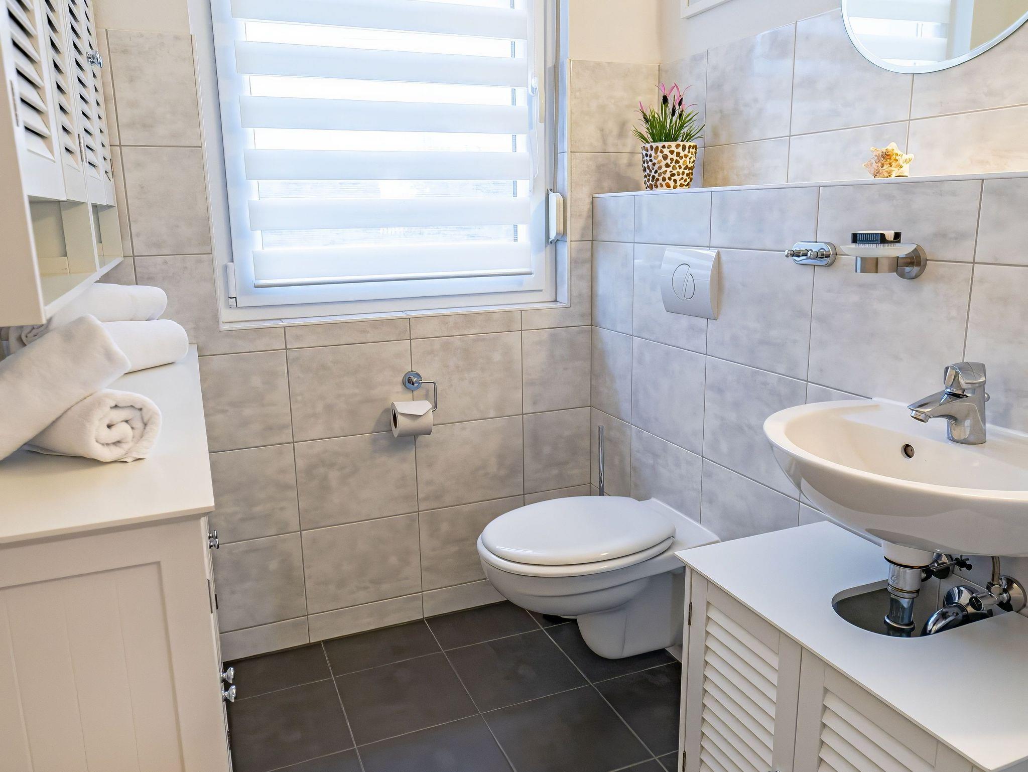 • Badezimmer mit Badewanne, Dusche, Waschbecken und WC