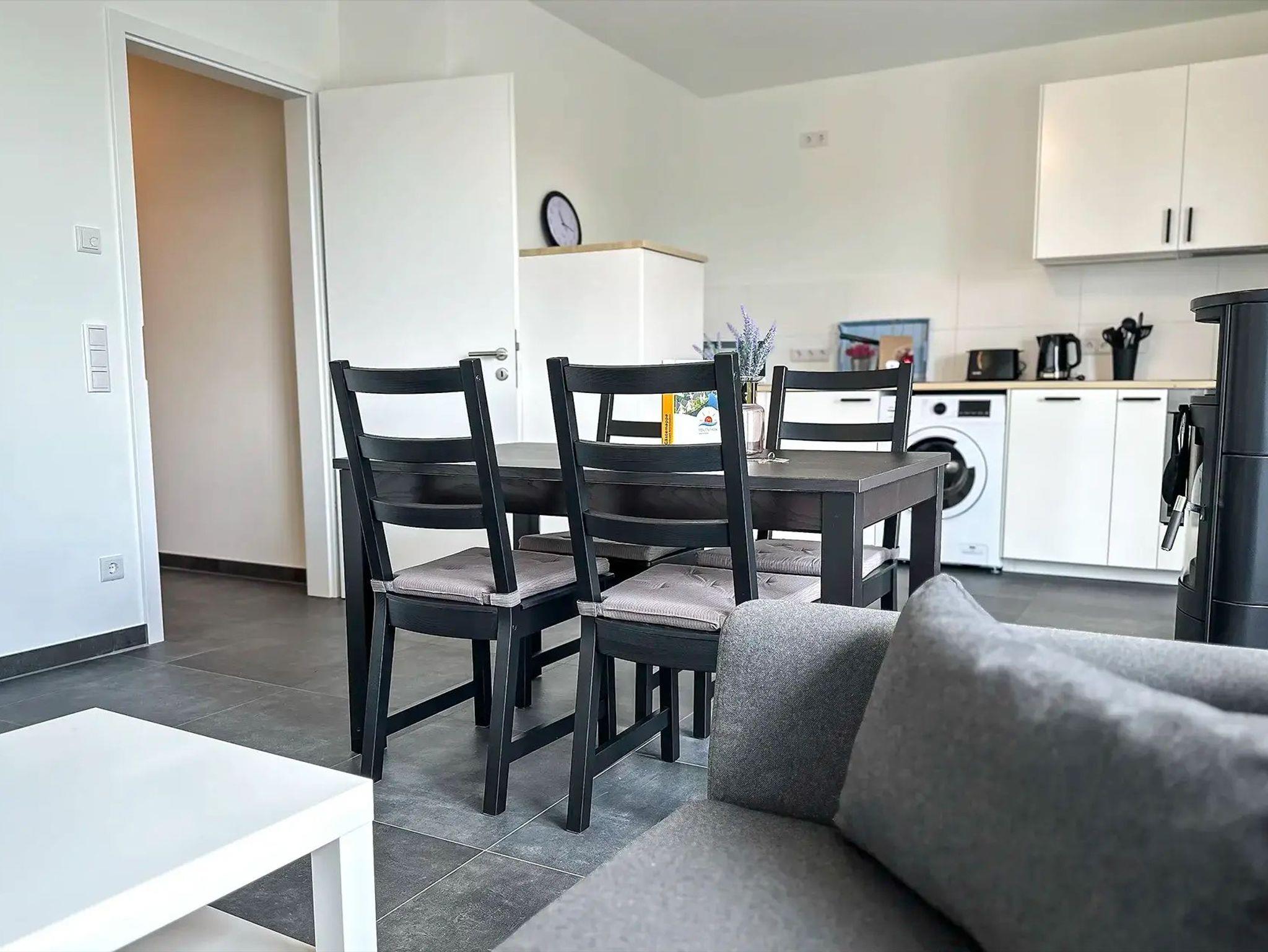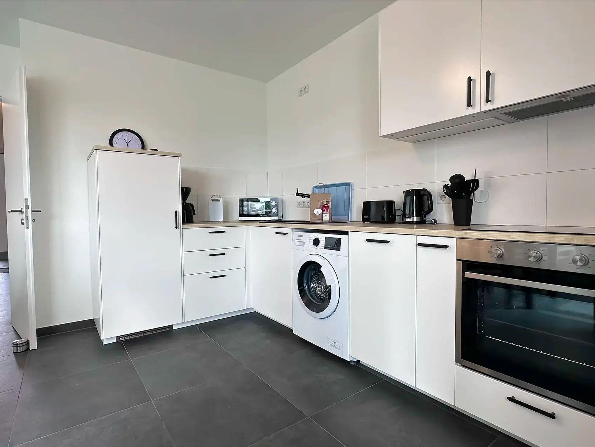 • Einbauküche mit Waschmaschine, Spülmaschine, Herd mit Backofen, Mikrowelle, Kühlschrank mit Tiefkühlfach, Kaffeemaschine, Wasserkocher, Toaster, Geschirr und Gläser für 6 Gäste