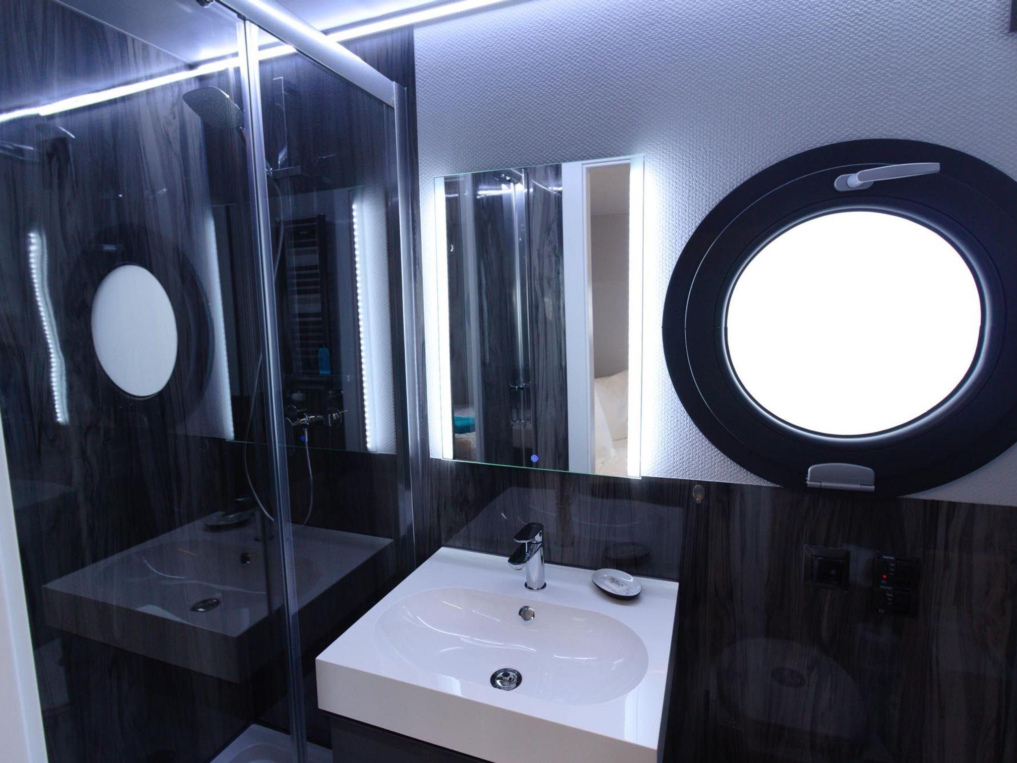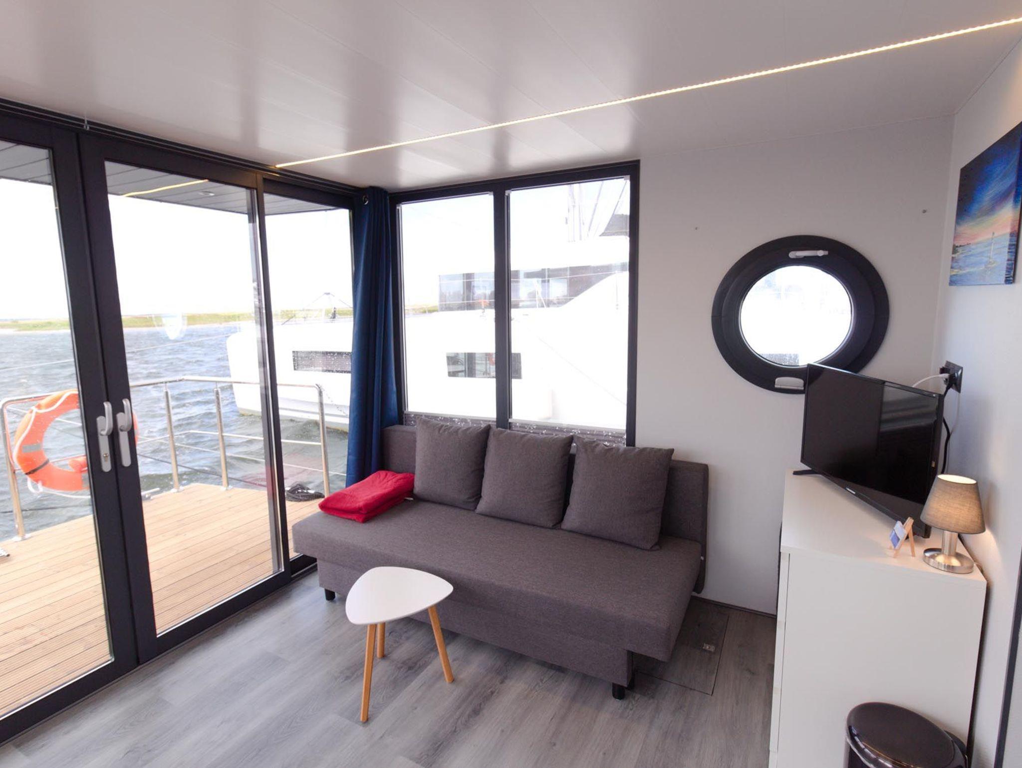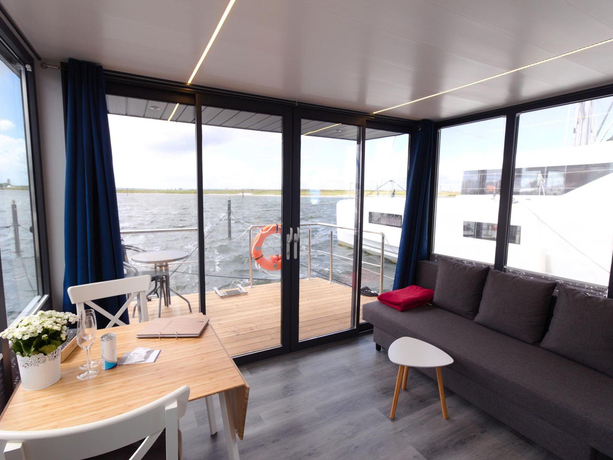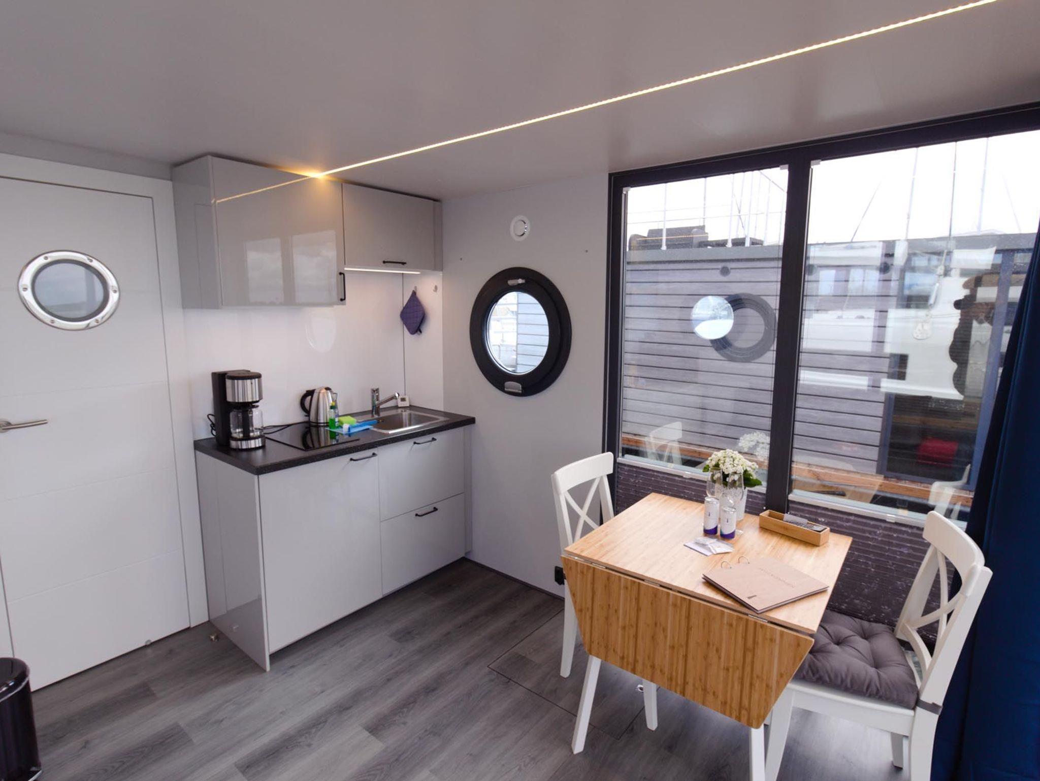 Dieses großzügige mobile Hausboot bietet Ihnen auf 32 qm Bootsfläche den ganzen Komfort einer modernen und hochwertigen Ferienwohnung mit Sonnen- und Dachterrasse. Im gemütlichen Wohnraum mit Wohnküche lässt es sich entspannt auf der ausziehbaren Couch verweilen oder Sie kommen am großzügigen Tisch zu einem leckeren Essen oder Spieleabend zusammen. Die vollausgestattete Küche mit allen wichtigen Küchengeräten und einem Induktionsherd lässt keine Wünsche offen.