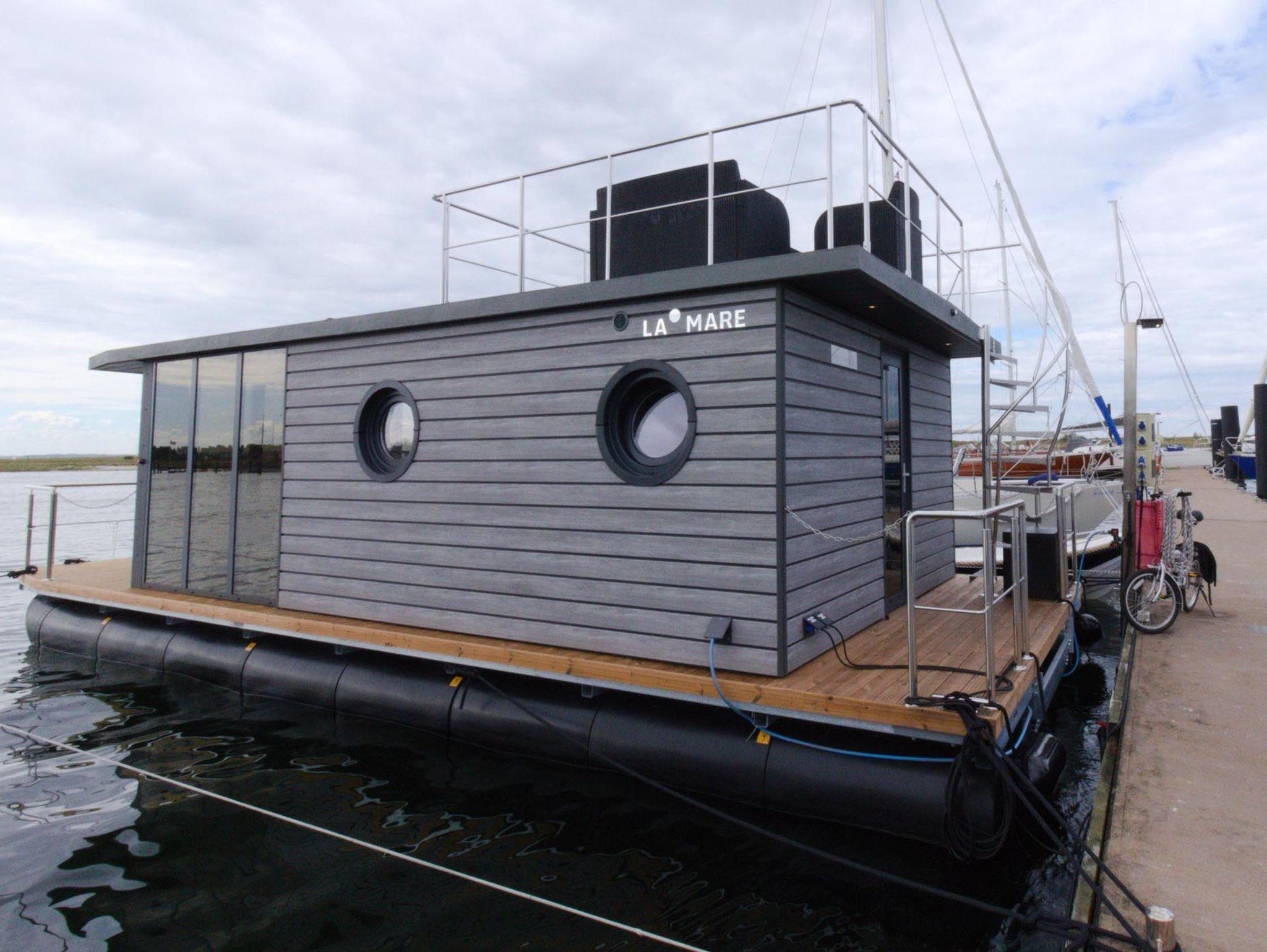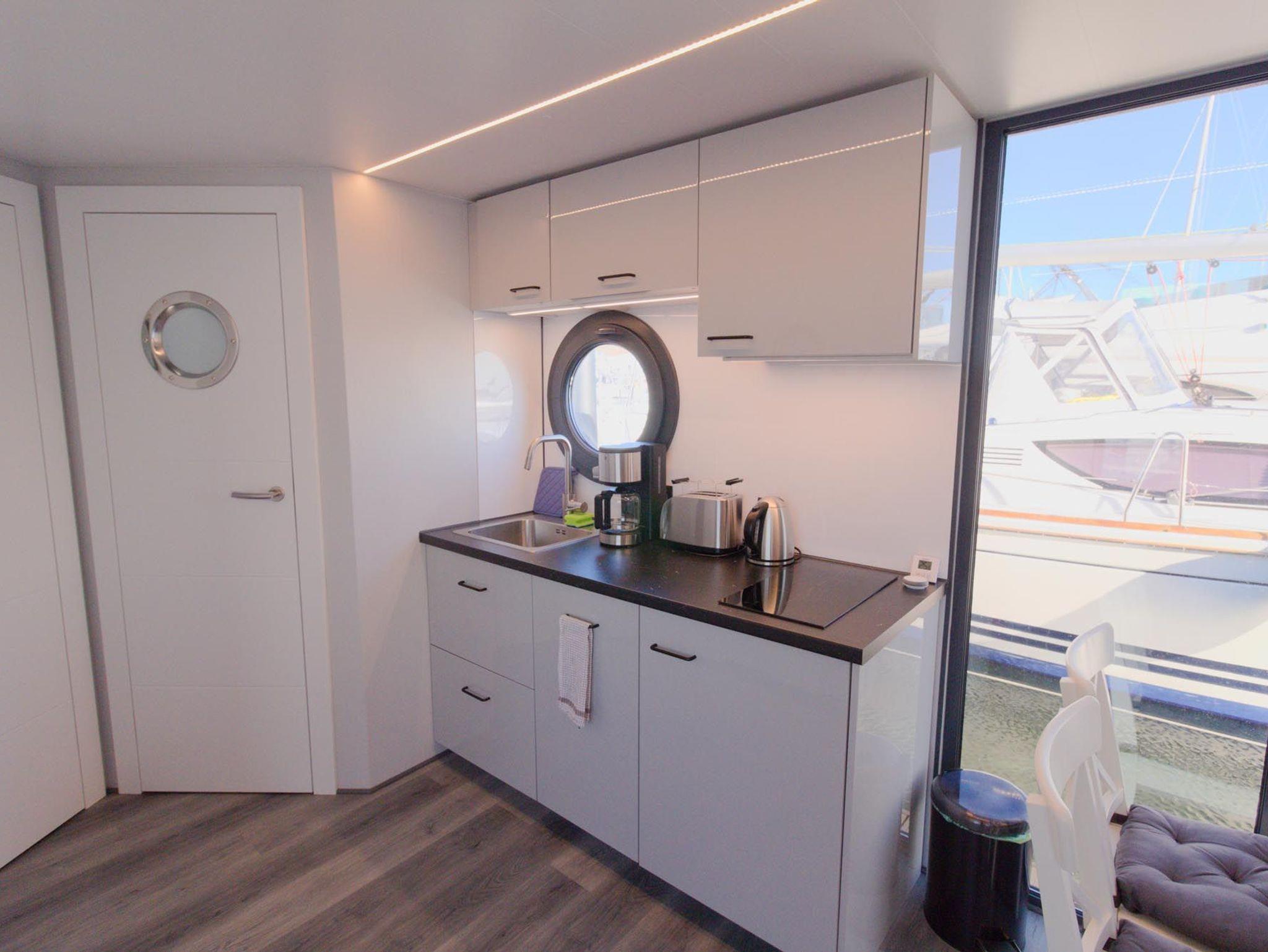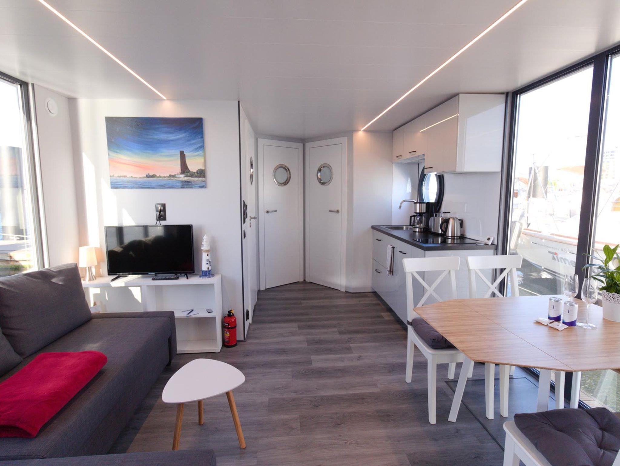 Dieses großzügige mobile Hausboot bietet Ihnen auf 46 qm Bootsfläche den ganzen Komfort vergleichbar mit einer modernen und hochwertigen Ferienwohnung mit Sonnen- und Dachterrasse. Im gemütlichen Wohnraum mit Wohnküche lässt es sich entspannt auf der ausziehbaren Couch verweilen oder Sie kommen am großzügigen Tisch zu einem leckeren Essen oder Spieleabend zusammen.