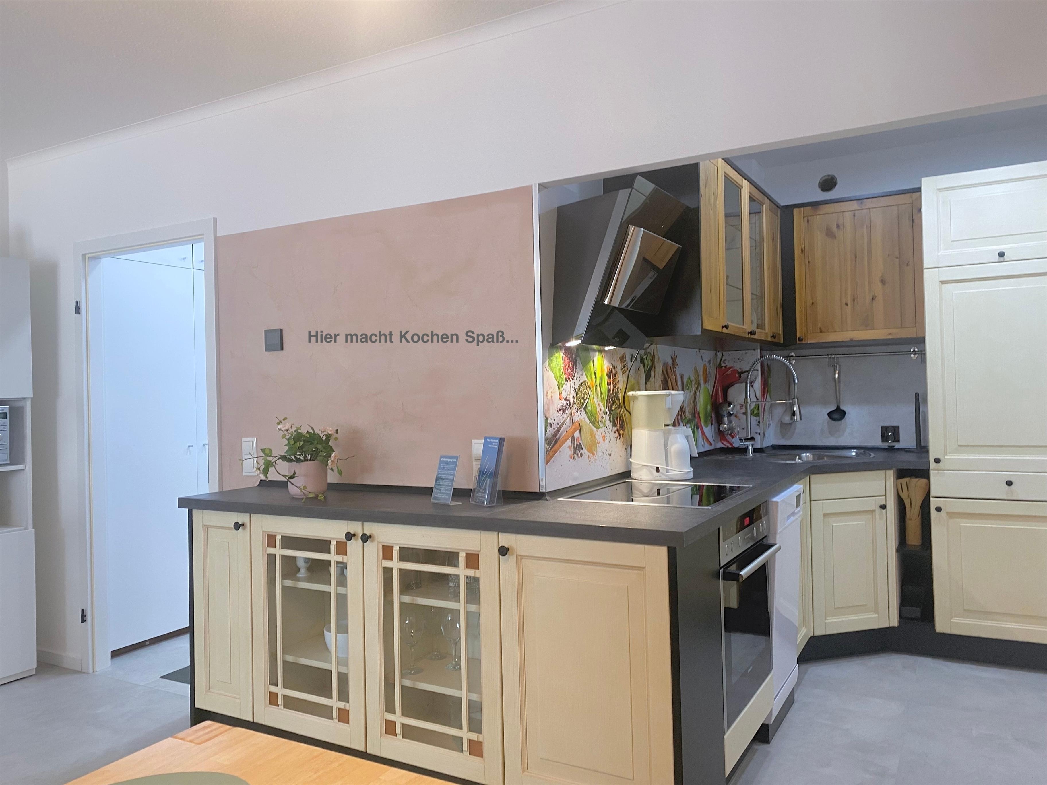 Vom gemütlichen Essplatz mit großem Tisch gelangen Sie direkt in die offene Küche, welche ebenfalls geschmackvoll eingerichtet und gut ausgestattet ist. Hier gibt es Geschirrspüler, Backofen, Induktionsfeld, Mikrowelle, Kühlschrank/Gefrierfach und diverse Kleingeräte; ein kleiner Gefrierschrank rundet das Angebot ab.