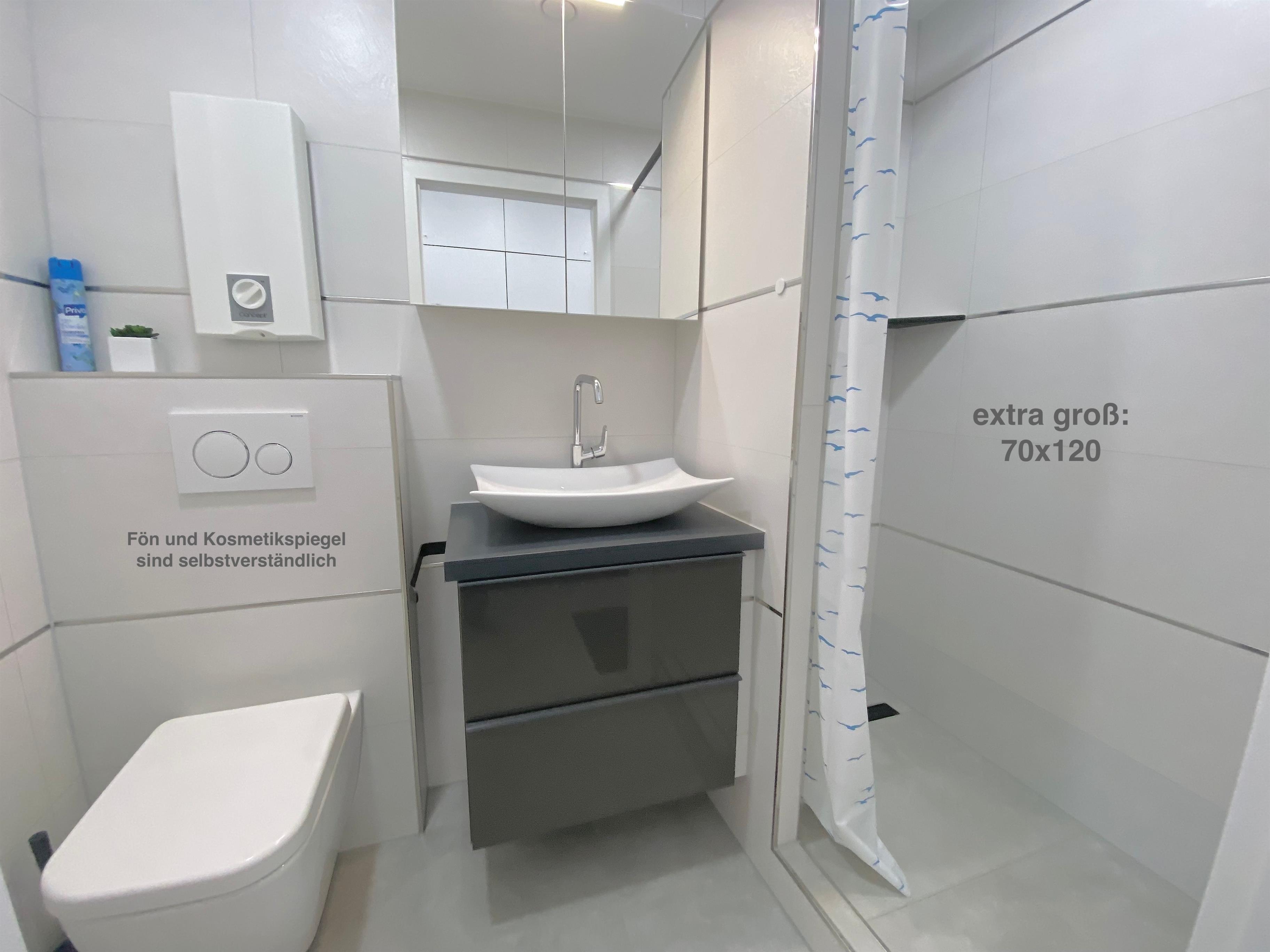Das Doppelbett (140x200) steht im getrennten Schlafzimmer und Sie finden hier den zweiten großen Kleiderschrank für Ihr Urlaubsgepäck. Das Duschbad verfügt über eine extra große Dusche (70x120) und hat ebenfalls viele Ablagemöglichkeiten.