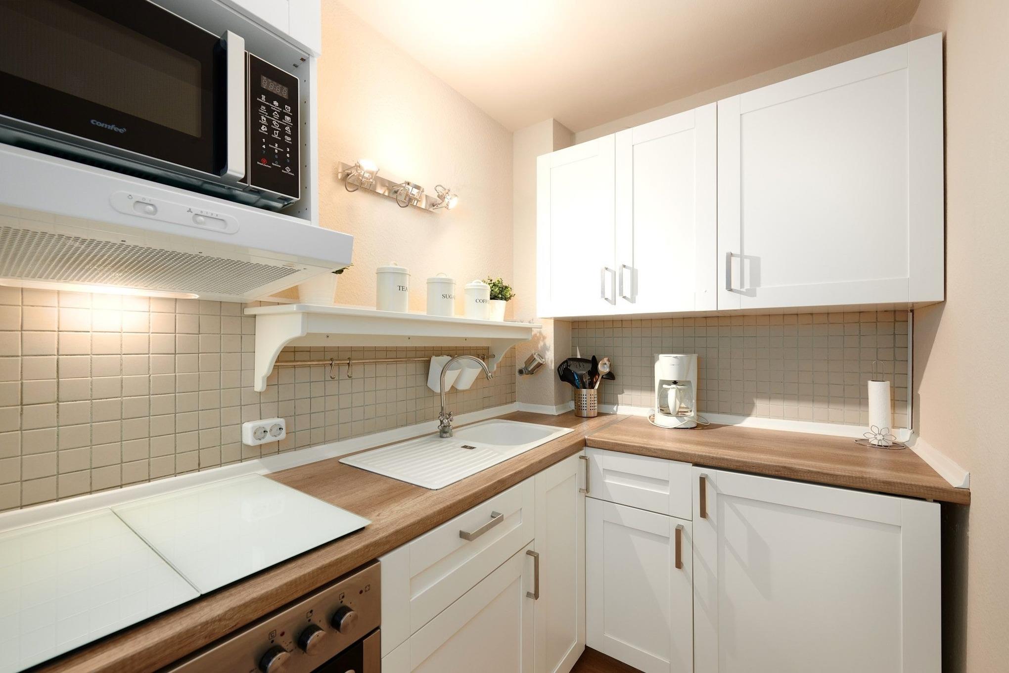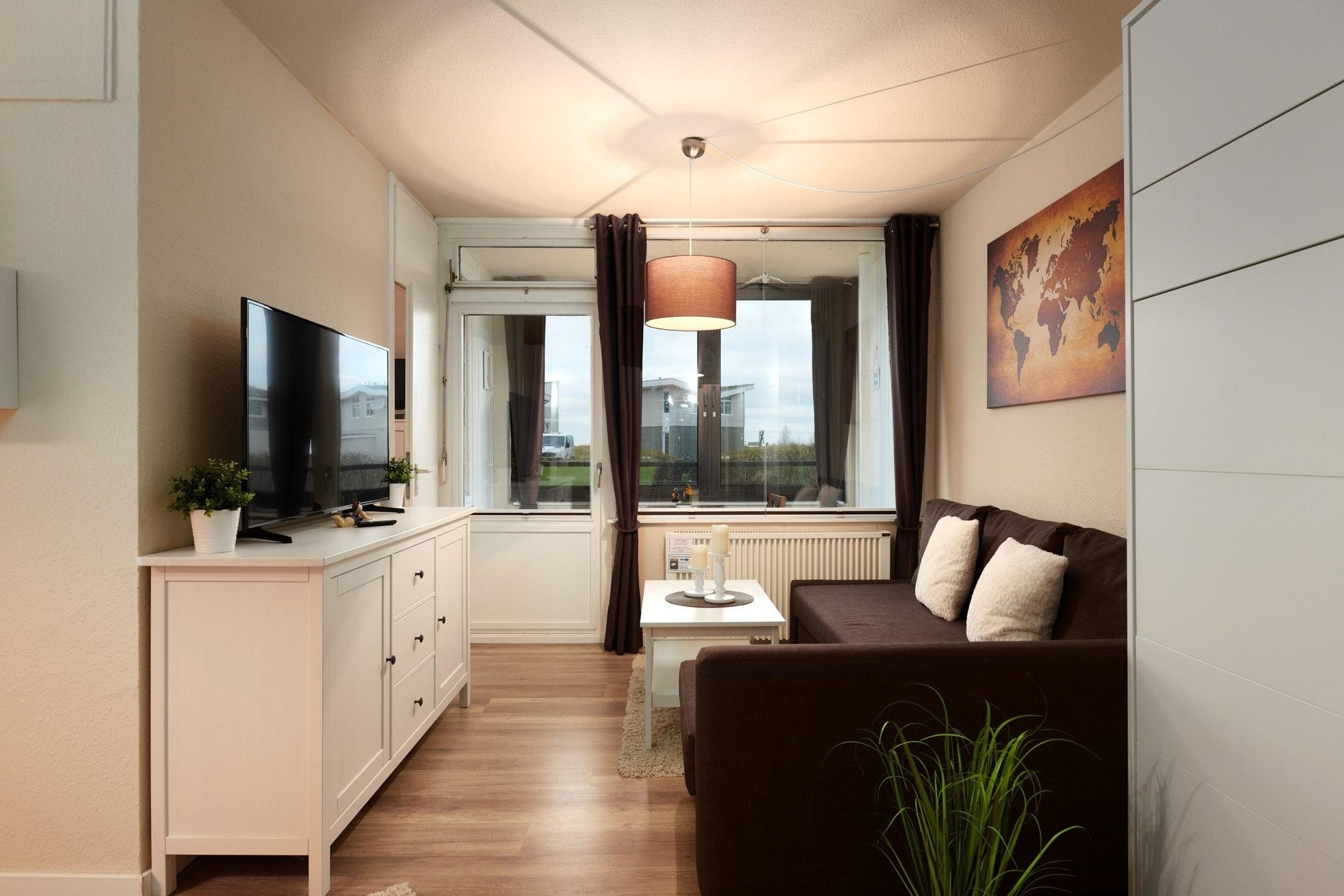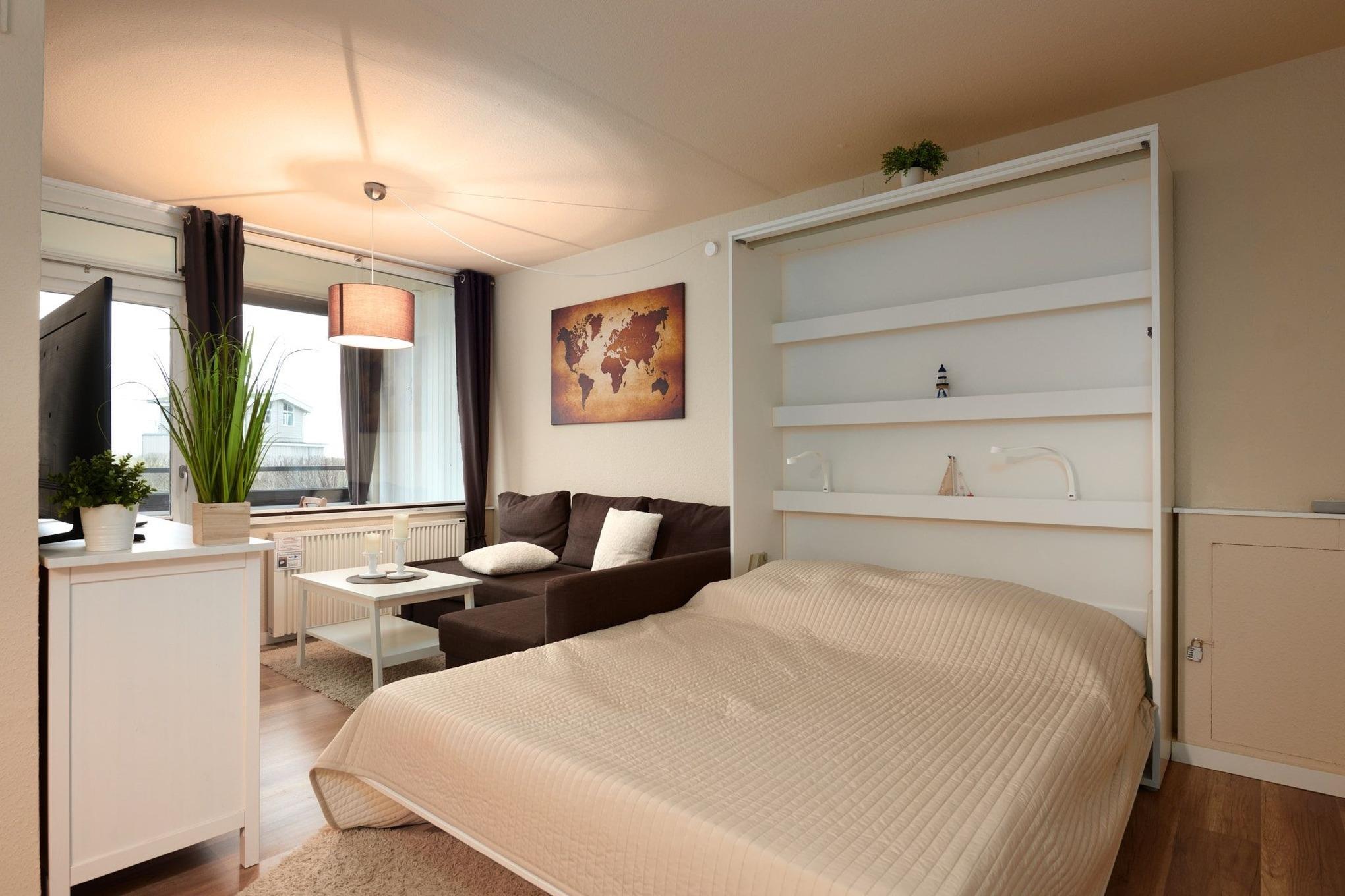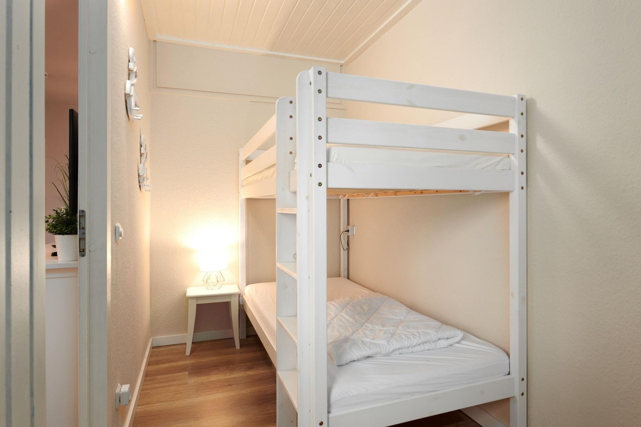 Die Wohnung besticht durch ihre gradlinige, moderne Einrichtung und ist ideal für den Familienurlaub: Im Wohn-/Schlafbereich erwartet Sie neben einer bequemen Sofaecke ein komfortables Schrankbett (Liegefläche 160x200 cm), während es sich zwei weitere Personen im Etagenbett (je 90x200 cm) im separaten Schlafzimmer gemütlich machen. Den Mittelpunkt bildet der gemütliche Essplatz mit großem Tisch vor der offenen Küche. Diese ist ausgestattet mit reichlich Geschirr, Ceranfeld, Backofen, Mikrowelle, Kühlschrank/Gefrierfach, Kaffeemaschine, Wasserkocher und Toaster.