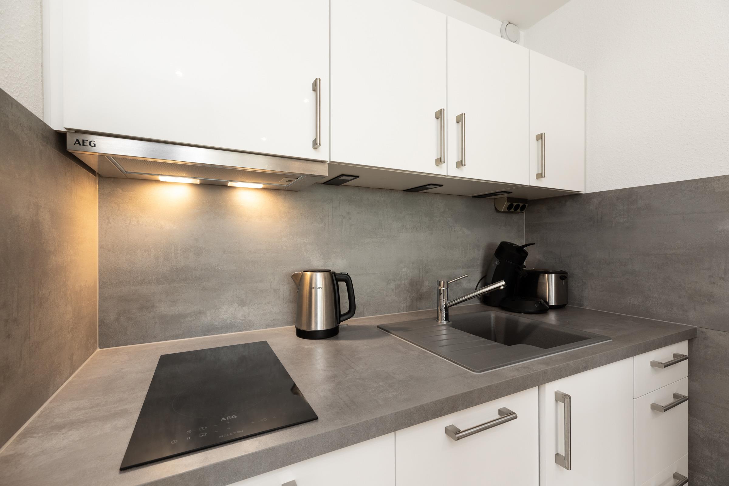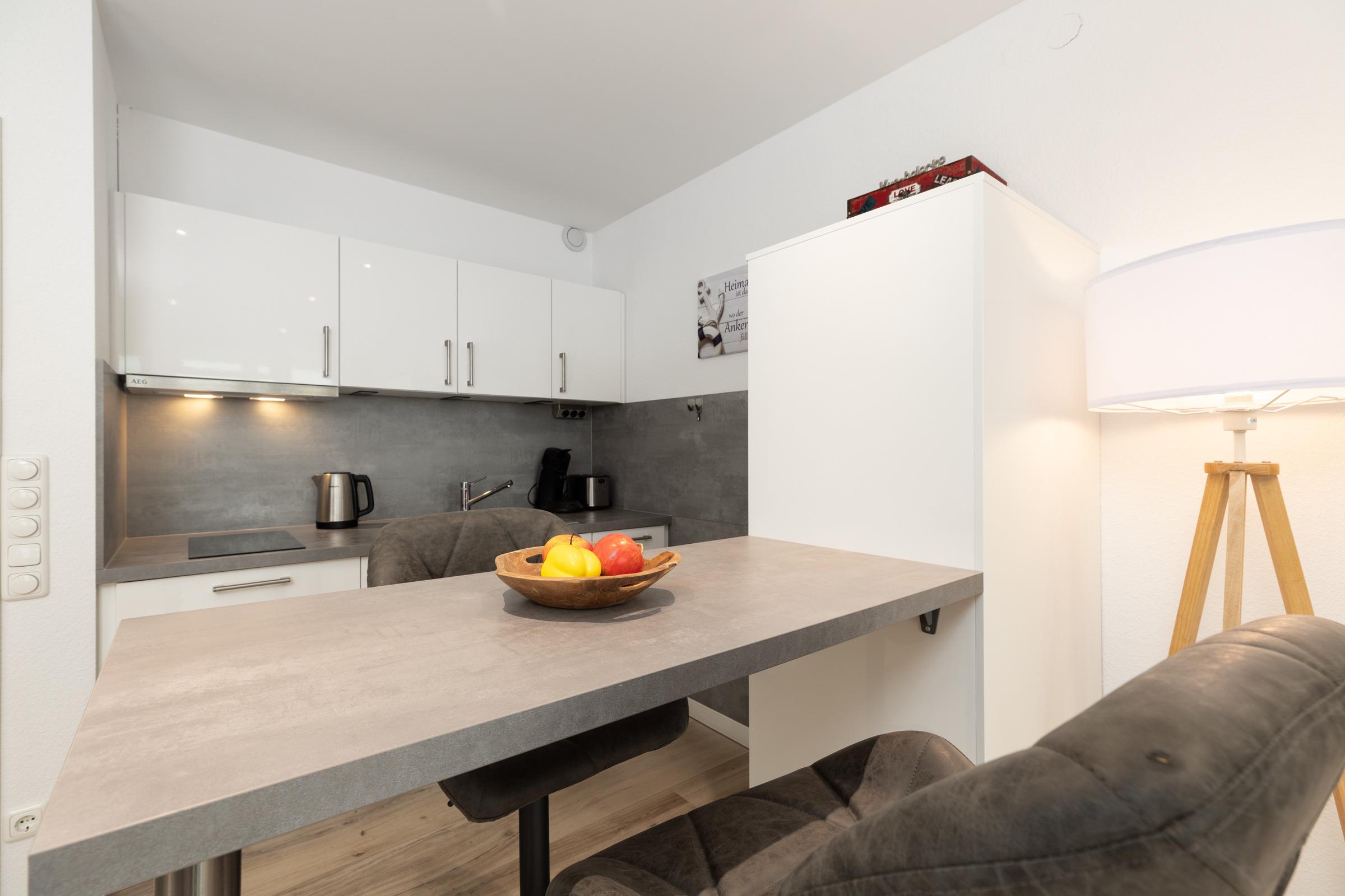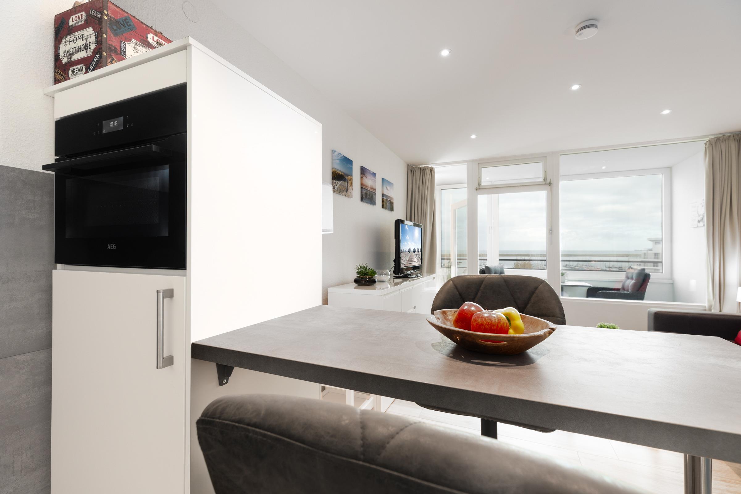 Die Wohnung ist modern ausgestattet, die offene Wohnküche bietet alles was das Herz begehrt - Induktionsherd, Toaster, Kaffee- und Espressomaschine, Spülmaschine sowie eine Mikrowelle mit Backofen-Funktion. Zur Nacht wird die Couch einfach zum gemütlichen Bett ausgeklappt. Wunderbar - der Ausblick direkt auf den Yachthafen. Im geschlossen Balkon kann man den Abend gemütlich ausklingen lassen.