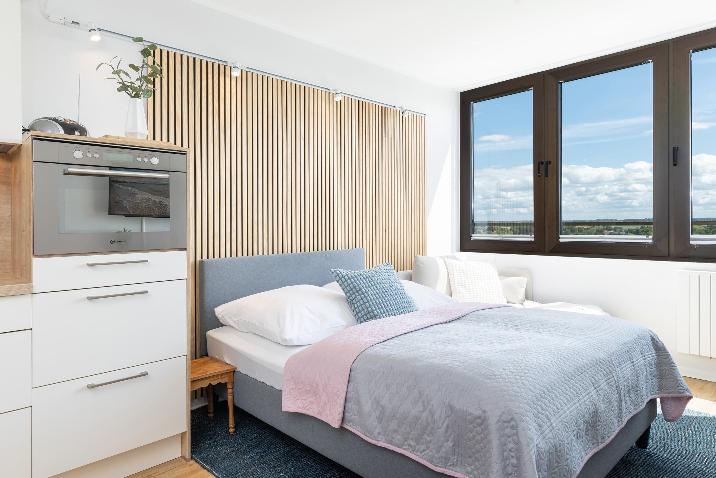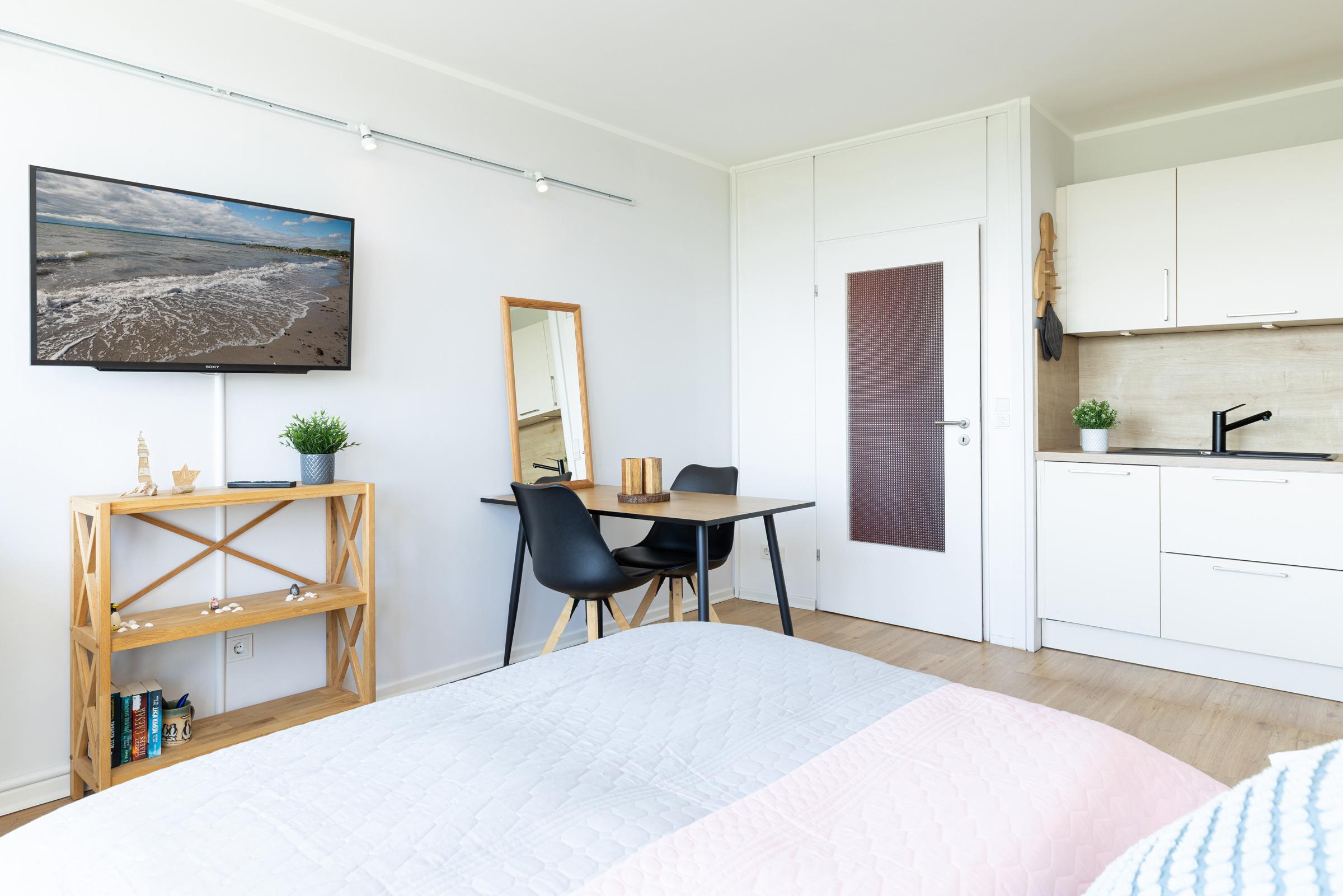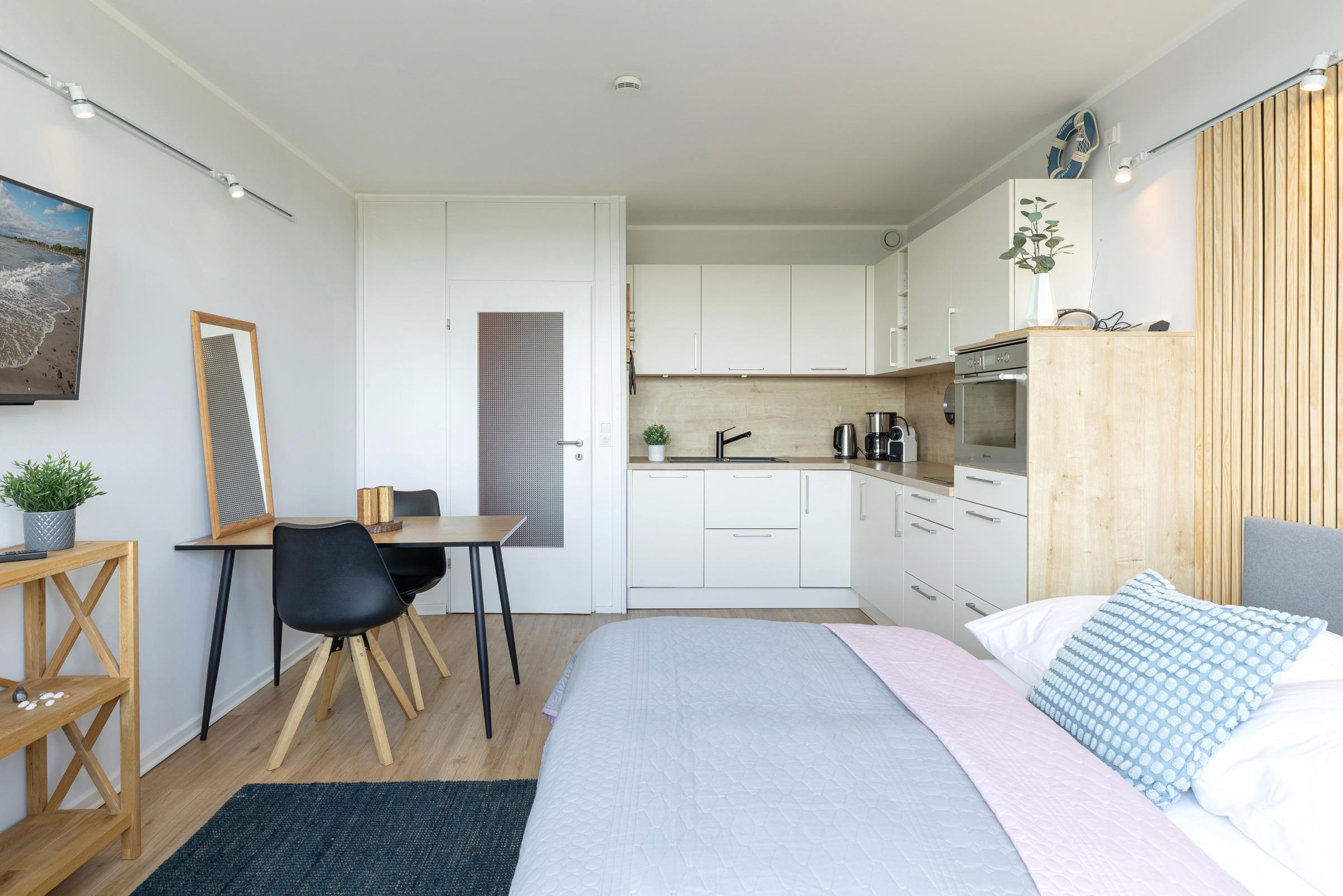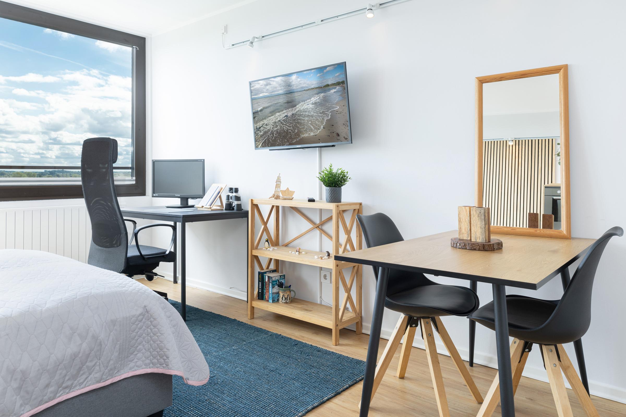 Die integrierte Einbauküche ist mit hochwertigen Marken-Geräten wie einem 2-Platten-Induktionsherd, Geschirrspüler sowie Backofen/Mikrowelle ausgestattet. Das bequeme Bett (140x200 cm) lädt zum erholsamen Schlafen oder zum Fernsehen ein. Für eine entspannte Workation an der Küste steht Ihnen ein Arbeitsplatz mit Monitor und ergonomischem Bürostuhl zur Verfügung. Der moderne Esstisch bietet viel Fläche zum Essen, Arbeiten oder Spielen und mit Hilfe der dimmbaren Beleuchtung ist eine gemütliche Atmosphäre vorprogrammiert.