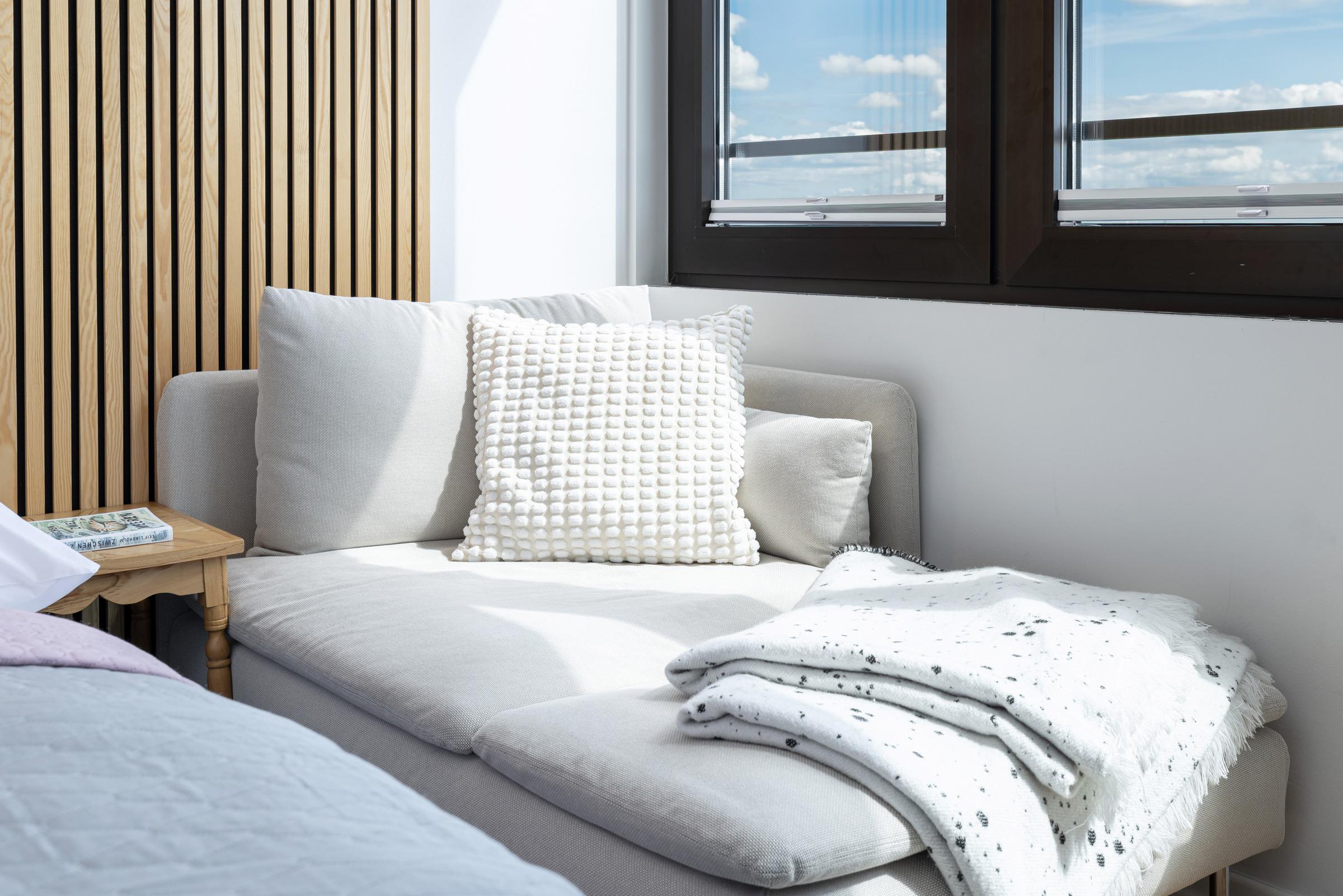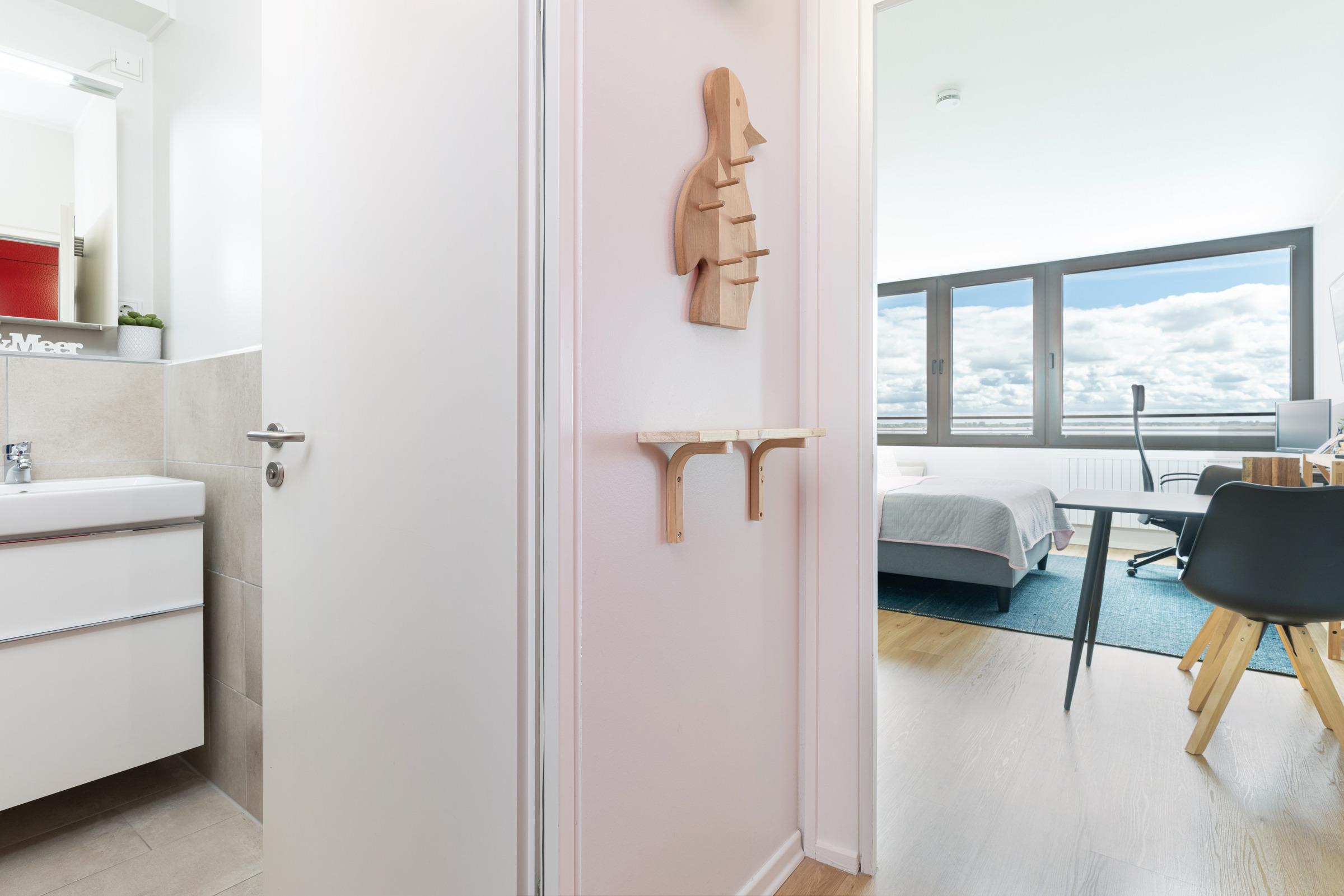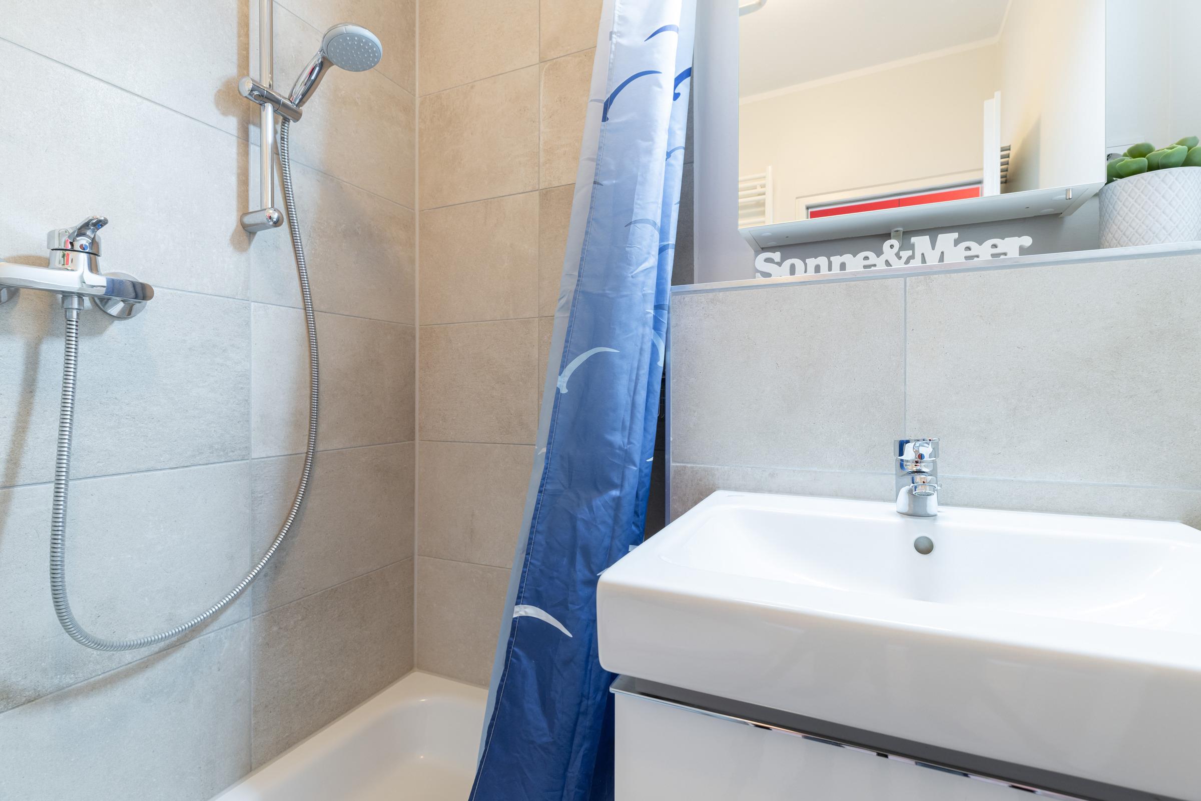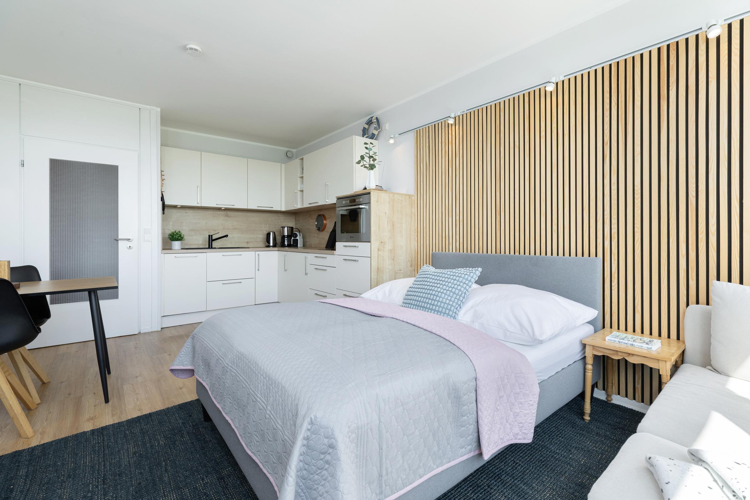 Die integrierte Einbauküche ist mit hochwertigen Marken-Geräten wie einem 2-Platten-Induktionsherd, Geschirrspüler sowie Backofen/Mikrowelle ausgestattet. Das bequeme Bett (140x200 cm) lädt zum erholsamen Schlafen oder zum Fernsehen ein. Für eine entspannte Workation an der Küste steht Ihnen ein Arbeitsplatz mit Monitor und ergonomischem Bürostuhl zur Verfügung. Der moderne Esstisch bietet viel Fläche zum Essen, Arbeiten oder Spielen und mit Hilfe der dimmbaren Beleuchtung ist eine gemütliche Atmosphäre vorprogrammiert.