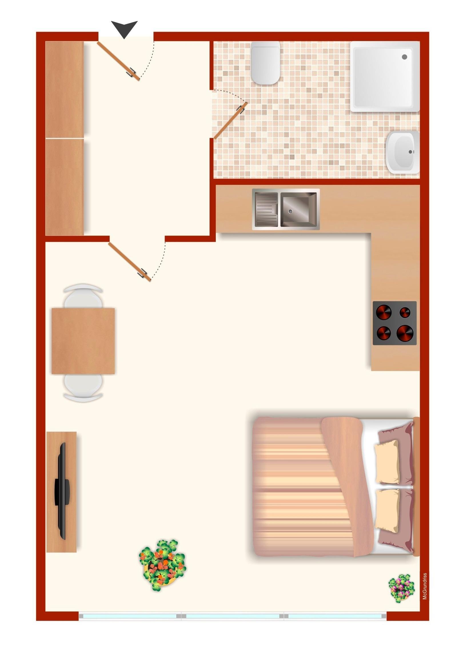 Wohn/Schlafraum: 1 Doppelbett (140x200 cm), Verdunkelung: Plissees