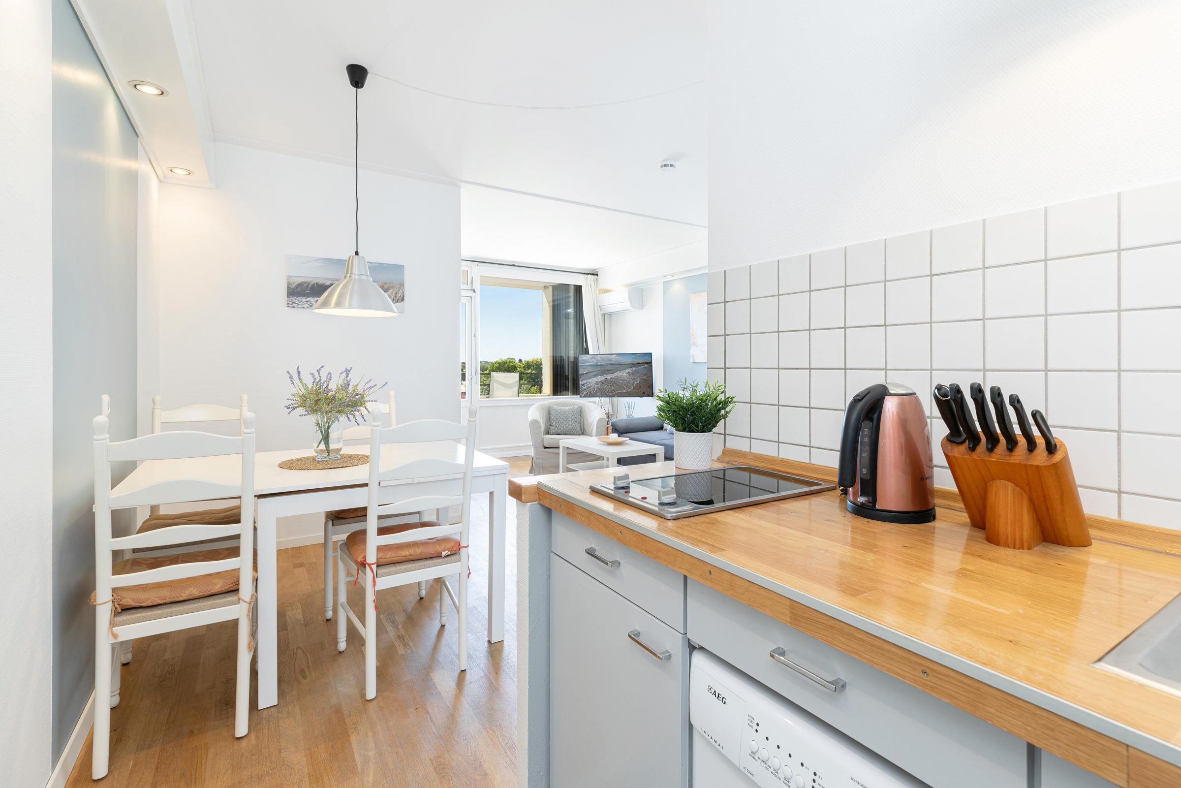 Der kombinierte Wohnraum mit gemütlicher Sitz- und Essecke und einer gut ausgestatteten Küchenzeile samt Spül- und Waschmaschine bietet Ihnen alles, was Sie im Urlaub benötigen. Im Schlafzimmer finden Sie zwei hintereinander stehende Einzelbetten. Für angenehme Temperaturen an heißen Sommertagen sorgt die Klimaanlage. Abgerundet wird diese Unterkunft durch das funktionale Badezimmer.