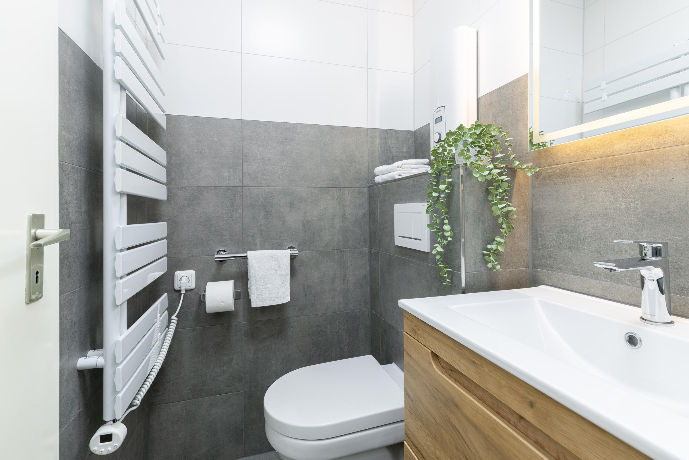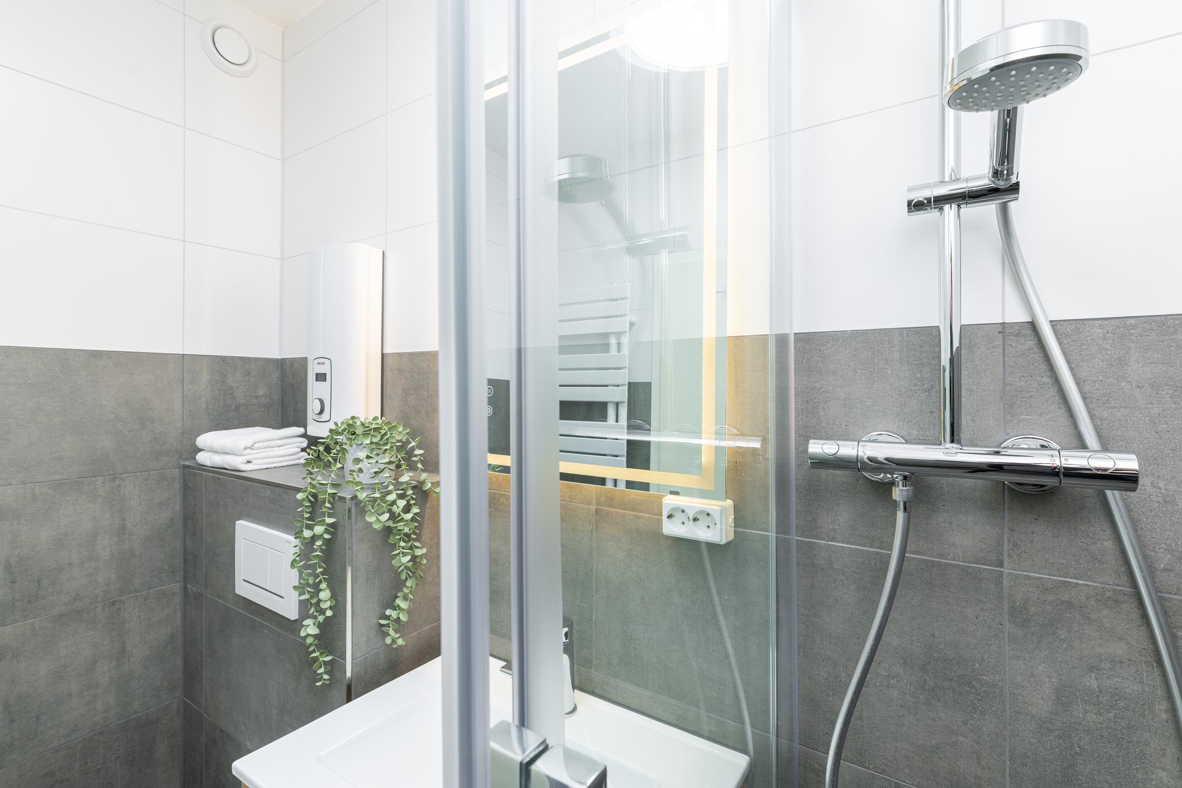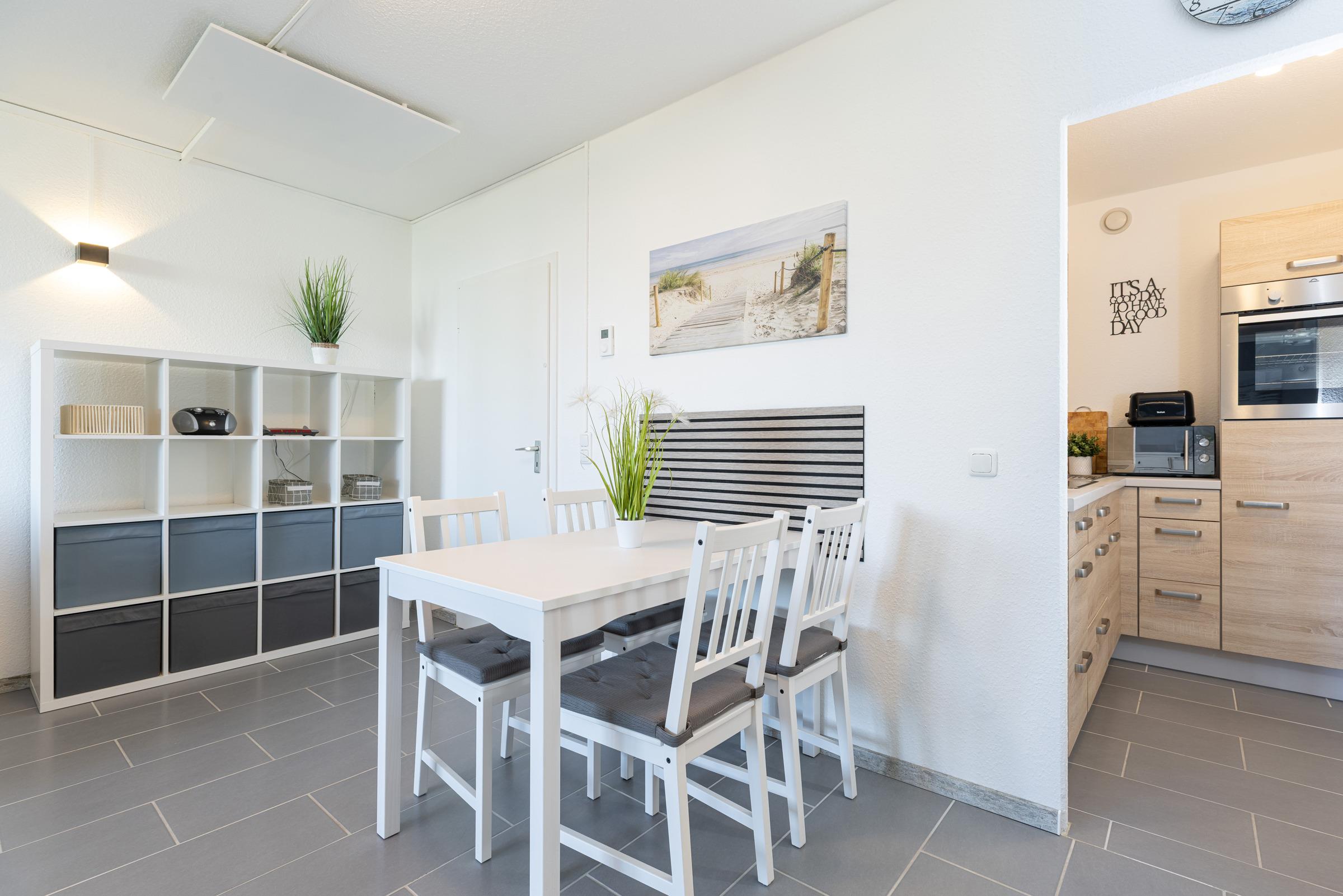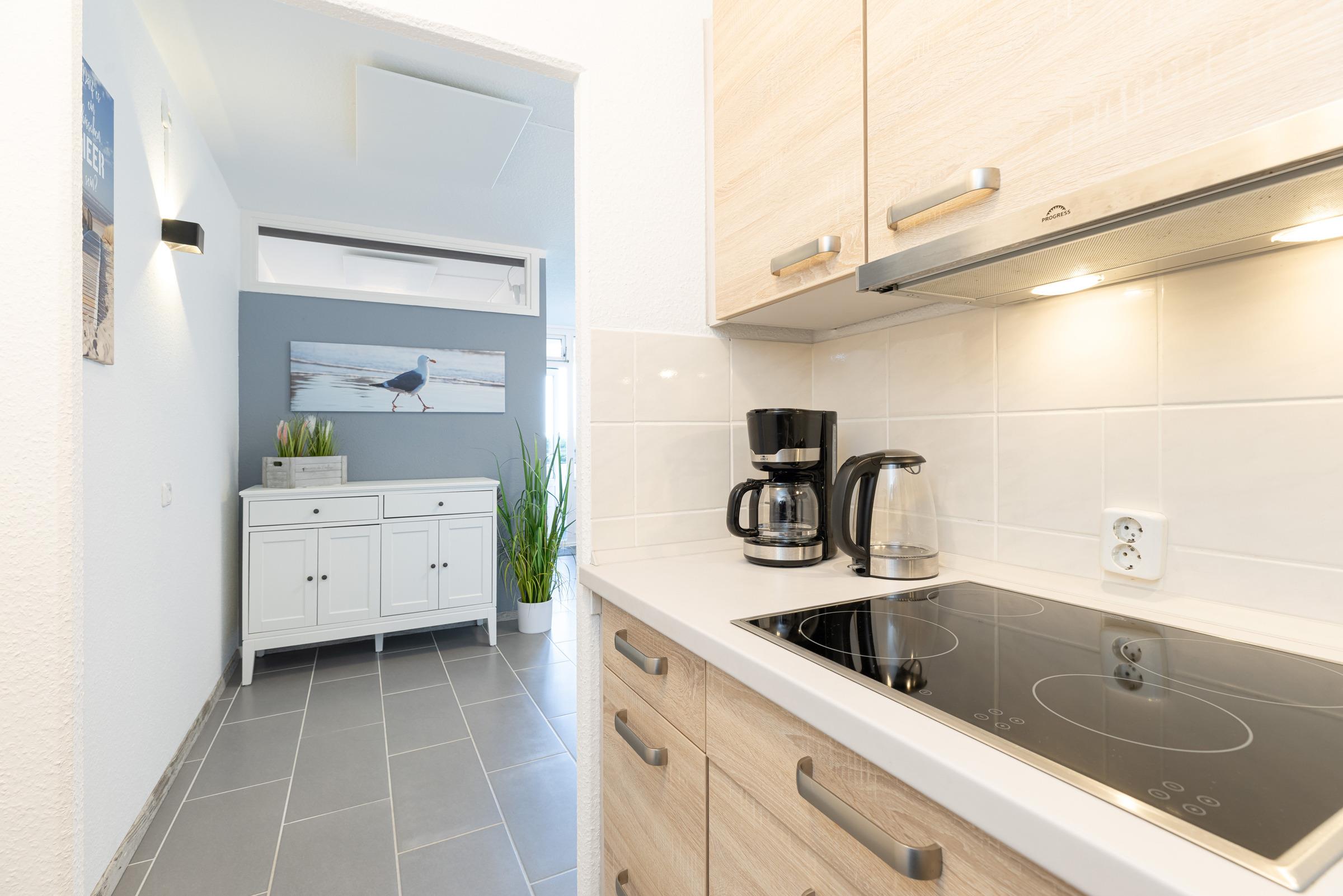 Die offene Küche ist vollständig ausgestattet und lädt dazu ein, leckere Mahlzeiten selbst zuzubereiten. Das moderne Duschbad rundet das Wohlfühlangebot ab und sorgt für einen erfrischenden Start in den Urlaubstag.