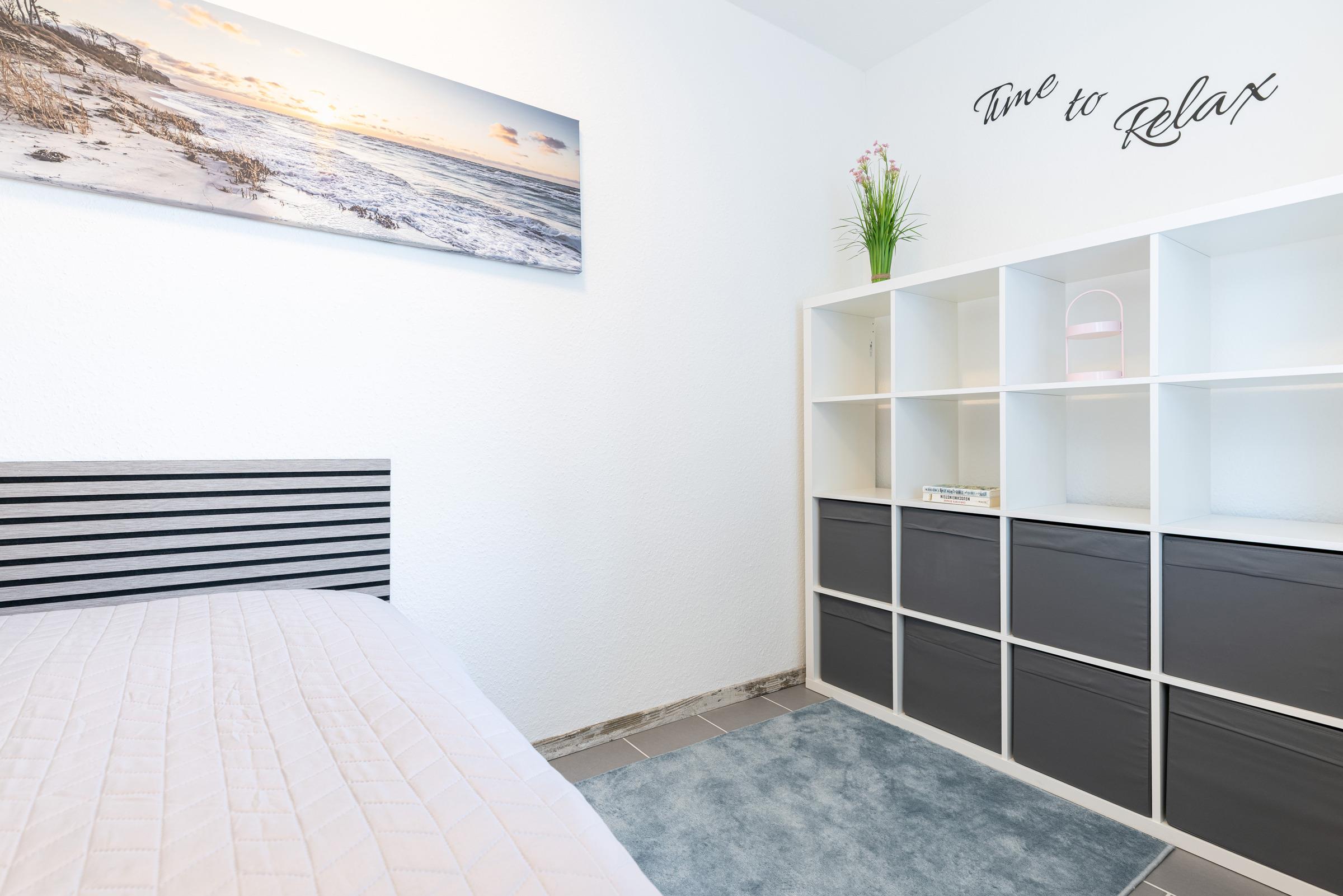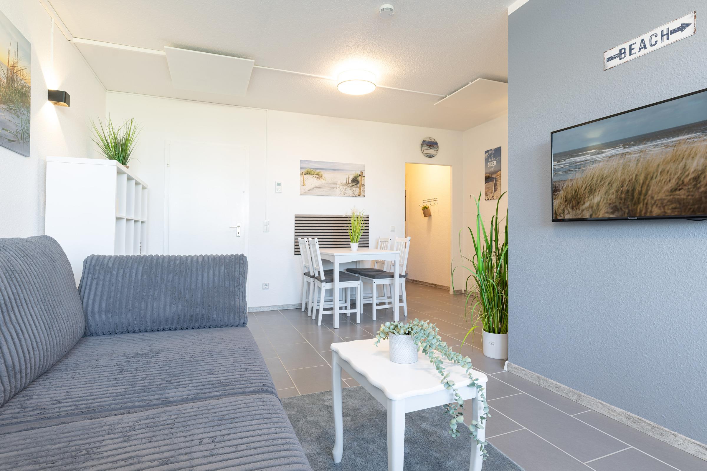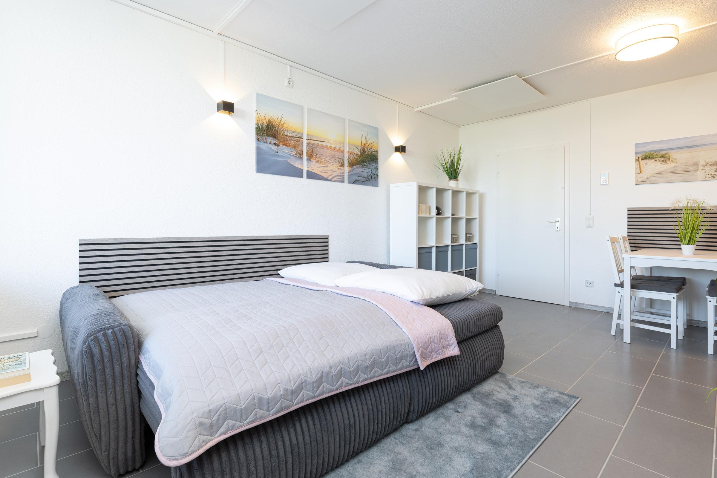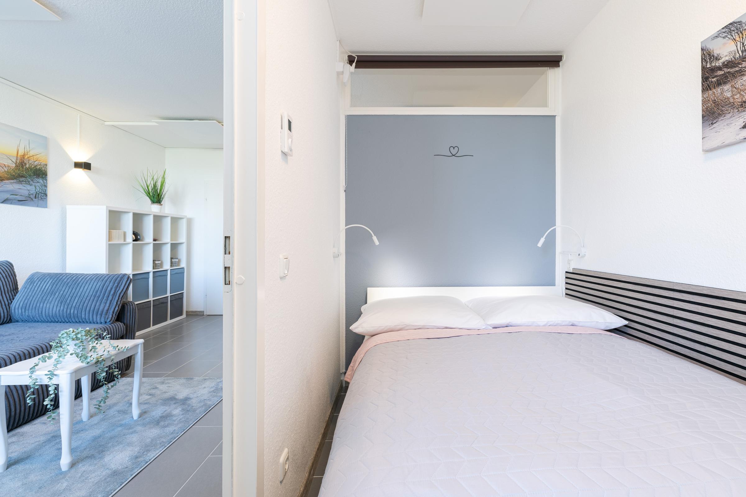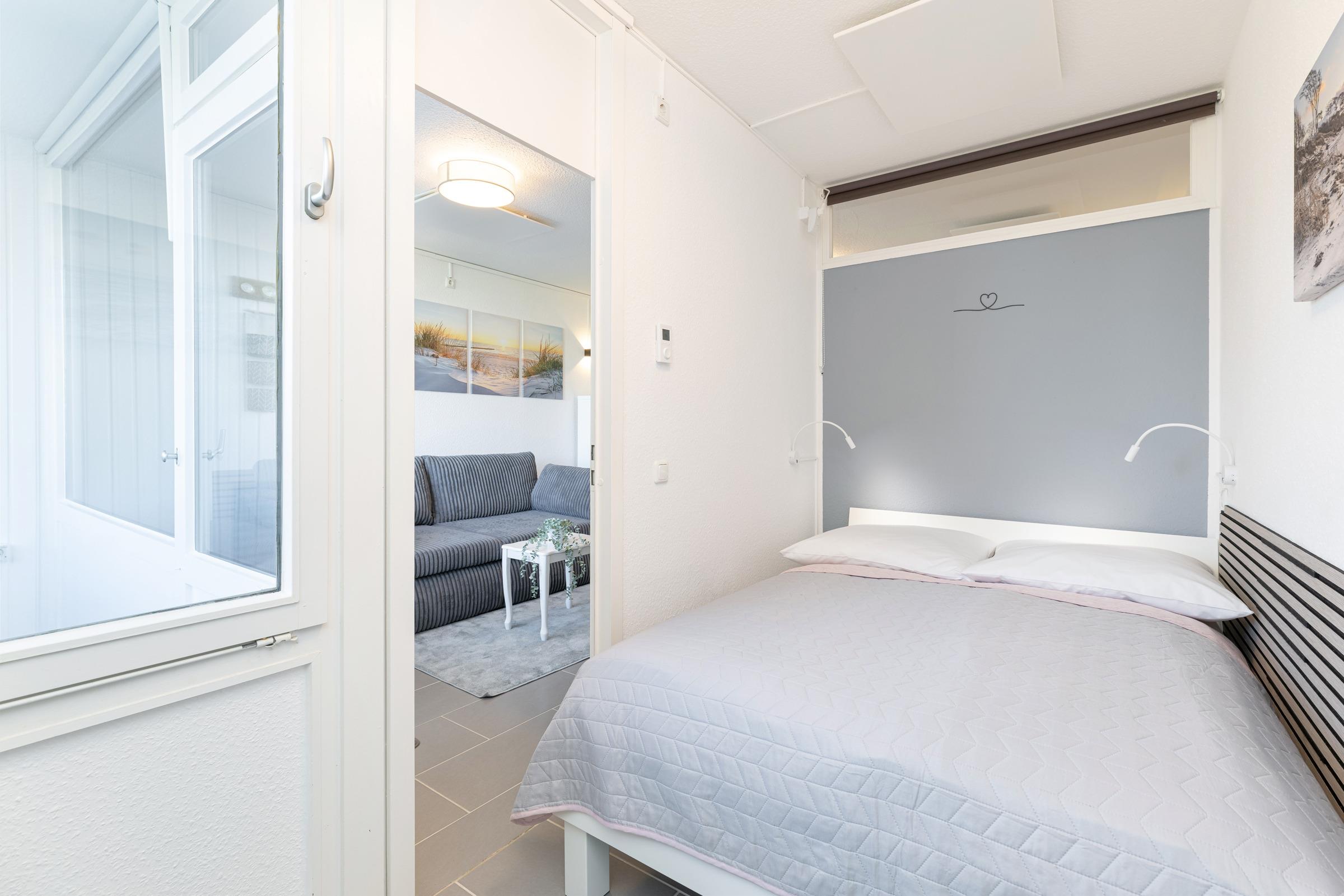 Die modern und klar gestaltete Einrichtung schafft eine angenehme Atmosphäre für Ihren Ostseeurlaub. Der Wohn- und Schlafbereich verfügt über eine gemütliche Schlafcouch (Liegefläche 140 x 200 cm), während im separaten Schlafzimmer ein komfortables Doppelbett (180 x 200 cm) für erholsamen Schlaf sorgt.