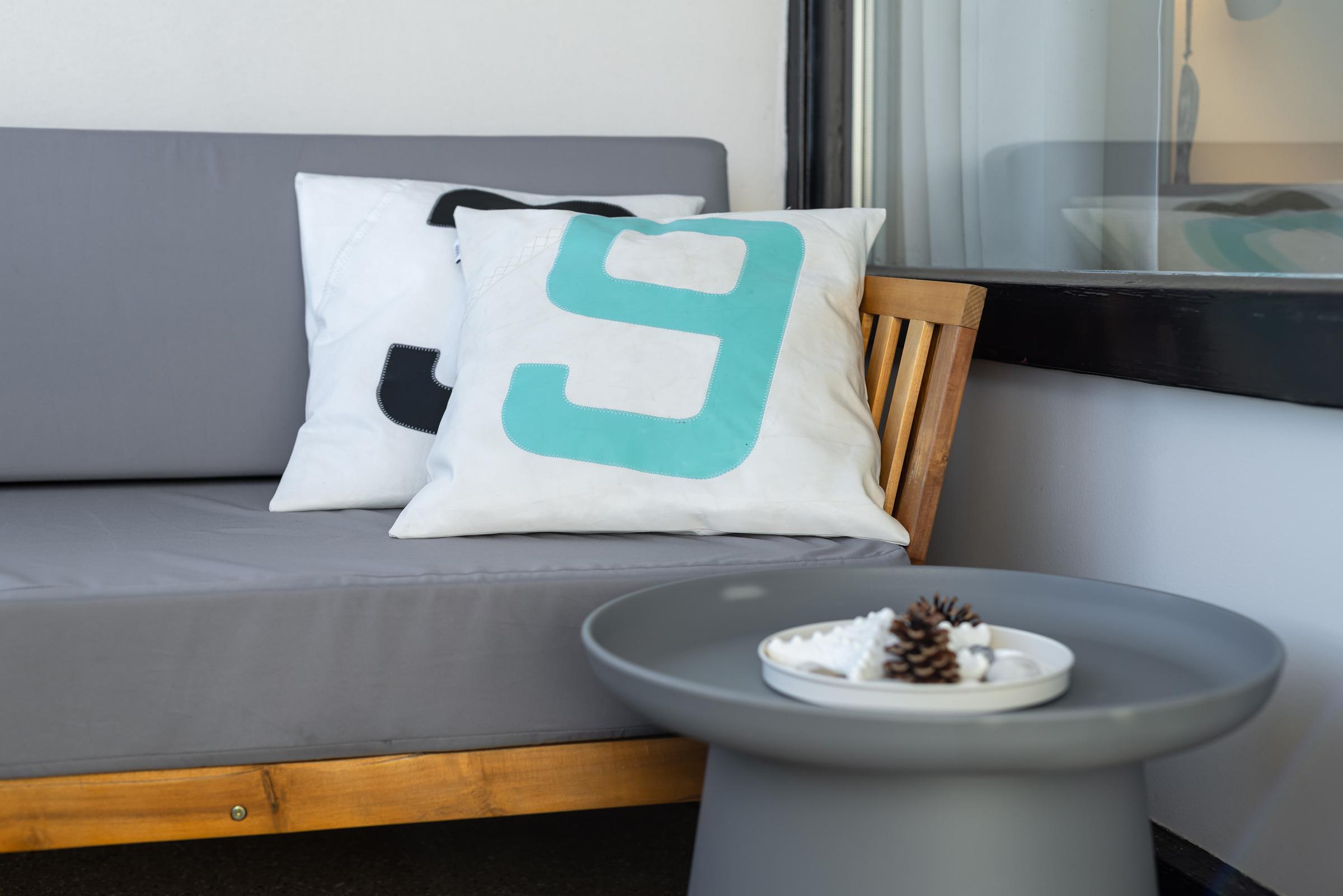 Der offene Wohn- und Schlafbereich ist gemütlich eingerichtet und verfügt über ein komfortables Doppelbett, einen Flachbild-TV sowie eine große Fensterfront, die viel Licht hereinlässt und den Blick auf die traumhafte Landschaft Schleswig-Holsteins freigibt. Vom Wohnbereich aus gelangen Sie auf den Balkon mit Südausrichtung, der mit Sitzmöbeln ausgestattet ist – perfekt, um Tage in der Sonne zu genießen.