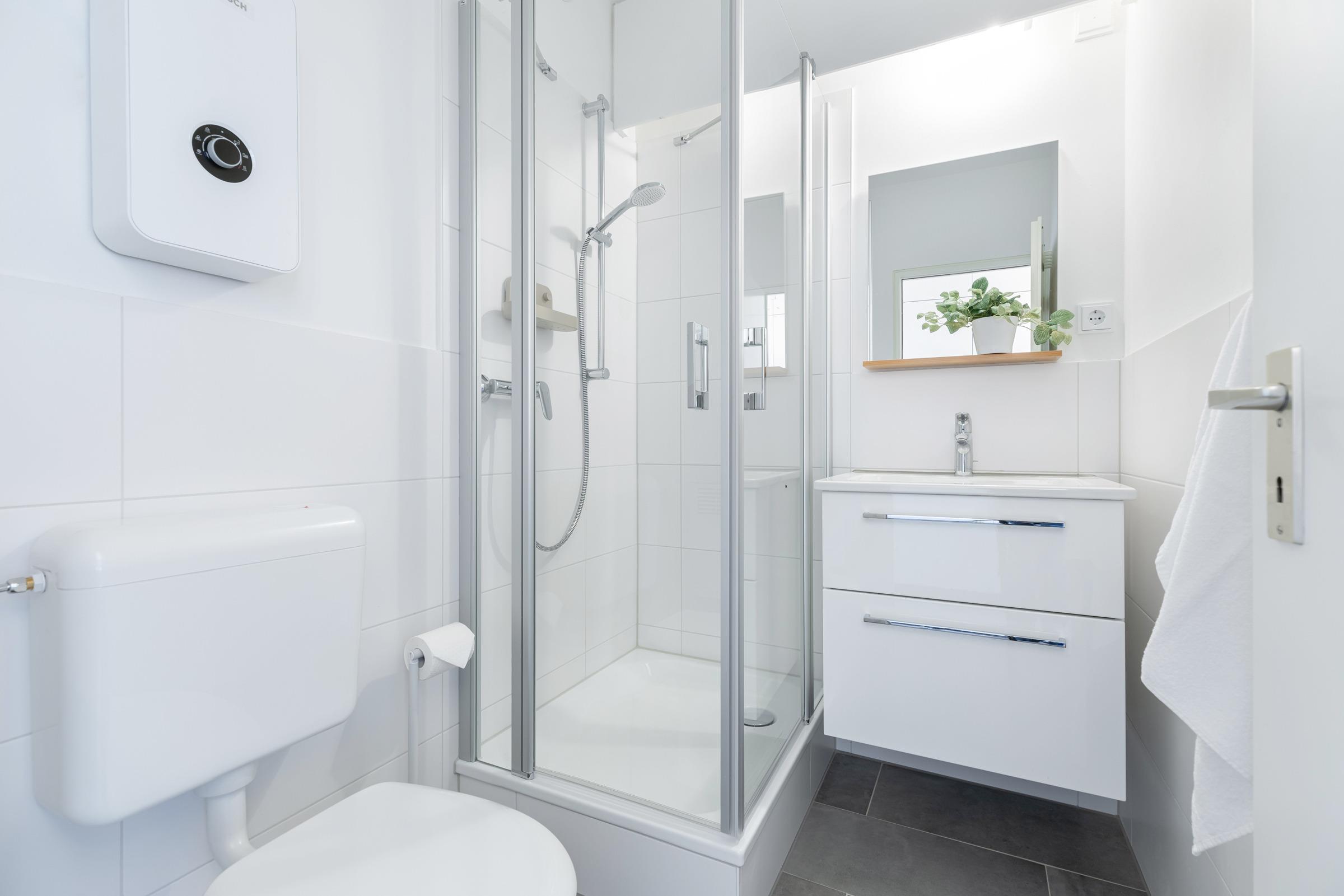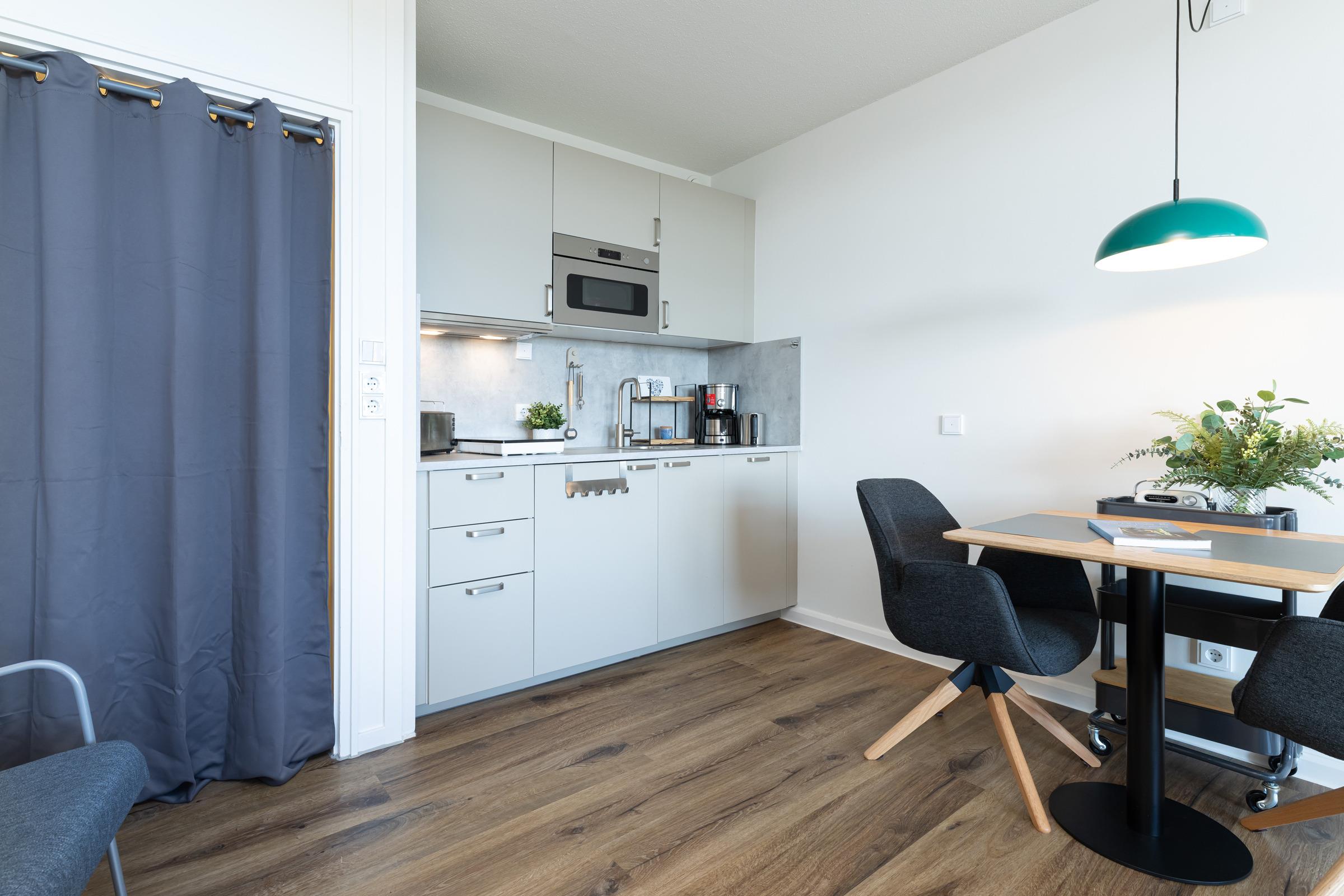 Die moderne Küchenzeile bietet alles, was Sie für die Zubereitung Ihrer Mahlzeiten benötigen: Mikrowelle, Kühlschrank, Kaffeemaschine, Induktionsherd sowie eine Geschirrspülmaschine. Der Essbereich ist harmonisch in den Wohnraum integriert. Das Badezimmer ist mit Dusche, WC und Haartrockner ausgestattet.