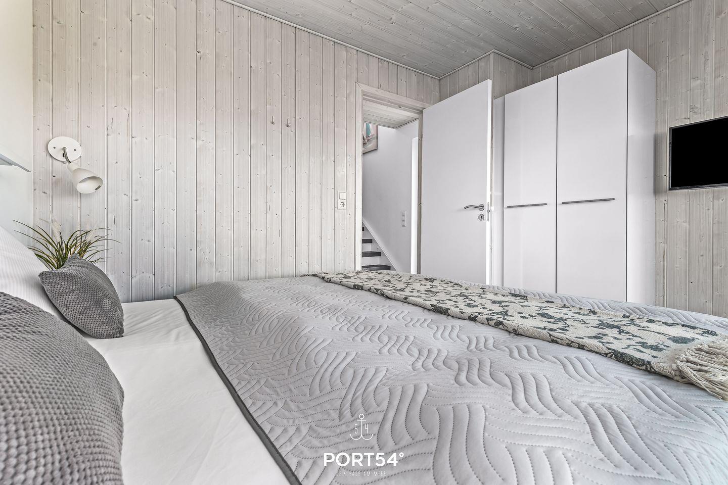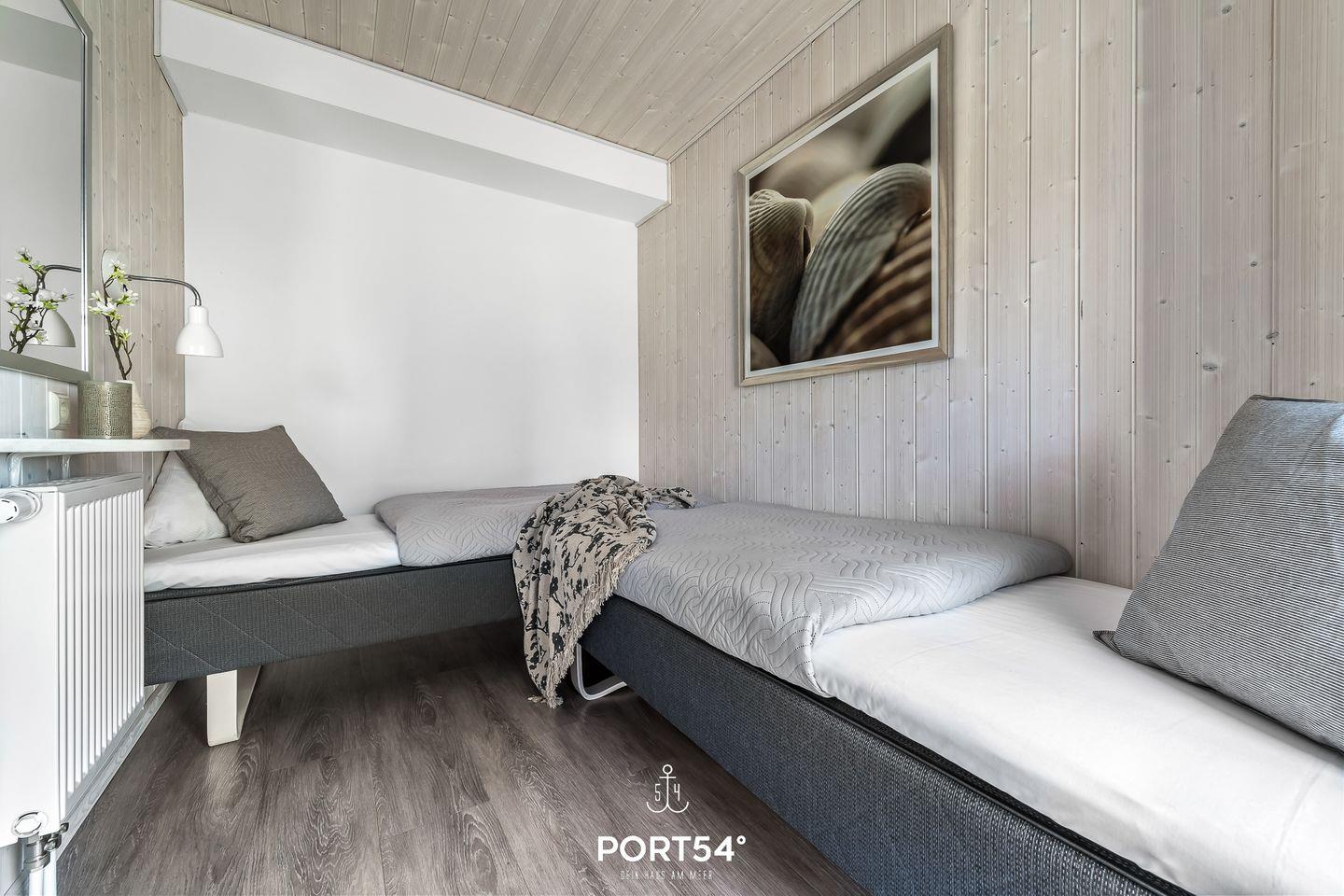 Im Erdgeschoss befinden sich zwei Schlafzimmer. Eines davon bietet zwei zusammengeschobene Einzelbetten (zusammen 180x200cm) und das andere zwei Einzelbetten (je 90x200cm). Eines der Schlafzimmer verfügt über einen TV, sowie beide über verdunkelbare Fenster. Ebenfalls im Erdgeschoss gelegen: das Badezimmer mit angenehmer Fußbodenheizung, ebenerdiger Dusche, WC, Waschbecken und Trockensauna. Das Bedezimmer wurde erst im Jahr 2025 komplett neu renoviert.