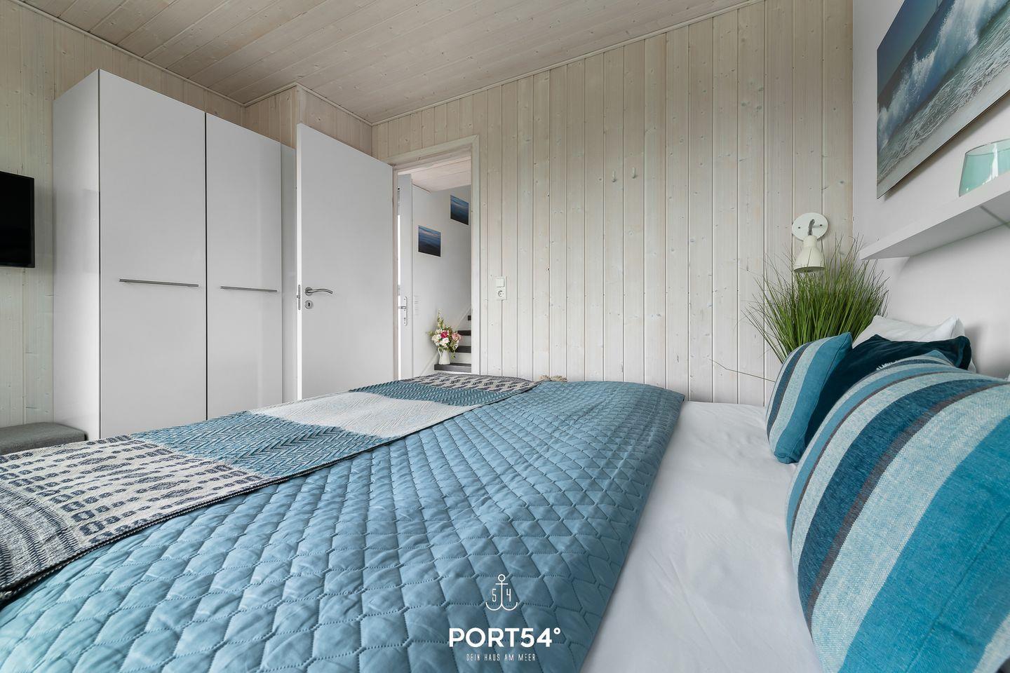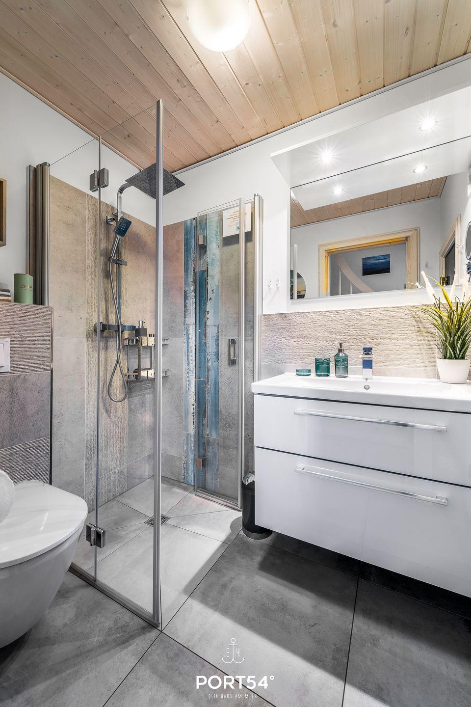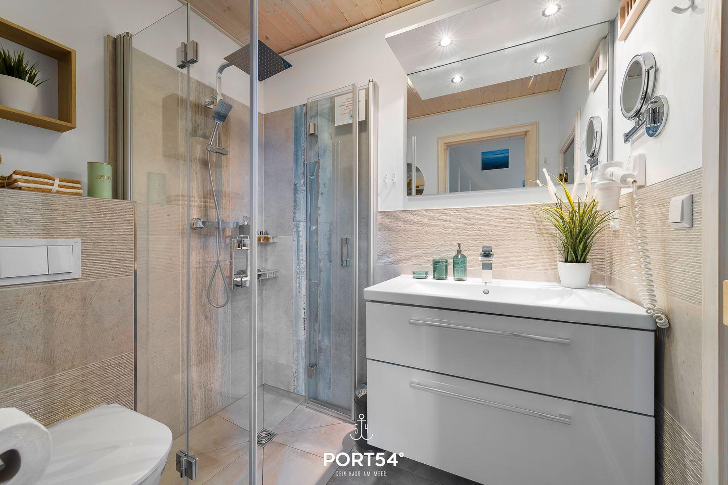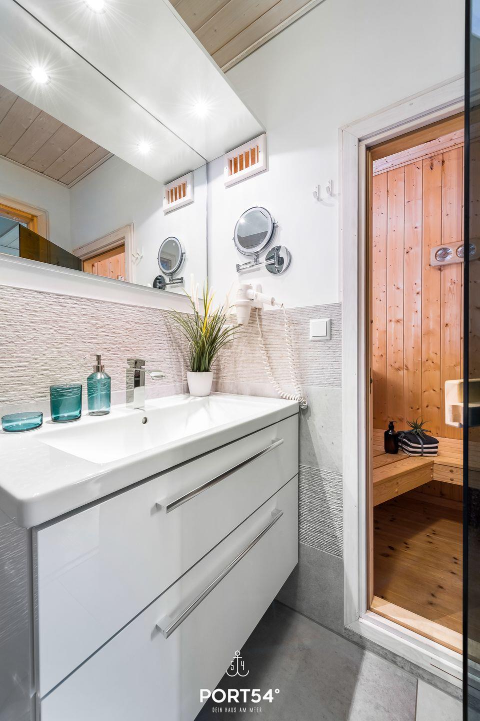 Über die Treppe erreichst du das Erdgeschoß. Das Herzstück im Erdgeschoß ist das kleine aber feine Wellness-Bad mit integrierter Sauna. Freue dich auf eine bodentiefe Regendusche. Ein Badschrank mit Schubladen für deine Kosmetikartikel befindet sich unter dem Waschbecken. Ebenfalls im Erdgeschoss befinden sich zwei Schlafzimmer : Das Erste liegt zur Seeseite. Es verfügt über bodentiefe Fenster, einen wunderschönen Blick in den Strandgarten und eine geräumige Terrasse. Du schläfst in zwei nebeneinander stehenden, bequemen Einzel-Boxspringbetten (zusammen 180x200cm). Im diesem Schlafzimmer befindet sich ein Fernseher, die Fenster verfügen über Verdunkelungsvorhänge