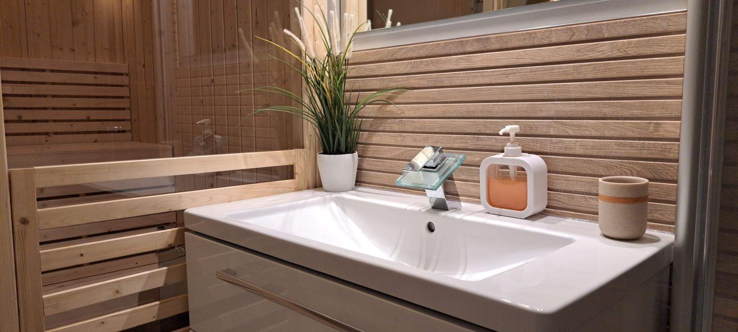 Über die Treppe erreichst du das Erdgeschoß. Das Herzstück im Erdgeschoß ist das kleine aber feine Wellness-Bad mit einer Trockensauna. Freu dich auf die bodentiefe Regendusche. Ein Badschrank mit Schubladen für Ihre Kosmetikartikel befindet sich unter dem Waschbecken. Ebenfalls im Erdgeschoss befinden sich zwei Schlafzimmer: Das Erste liegt zur Seeseite. Es verfügt über bodentiefe Fenster, einen wunderschönen Blick in den Strandgarten und eine geräumige Terrasse. Du schläfst in zwei nebeneinander stehenden, bequemen Einzel-Boxspringbetten (zusammen 180x200cm). Im diesem Schlafzimmer befindet sich ein Fernseher, die Fenster verfügen über Verdunkelungsvorhänge für einen ungestörten Schlaf. Das andere Schlafzimmer verfügt ebenfalls über zwei Einzel- Boxspringbetten (je 90x200cm), sie stehen über Eck. Ein Verdunkelungsrollo sorgt für erholsamen Schlaf. Dieses Zimmer hat eine große Tür, die nach draußen auf die Holzdielen führt. Im Außenbereich befinden sich mehrere Sitzmöglichkeiten mit und ohne Tisch, ein Sonnenschirm, Sonnenliegen sowie ein hochwertiger Holzkohlegrill.