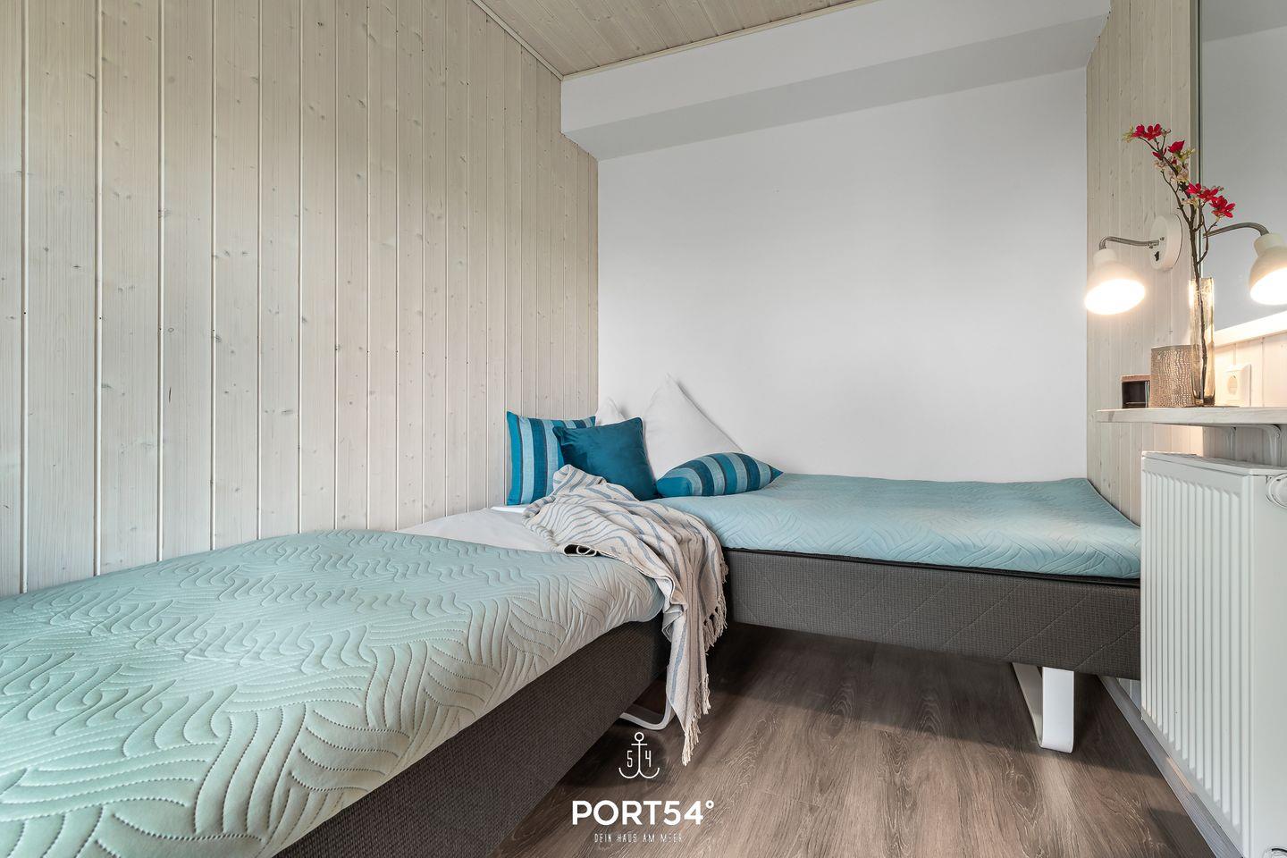 Im Erdgeschoss befinden sich zwei Schlafzimmer, wovon eins mit zusammengeschobenen Einzelbetten (zusammen 180x200cm) und das andere mit zwei Einzelbetten (je 90x200cm) ausgestattet ist. Eines der Schlafzimmer verfügt über einen TV, sowie beide über verdunkelbare Fenster. Ebenfalls im Erdgeschoss gelegen: das Badezimmer mit angenehmer Fußbodenheizung, ebenerdiger Dusche, WC, Waschbecken und Trockensauna.