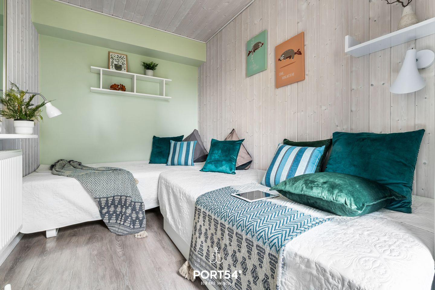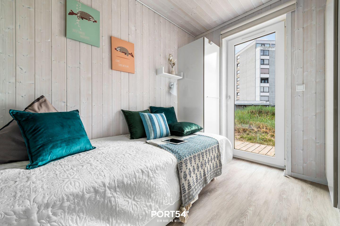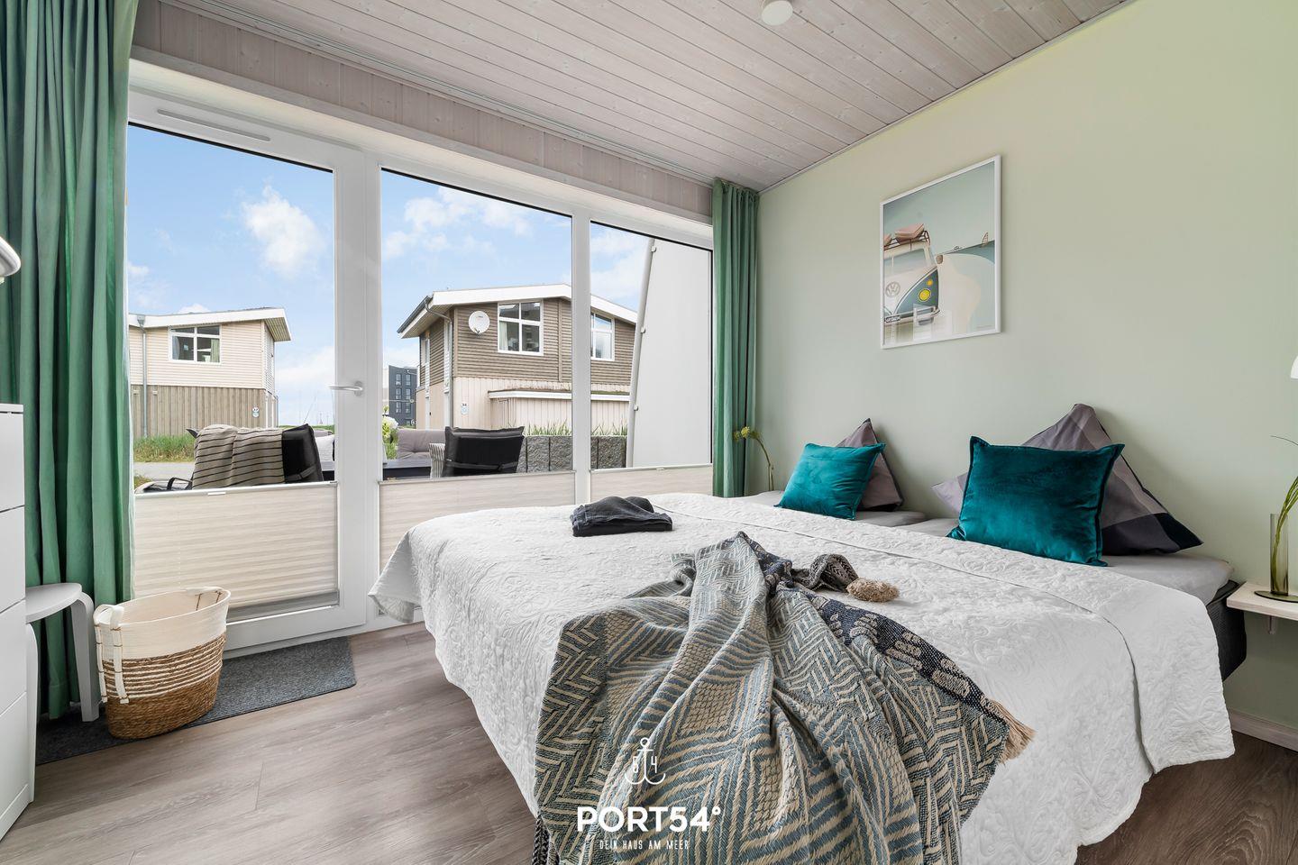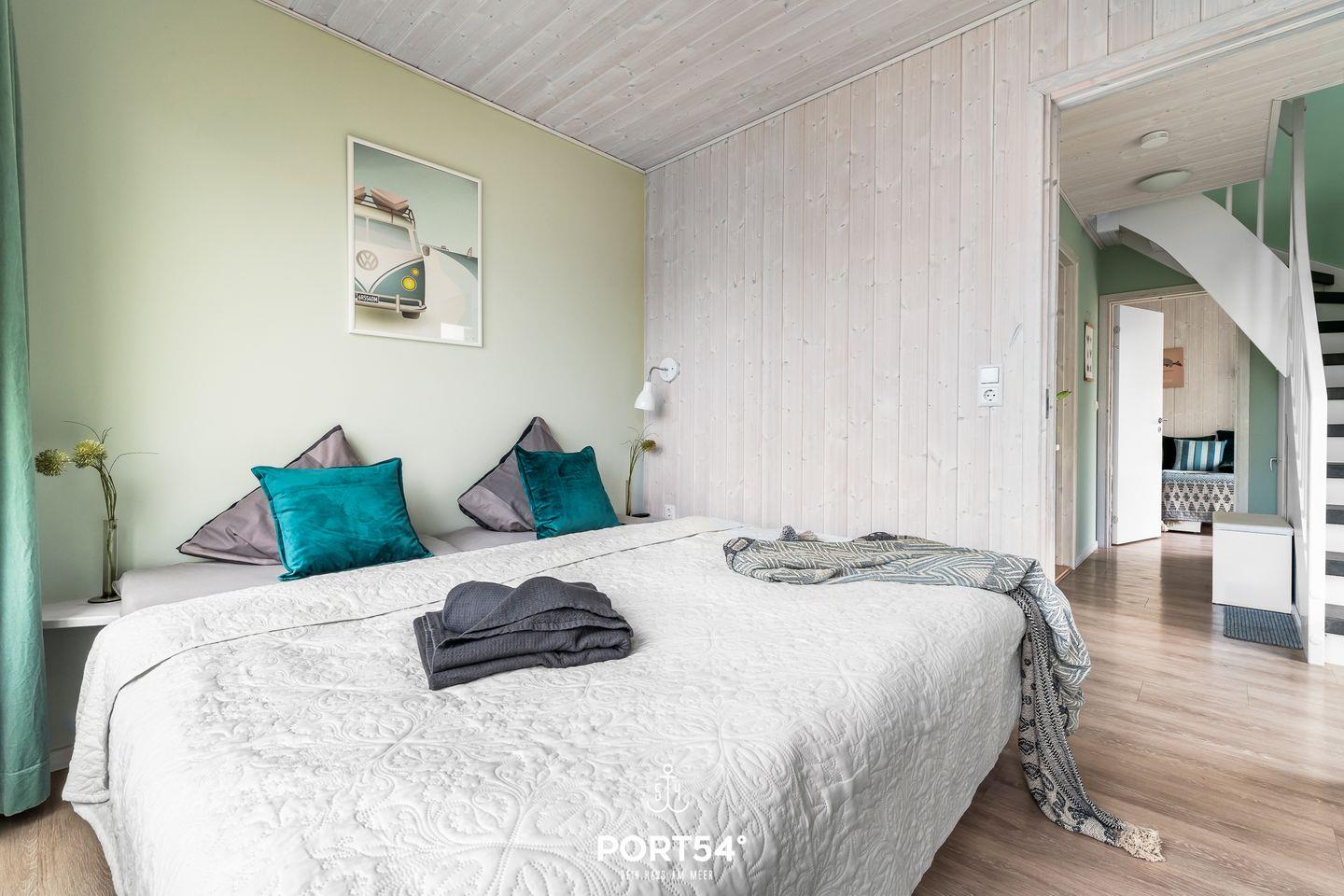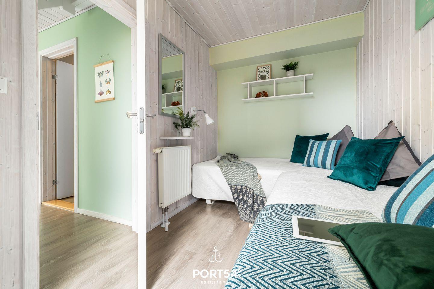 Zwei Schlafzimmer mit hochwertigen Vinylböden bieten insgesamt vier Erwachsenen bequeme Schlafmöglichkeiten. Die Ausstattung ist allergikerfreundlich, die gesamte Unterkunft ist als Nichtraucherhaus konzipiert und eignet sich auch für Babys und Kinder. Für Familien ist das Ferienhaus daher besonders attraktiv – es steht ein Wäscheständer bereit, und die Unterkunft befindet sich in einer Ferienanlage mit kurzen Wegen zu Spielplätzen, Einkaufsmöglichkeiten, Bäcker in fußläufiger Entfernung, Ärzten und weiteren Einrichtungen des täglichen Bedarfs.