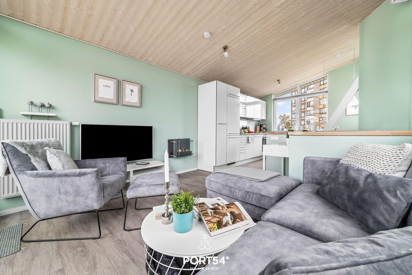 Für entspannte Stunden sorgt der Wohnbereich mit hochwertigem Sofa, Sessel und Sofaecke sowie großen TV-Gerät (50 Zoll), Blu-ray-, DVD- und CD-Player, einer HiFi-Anlage und kostenlosem Highspeed-Internet mit 300 Mbit/s über Glasfaser. Mit der eingebauten Klimaanlage im Wohnbereich behältst auch an warmen Sommertagen einen kühlen Kopf. An kühleren Abenden sorgt ein Ethanol-Kaminofen für behagliches Ambiente.
