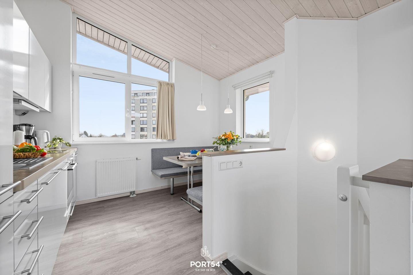 Die offen zum klimatisierten Wohnzimmer gestaltete Küche ist mit Ceranherd, Mikrowelle, Backofen, Spülmaschine, Kaffeemaschine sowie einer Nespresso-Espressomaschine voll ausgestattet. Ein extra Gefrierschrank, Wasserkocher, Toaster, Mixer und umfangreiche Küchenutensilien stehen ebenso zur Verfügung. Ein Essbereich mit Esstisch lädt zu gemeinsamen Mahlzeiten ein.