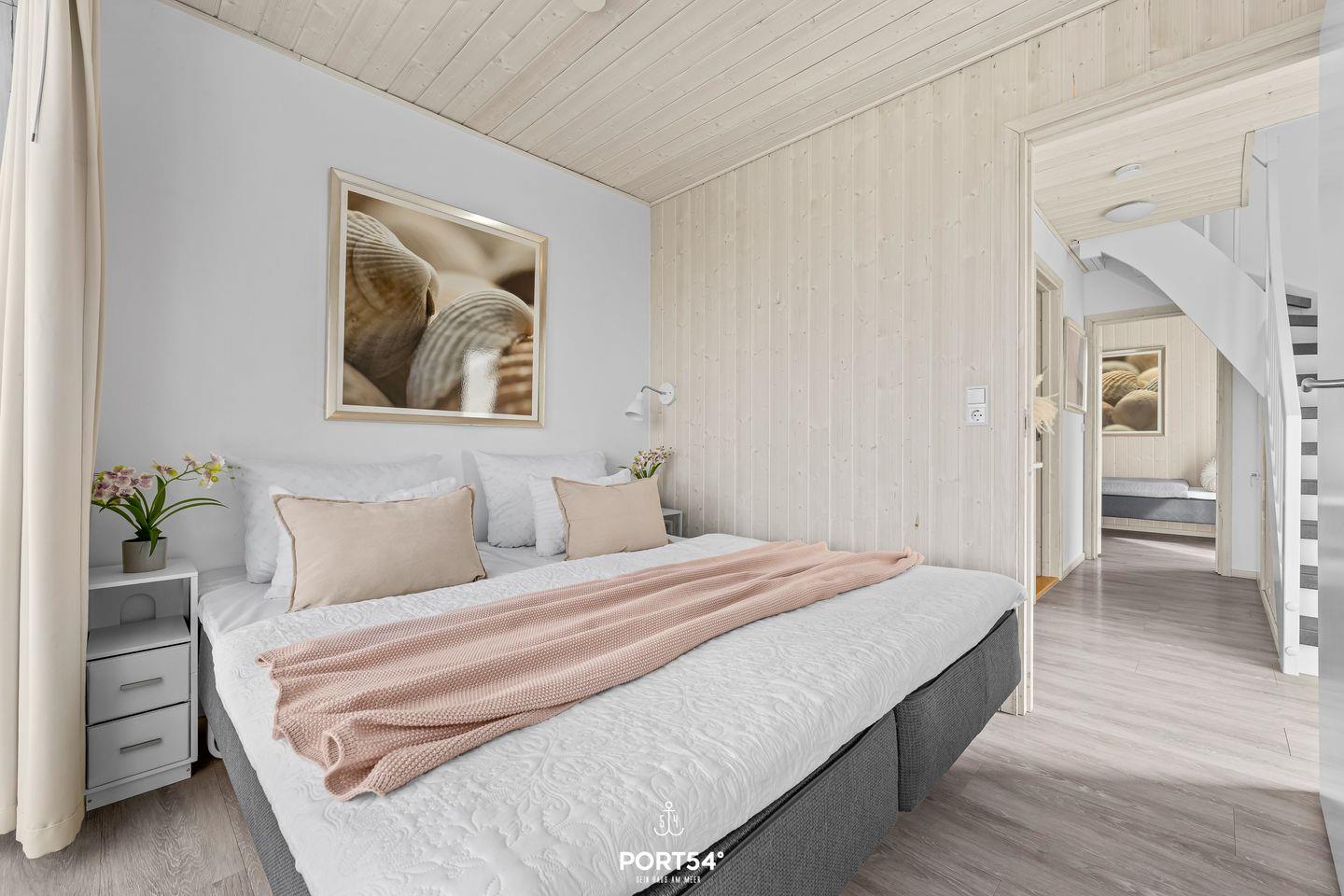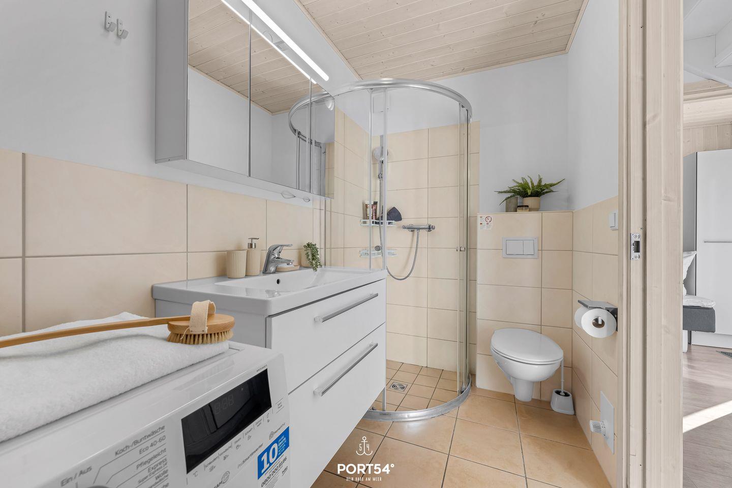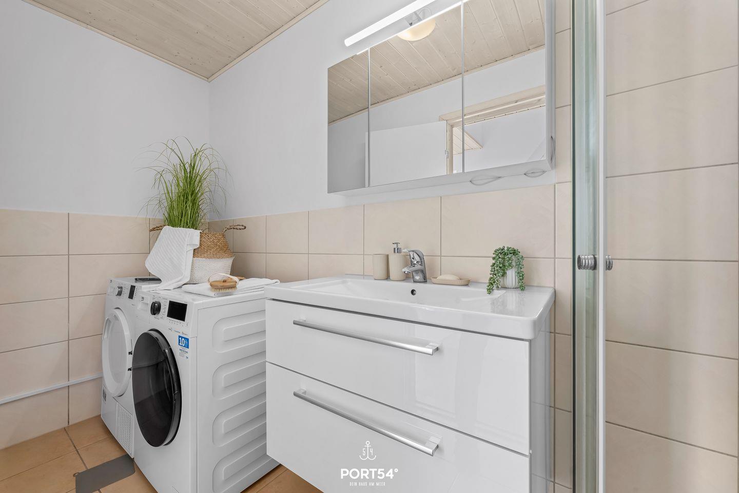 Das Haus bietet zwei separate Schlafzimmer und einen weiteren Schlafbereich (Schlafcouch im Wohnzimmer) mit insgesamt bis zu sechs Schlafmöglichkeiten. Im modern gestalteten Badezimmer befindet sich eine bodengleiche Dusche, Fußbodenheizung, WC, Waschbecken und Haartrockner. Waschmaschine und Trockner stehen zur Eigennutzung bereit – ideal für längere Aufenthalte oder Familien mit Kindern. Zur weiteren Ausstattung zählen Staubsauger, Wäscheständer und Garderobe.