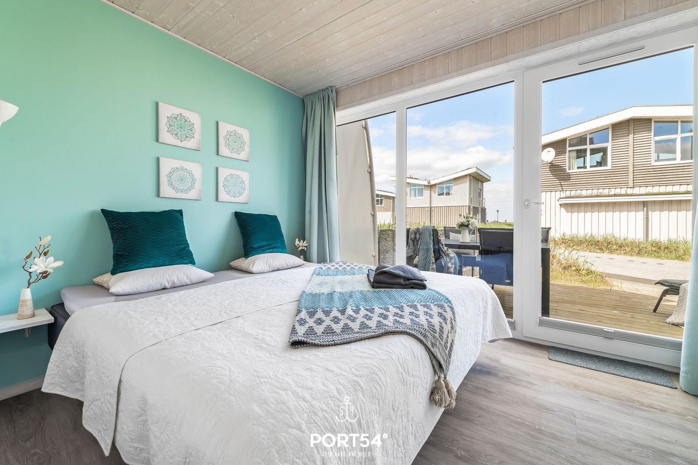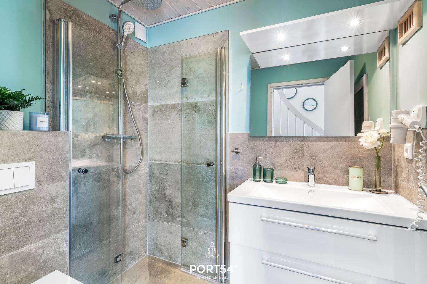 Im Erdgeschoss befinden sich zwei Schlafzimmer, wovon eins mit Doppelbett (180x200cm) und das andere mit zwei Einzelbetten (je 90x200cm) ausgestattet ist. Eines der Schlafzimmer verfügt über einen TV, sowie beide über verdunkelbare Fenster. Ebenfalls im Erdgeschoss gelegen: das Badezimmer mit angenehmer Fußbodenheizung, ebenerdiger Dusche, WC, Waschbecken und finnische Sauna.