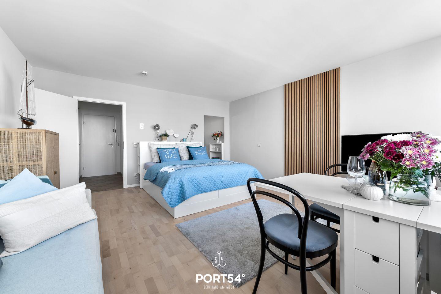 Die Wohnung befindet sich im 6. Stock und beeindruckt mit einem außergewöhnlich guten Meerblick, der Ihnen bereits beim Aufwachen den Atem rauben wird. Genießen Sie die frische Meeresluft, während Sie den Sonnenaufgang über der Ostsee beobachten. Die lichtdurchfluteten Räumlichkeiten sind geschmackvoll eingerichtet und bieten Ihnen eine gemütliche Atmosphäre. Der offene Wohnbereich mit einer komfortablen Sofaecke (Schlafcouch) lädt zum Entspannen ein und ist mit einem 48-Zoll-Fernseher sowie einer HiFi-Anlage ausgestattet. Hier können Sie sich nach einem aufregenden Tag entspannen und gemeinsam Filme schauen oder Musik hören.