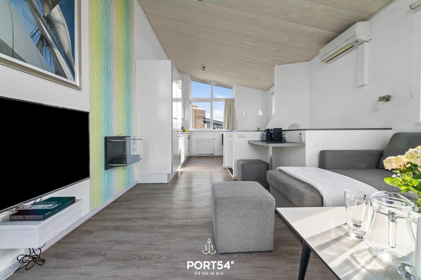 Im ersten Obergeschoss erwartet dich ein offener, lichtdurchfluteter Wohn- und Essbereich mit angrenzender vollausgestatteter Küche. Der gemütliche Wohnbereich bietet ausreichend Sitzgelegenheiten, einen 50-Zoll-SmartTV, einen Bioethanol-Kamin und den Zugang zum Balkon. Die vorhandene Klimaanlage verspricht ein angenehmes Innenraumklima zu jeder Zeit.