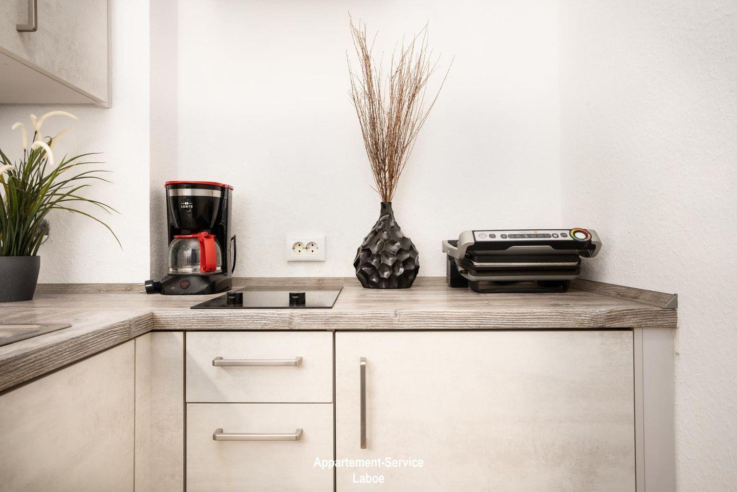 Die kleine, praktische Küche mit Essplatz lädt dazu ein, dir auch im Urlaub leckere Mahlzeiten zu zaubern. Ob ein schnelles Frühstück oder ein gemütliches Abendessen – hier lässt sich alles unkompliziert zubereiten und genießen. Deine Jacken und Schuhe finden ihren Platz im Flur mit Garderobe und dank des direkten Zugangs zur Terrasse kannst du die frische Ostseeluft in vollen Zügen genießen.