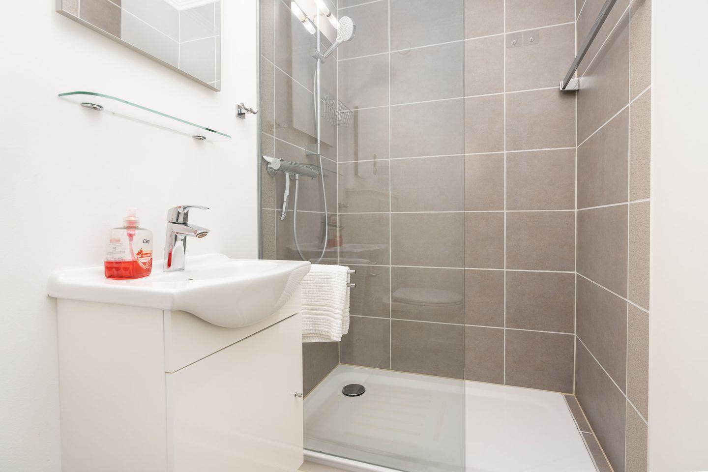 Die gut ausgestattete Küche grenzt an den Essbereich, wo du deine Mahlzeiten in geselliger Runde genießen kannst. Ein kleiner Flur mit Garderobe sorgt dafür, dass alles seinen Platz hat, und das Badezimmer mit Dusche (niedriger Einstieg) und WC bietet dir modernen Komfort.