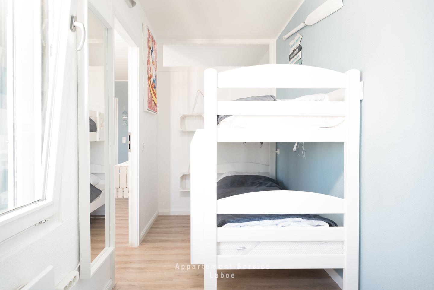 Im kombinierten Wohn- und Schlafzimmer kannst du es dir auf der bequemen Sitzgruppe gemütlich machen oder im komfortablen Doppelbett entspannte Nächte genießen. Für deine Mitreisenden – ob groß oder klein – gibt es ein separates Schlafzimmer mit zwei Einzelbetten in Stockbettform, das gemütlich und praktisch zugleich ist.