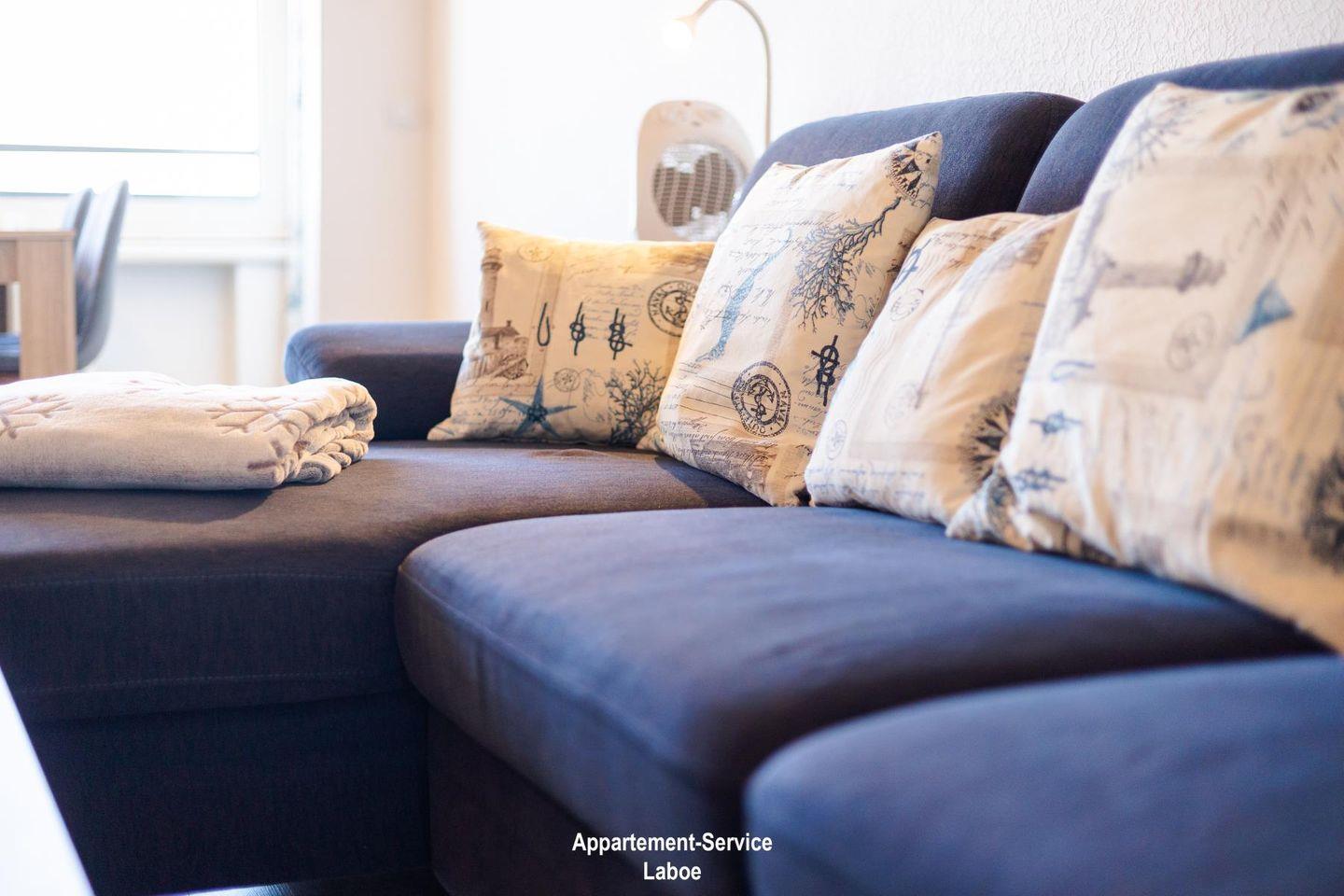 Das Apartment ist ideal für alle, die eine entspannte Auszeit mit maritimem Flair suchen. Der kombinierte Wohn- und Schlafraum lädt zum Verweilen ein und bietet dank des großen Fensters einen traumhaften Blick aufs Wasser. Innenplissees sorgen dafür, dass du es dir abends gemütlich machen kannst. Das separate Schlafzimmer mit komfortablem Doppelbett garantiert erholsame Nächte.