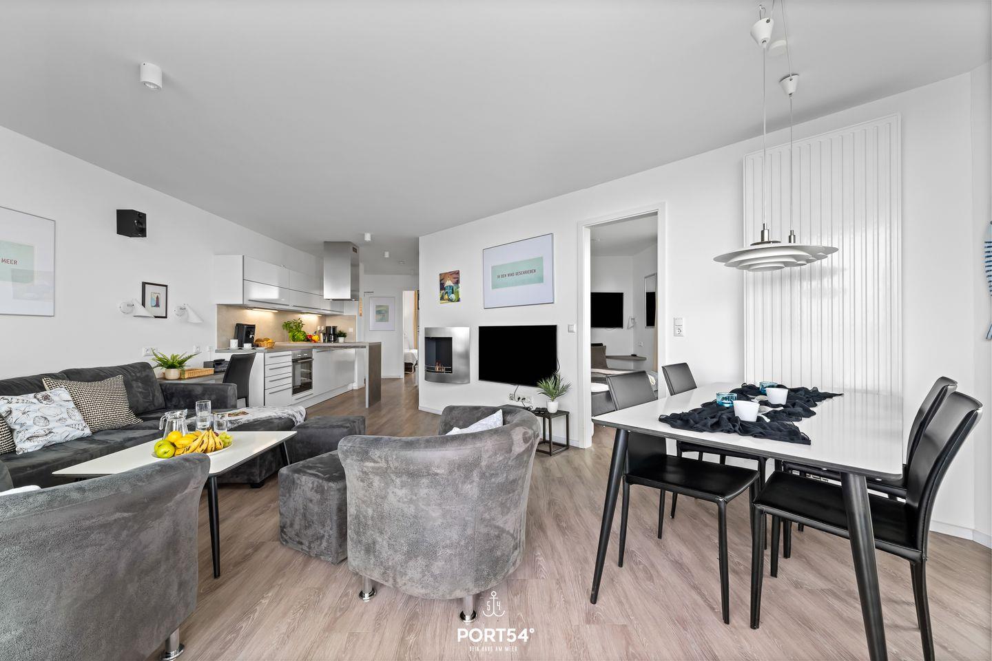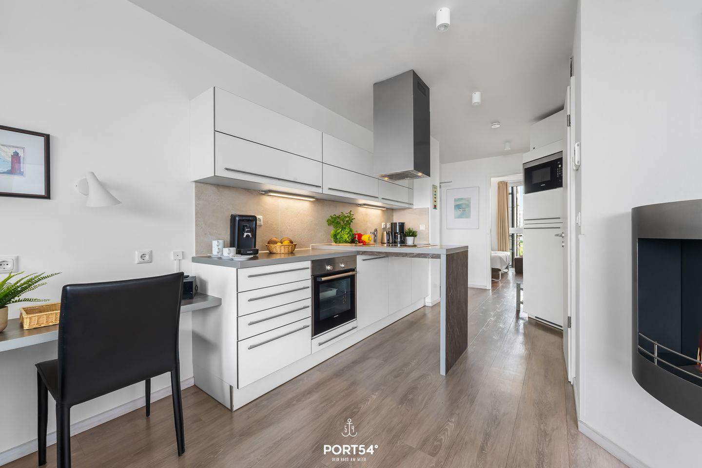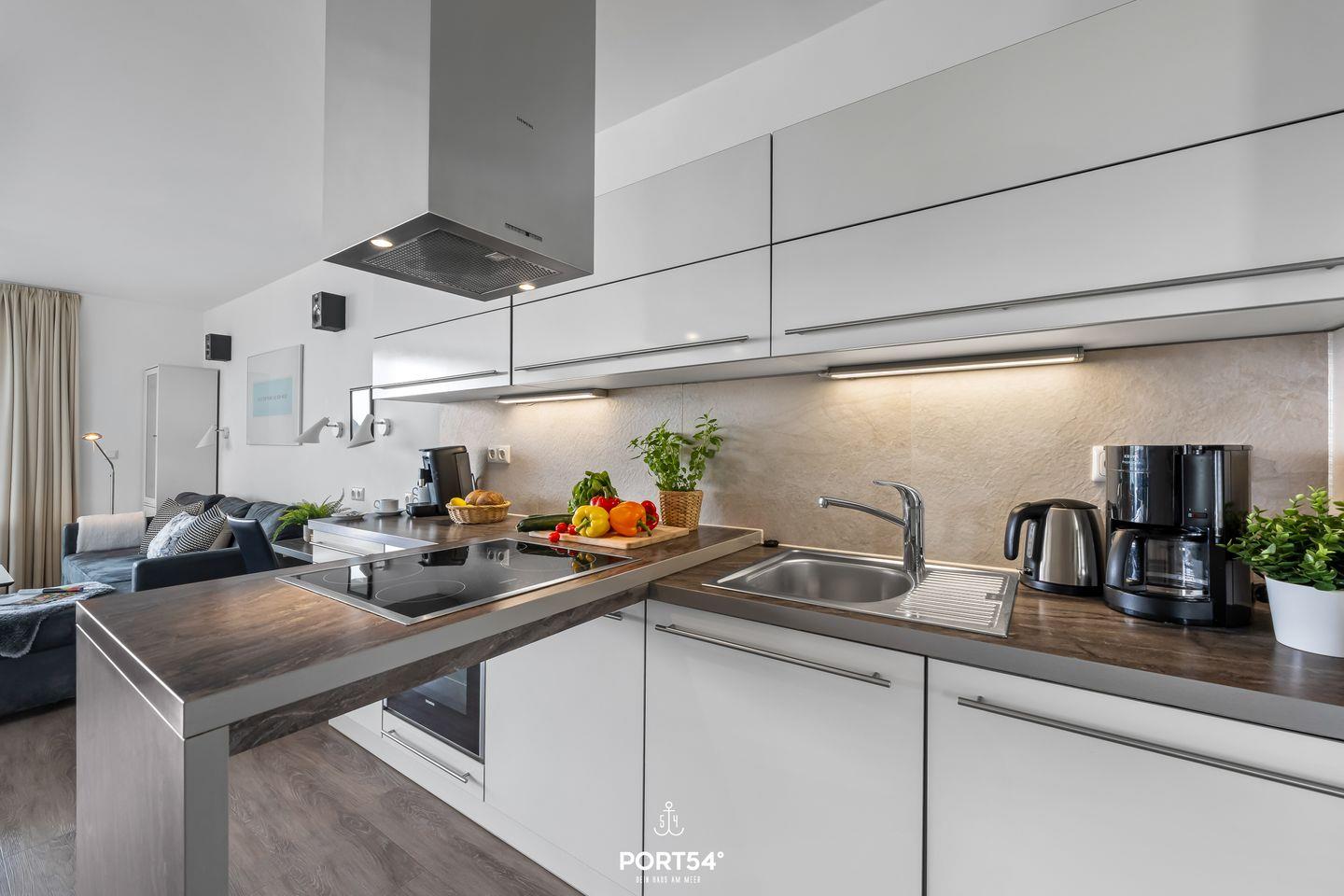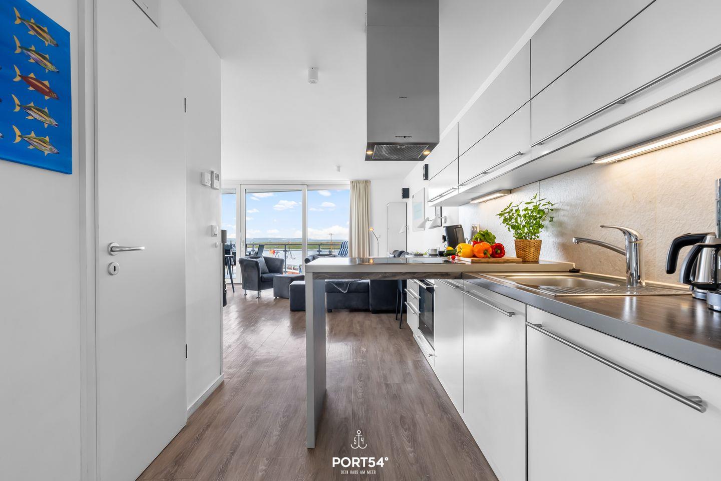 Das Herzstück der Wohnung bildet der offene Wohnbereich, der vom Wohn- und Esszimmer bis zur modernen Küche reicht. Hier können Sie gemeinsame Mahlzeiten zubereiten, während Sie die wunderschöne Aussicht auf das Meer durch die großen Fenster genießen. Ein besonderes Highlight stellt zudem die Terrasse da, die mit 24 qm Größe und umlaufend um die Wohnung verläuft, viele Möglichkeiten bietet, die frische Meeresluft im Freien zu genießen. Die voll ausgestattete Küche lässt keine Wünsche offen und bietet Ihnen alles, was Sie für Ihren Aufenthalt benötigen: von der Spülmaschine bis hin zur Espressomaschine, um Ihren Morgen mit einer köstlichen Tasse Kaffee zu beginnen.