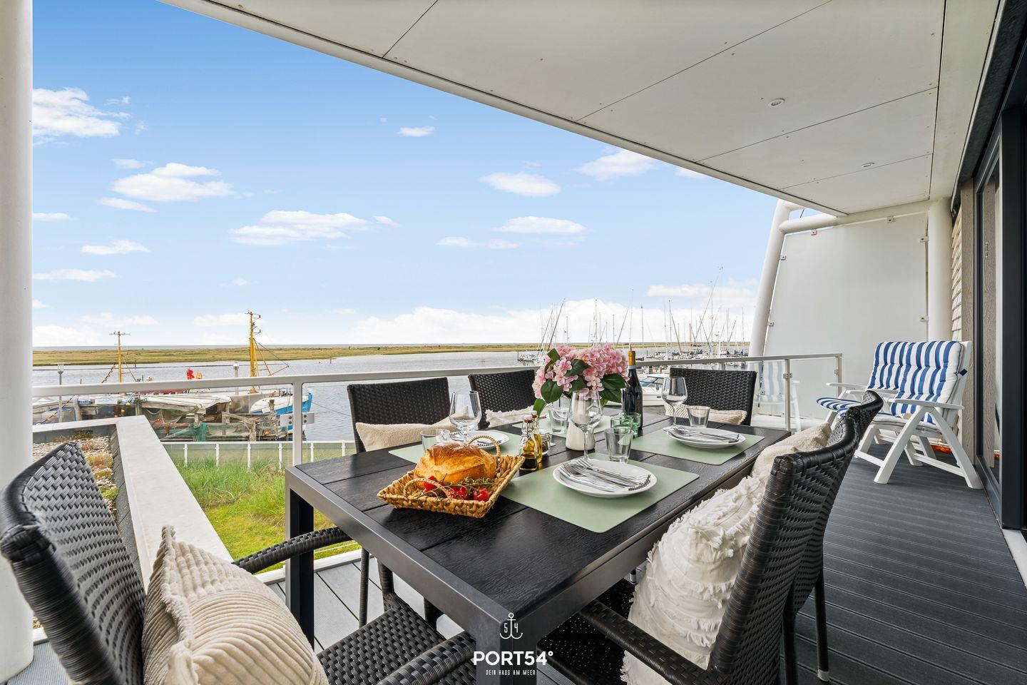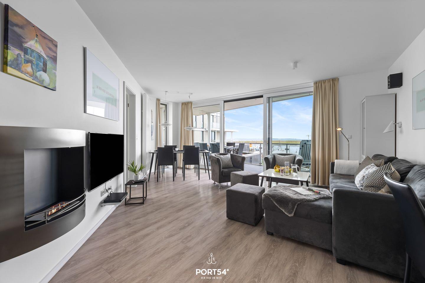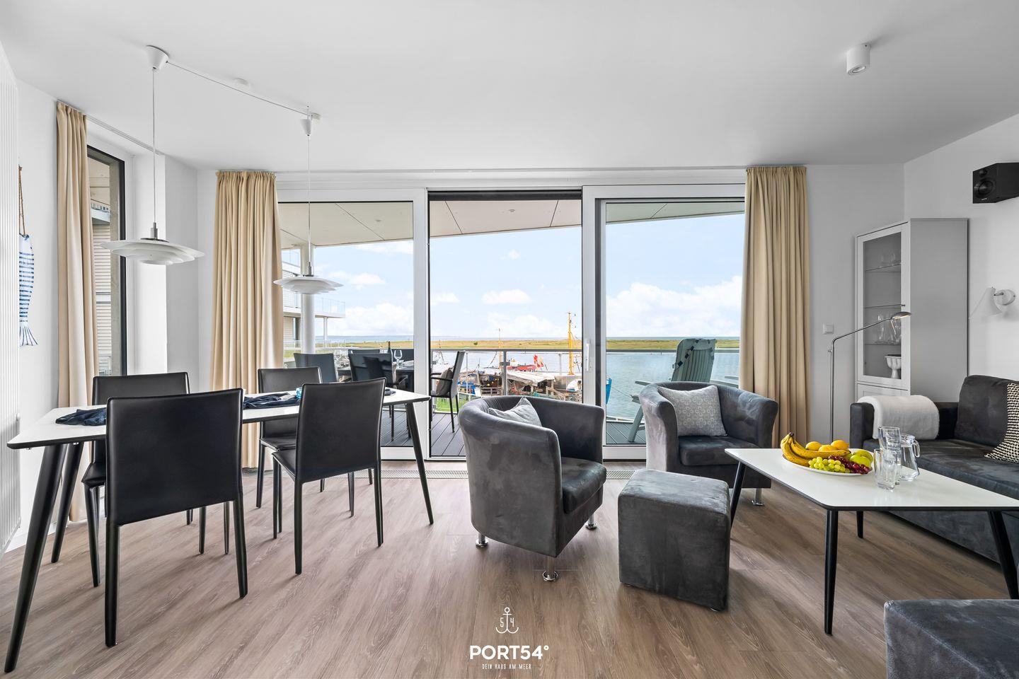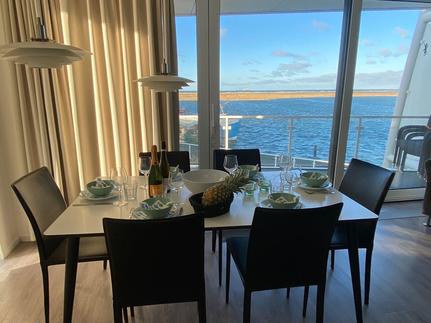 Das Herzstück der Wohnung bildet der offene Wohnbereich, der vom Wohn- und Esszimmer bis zur modernen Küche reicht. Hier können Sie gemeinsame Mahlzeiten zubereiten, während Sie die wunderschöne Aussicht auf das Meer durch die großen Fenster genießen. Ein besonderes Highlight stellt zudem die Terrasse da, die mit 24 qm Größe und umlaufend um die Wohnung verläuft, viele Möglichkeiten bietet, die frische Meeresluft im Freien zu genießen. Die voll ausgestattete Küche lässt keine Wünsche offen und bietet Ihnen alles, was Sie für Ihren Aufenthalt benötigen: von der Spülmaschine bis hin zur Espressomaschine, um Ihren Morgen mit einer köstlichen Tasse Kaffee zu beginnen.