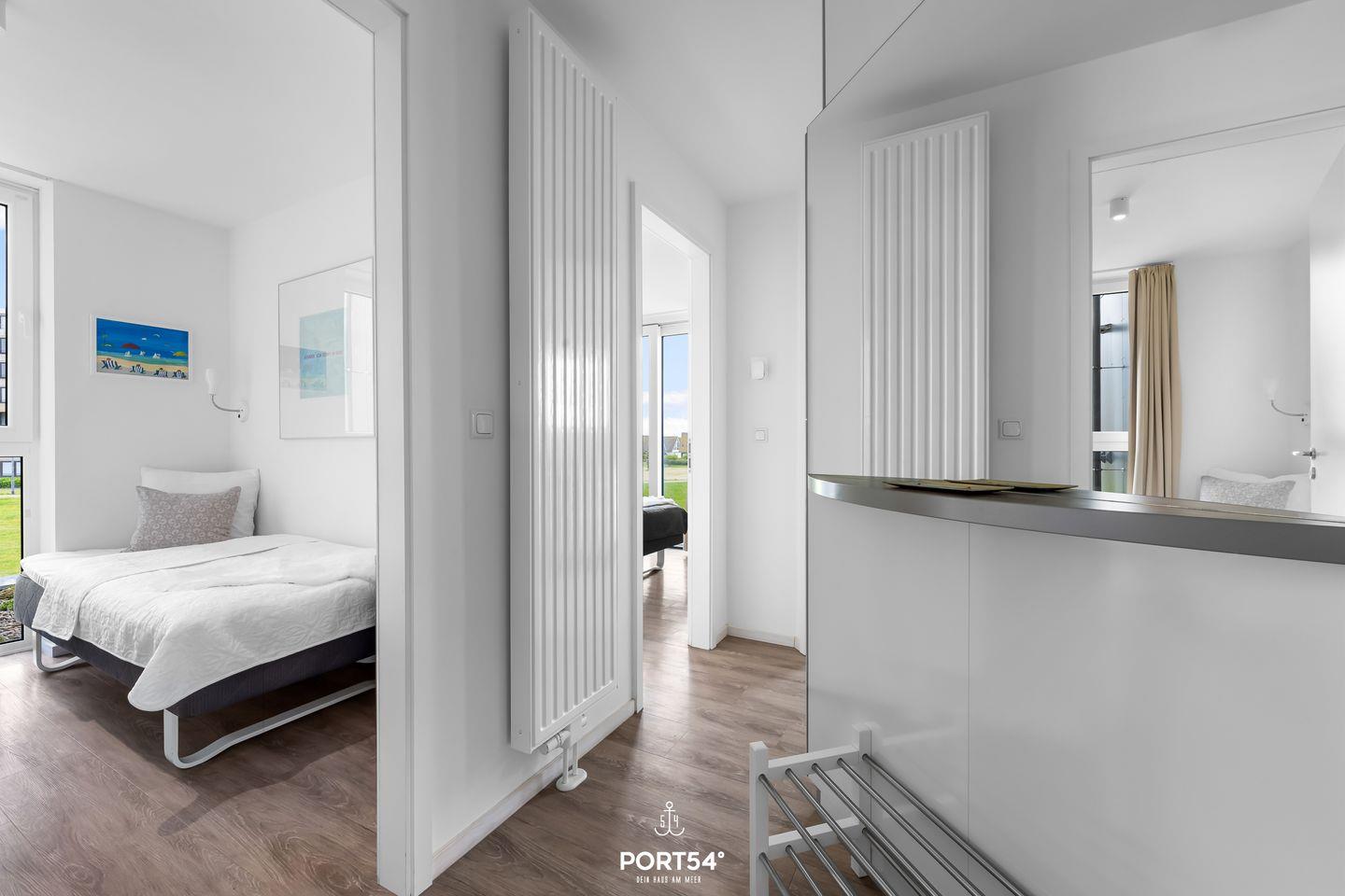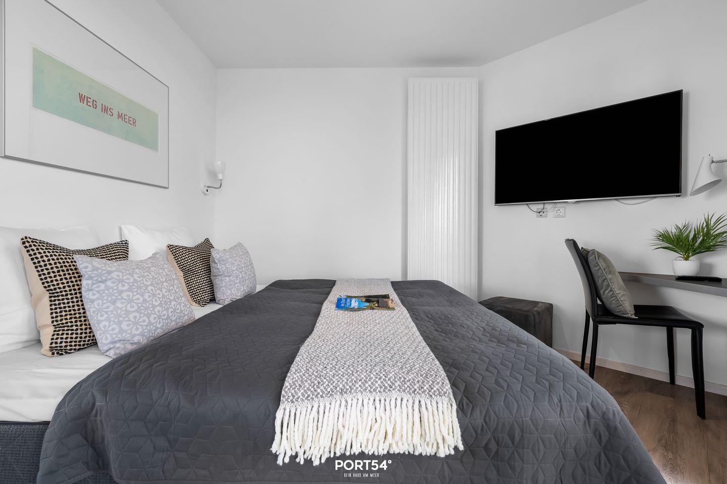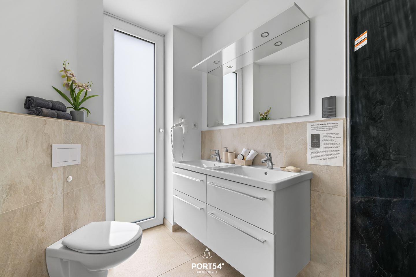 Die Ferienwohnung erstreckt sich über 4 lichtdurchflutete Zimmer, darunter 3 einladende Schlafzimmer, die mit gemütlichen Betten sowie jeweils einem Flachbild-TV ausgestattet sind und eine erholsame Nachtruhe garantieren. Das elegante Badezimmer mit einer bodengleichen Doppel-Dampfdusche, die auch als Dampfsauna genutzt werden kann und einem Föhn sorgt dafür, dass Sie nach einem langen Tag am Strand erfrischt in den Abend starten können.