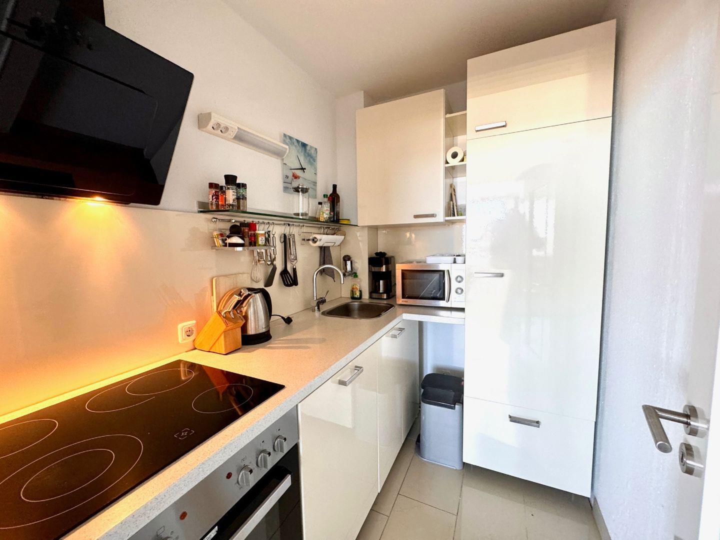 Die geschlossene, moderne Küche ist mit einem Ceranfeld, Backofen, Kühlschrank mit Gefrierfach, Spülmaschine, Mikrowelle, Wasserkocher, Kaffeemaschine, Toaster und sämtlichen Küchenutensilien ausgestattet. Auch Geschirr, Besteck und Geschirrhandtücher sind vorhanden, sodass Sie sich bequem selbst versorgen können. Im Badezimmer finden Sie eine Dusche mit Wanne, Waschbecken, WC, Haartrockner und Spiegel. Ein Rauchmelder sorgt für zusätzliche Sicherheit. Zur weiteren Ausstattung zählen kostenloses WLAN, Heizung (Elektro), Staubsauger, Sichtschutz für alle Fenster und ein Schuhschrank.