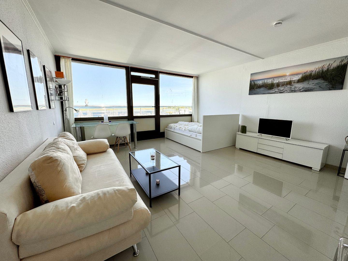 Im offenen Wohn- und Essbereich erwartet Sie eine gemütliche Sofaecke, an die sich der Esstisch anschließt. Die Fensterfront lässt viel Tageslicht herein und bietet einen herrlichen Ausblick auf die Ostsee und den Yachthafen. Vom angrenzenden Balkon aus können Sie die frische Meeresluft und das maritime Flair genießen – perfekt für einen entspannten Start in den Tag oder einen stimmungsvollen Ausklang am Abend.