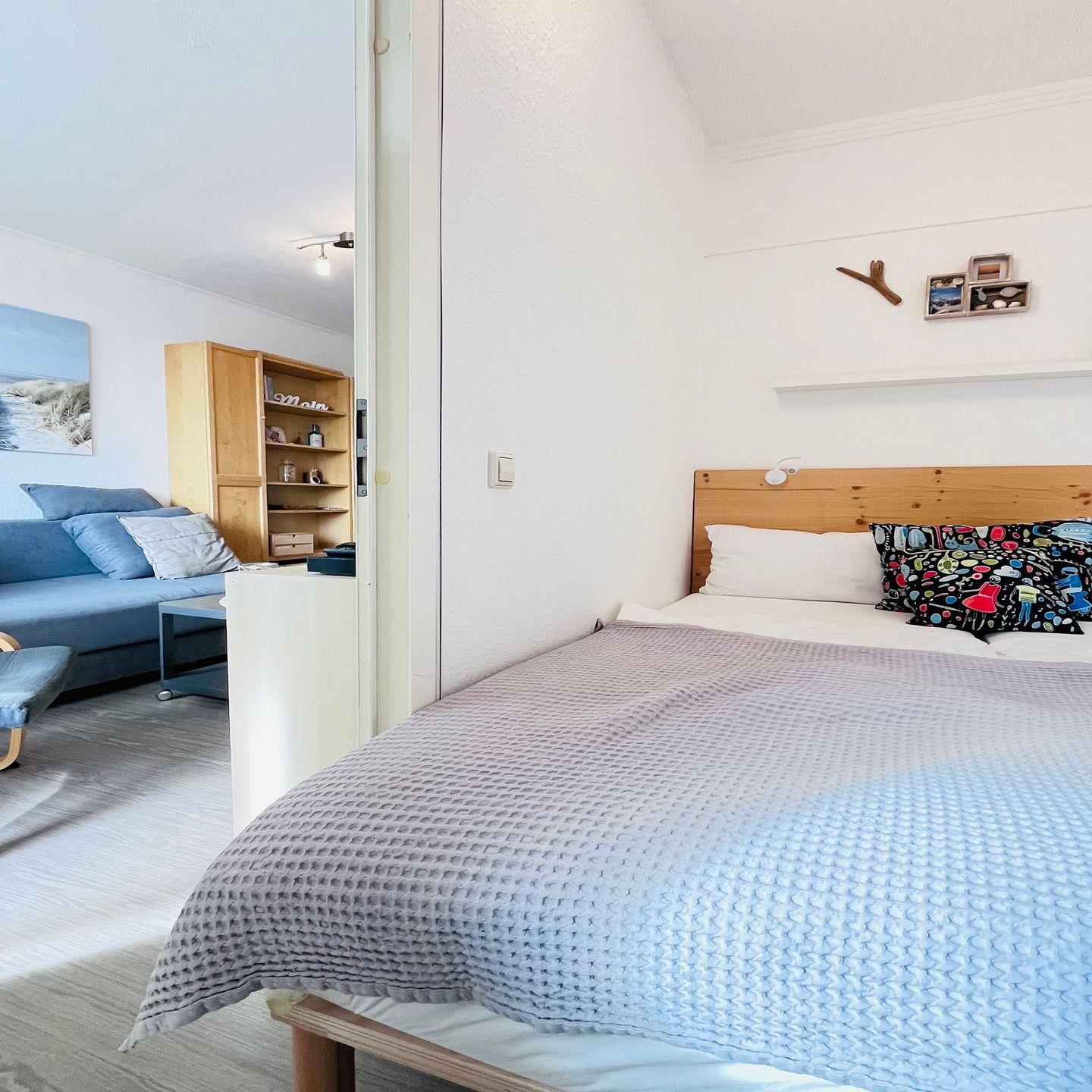Ein gemütlicher Wohnbereich mit Sitzmöglichkeiten, Schlafcouch und Fernseher. Ein separates Schlafzimmer mit einem Doppelbett (160x200 cm)