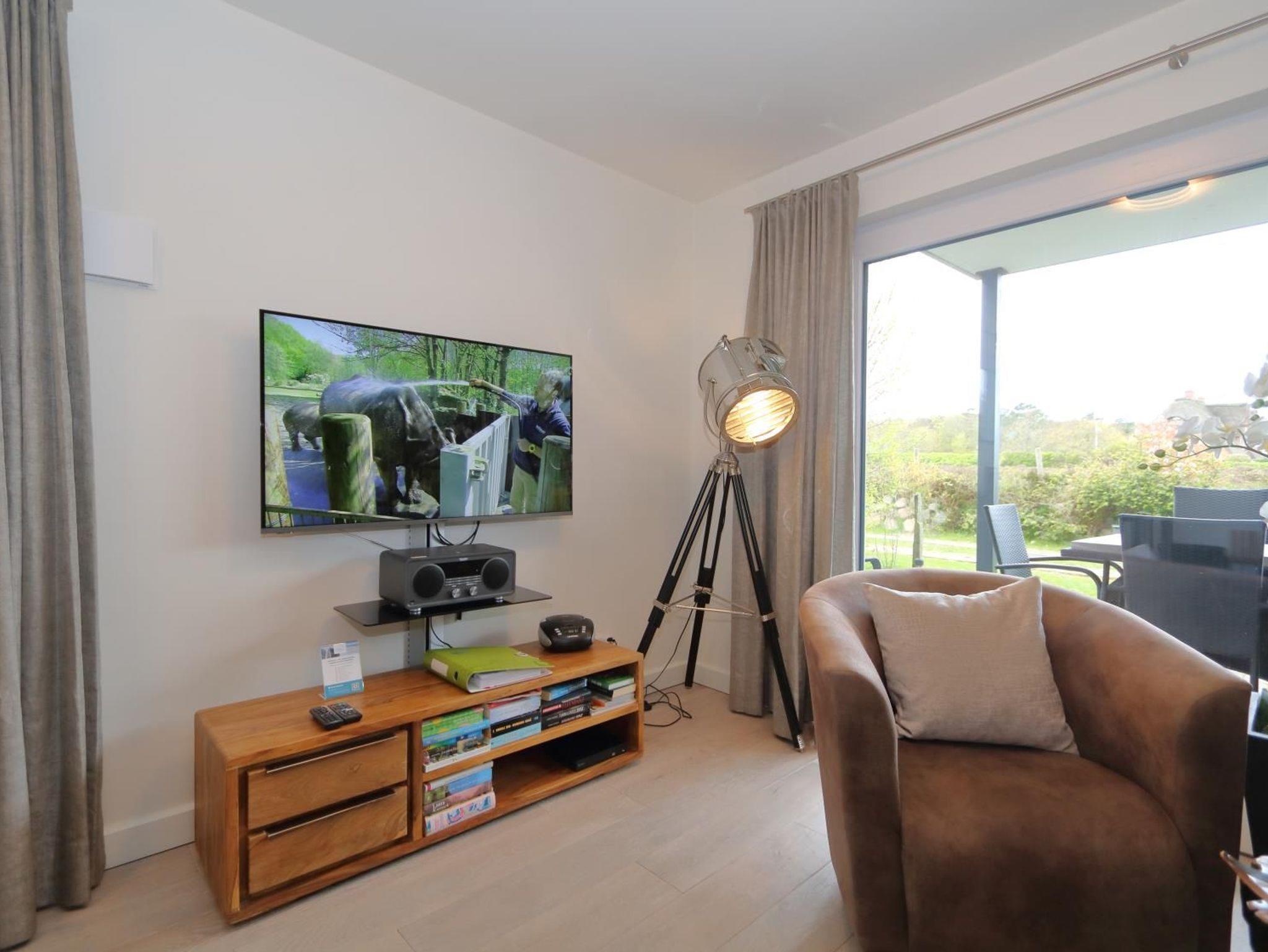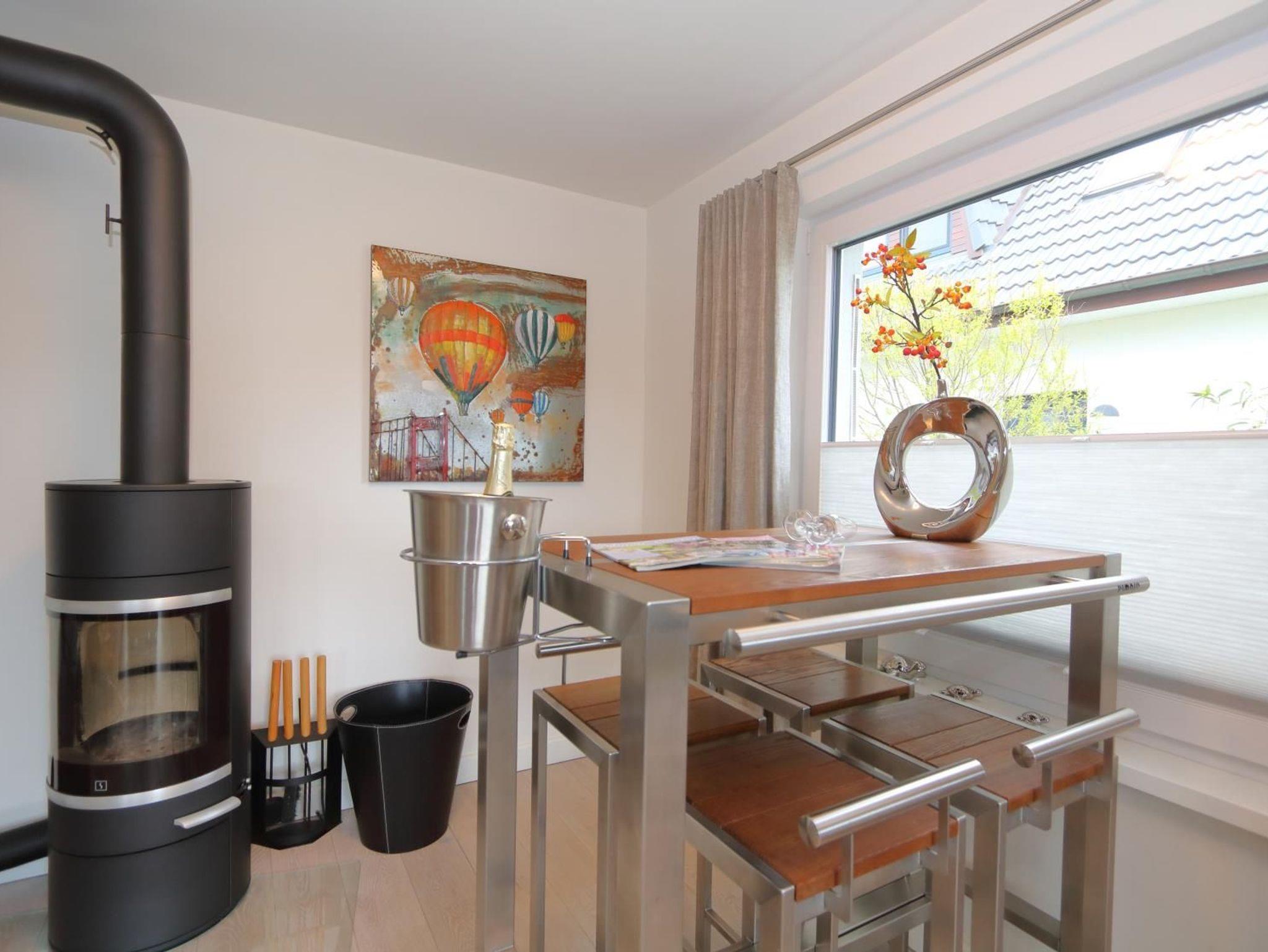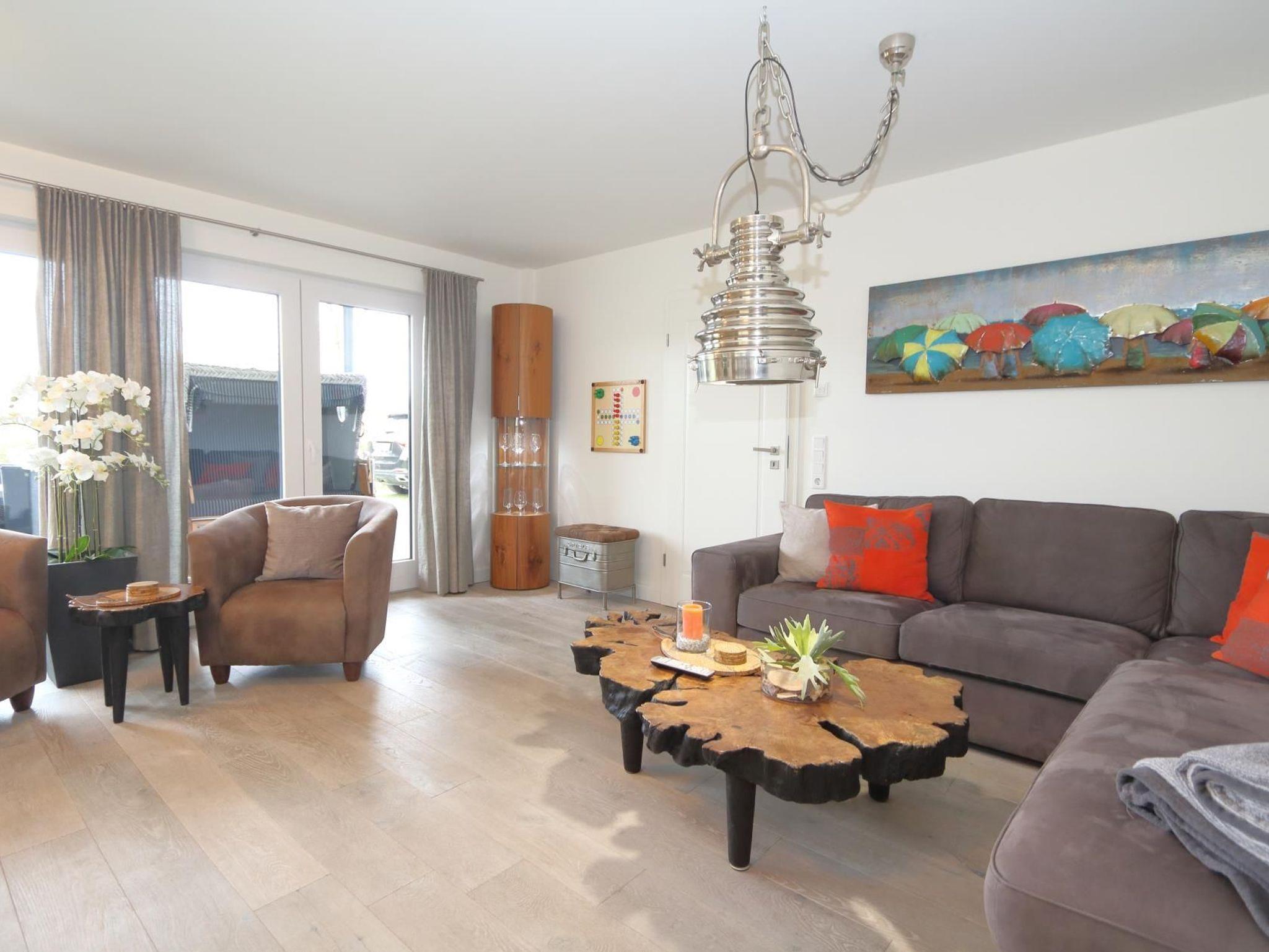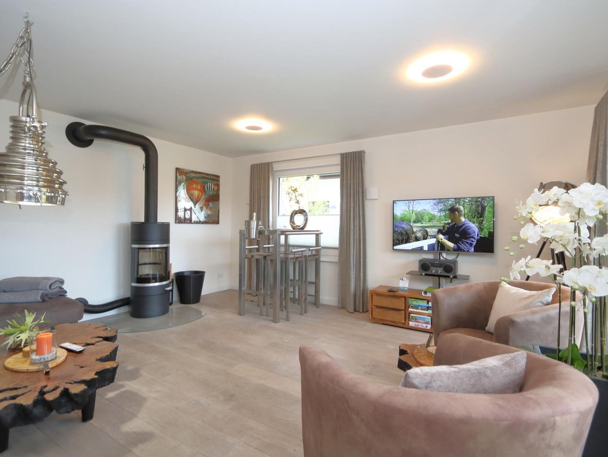 Ein helles Wohnzimmer mit großer Fensterfront zur möblierten Terrasse, Kaminofen. TV SAT/Kabel, Radio, Sofa.Bartresen.